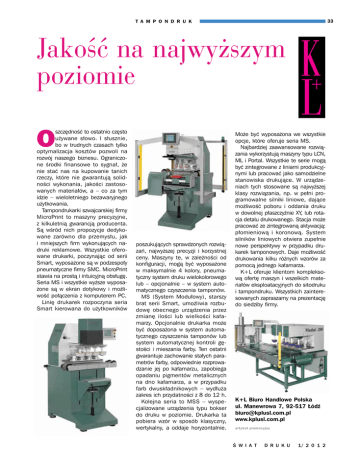 T A M P O N D R U K 33 Jakość na najwyższym poziomie O szczędność to ostatnio często używane słowo. I słusznie, bo w trudnych czasach tylko optymalizacja kosztów pozwoli na rozwój naszego biznesu. Ograniczone środki finansowe to sygnał, że nie stać nas na kupowanie tanich rzeczy, które nie gwarantują solidności wykonania, jakości zastosowanych materiałów, a – co za tym idzie – wieloletniego bezawaryjnego użytkowania. Tampondrukarki szwajcarskiej firmy MicroPrint to maszyny precyzyjne, z kilkuletnią gwarancją producenta. Są wśród nich propozycje dedykowane zarówno dla przemysłu, jak i mniejszych firm wykonujących nadruki reklamowe. Wszystkie oferowane drukarki, poczynając od serii Smart, wyposażone są w podzespoły pneumatyczne firmy SMC. MicroPrint stawia na prostą i intuicyjną obsługę. Seria MS i wszystkie wyższe wyposażone są w ekran dotykowy i możliwość połączenia z komputerem PC. Linię drukarek rozpoczyna seria Smart kierowana do użytkowników poszukujących sprawdzonych rozwiązań, najwyższej precyzji i korzystnej ceny. Maszyny te, w zależności od konfiguracji, mogą być wyposażone w maksymalnie 4 kolory, pneumatyczny system druku wielokolorowego lub – opcjonalnie – w system automatycznego czyszczenia tamponów. MS (System Modułowy), starszy brat serii Smart, umożliwia rozbudowę obecnego urządzenia przez zmianę ilości lub wielkości kałamarzy. Opcjonalnie drukarka może być doposażona w system automatycznego czyszczenia tamponów lub system automatycznej kontroli gęstości i mieszania farby. Ten ostatni gwarantuje zachowanie stałych parametrów farby, odpowiednie rozprowadzanie jej po kałamarzu, zapobiega opadaniu pigmentów metalicznych na dno kałamarza, a w przypadku farb dwuskładnikowych – wydłuża zakres ich przydatności z 8 do 12 h. Kolejna seria to MSS – wyspecjalizowane urządzenia typu bokser do druku w poziomie. Drukarka ta pobiera wzór w sposób klasyczny, wertykalny, a oddaje horyzontalnie. Może być wyposażona we wszystkie opcje, które oferuje seria MS. Najbardziej zaawansowane rozwiązania wykorzystują maszyny typu LCN, ML i Portal. Wszystkie te serie mogą być zintegrowane z liniami produkcyjnymi lub pracować jako samodzielne stanowiska drukujące. W urządzeniach tych stosowane są najwyższej klasy rozwiązania, np. w pełni programowalne silniki liniowe, dające możliwość poboru i oddania druku w dowolnej płaszczyźnie XY, lub rotacja detalu drukowanego. Stacja może pracować ze zintegrowaną aktywacją: płomieniową i koronową. System silników liniowych otwiera zupełnie nowe perspektywy w przypadku drukarek tamponowych. Daje możliwość drukowania kilku różnych wzorów za pomocą jednego kałamarza. K+L oferuje klientom kompleksową ofertę maszyn i wszelkich materiałów eksploatacyjnych do sitodruku i tampondruku. Wszystkich zainteresowanych zapraszamy na prezentację do siedziby firmy. K+L Biuro Handlowe Polska ul. Manewrowa 7, 92-517 Łódź [email protected] www.kplusl.com.pl artykuł promocyjny ś W I A T D R U K U 1/ 2 0 1 2