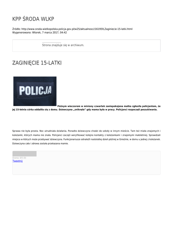KPP ŚRODA WLKP Źródło: http://www.sroda-wielkopolska.policja.gov.pl/w25/aktualnosci/161959,Zaginiecie-15-latki.html Wygenerowano: Wtorek, 7 marca 2017, 04:42 Strona znajduje się w archiwum. ZAGINIĘCIE 15-LATKI Późnym wieczorem w miniony czwartek zaniepokojona matka zgłosiła policjantom, że jej 15-letnia córka oddaliła się z domu. Dziewczyna „zniknęła” gdy mama była w pracy. Policjanci rozpoczęli poszukiwania. Sprawa nie była prosta. Noc utrudniała działania. Ponadto dziewczyna chodzi do szkoły w innym mieście. Tam też miała znajomych i koleżanki, których mama nie znała. Policjanci zaczęli weryfikować kolejno kontakty z koleżankami i znajomymi małoletniej. Sprawdzali miejsca w których może przebywać dziewczyna. Funkcjonariusze odnaleźli nastolatkę dzień później w Gnieźnie, w domu u jednej z koleżanek. Dziewczyna cała i zdrowa została przekazana mamie. Ocena: 0/5 (0) Tweetnij