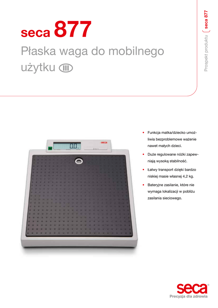 877 Płaska waga do mobilnego użytku • Funkcja matka/dziecko umoż- liwia bezproblemowe ważenie nawet małych dzieci. • Duże regulowane nóżki zapew niają wysoką stabilność. • Łatwy transport dzięki bardzo niskiej masie własnej 4,2 kg. • Bateryjne zasilanie, które nie wymaga lokalizacji w pobliżu zasilania sieciowego. Prospekt produktuseca 877 seca Prospekt produktuseca 877 seca 877: Tylko 4,2 kg. W agi, które są stosowane w medycynie do mobilnego użytku, muszą być lekkie, stabilne, łatwe do czyszczenia i wygodne. Waga seca 877 może to potwierdzić dzięki swojej lekkiej wadze własnej 4,2 kg, wytrzymałym materiałom, z których jest wykonana oraz ważnej funkcji matka/dziecko. Wyjątkowa twardość powierzchni. Stabilność na każdej powierzchni. Komfortowa obsługa. Podstawa wykonana jest z różnych materia- Cztery samopoziomujące nóżki pod podstawą Mimo integracji wyświetlacza i nawigacji z to połączenie, które gwarantuje wyjątkową nawet na trudnych podłożach. Jest to środek W celu włączenia wystarczy krótko nacisnąć łów: tworzywa sztucznego i pleksiglasu. Jest twardość powierzchni i odporność na ude- rzenia, oprócz tego, materiał można czyścić wszystkimi popularnymi środkami dezynfekcji. Aby można było ważyć osoby do 200kg, seca 877 wzmocniona jest dodatkowymi elementami stalowymi. wagi, gwarantują stabilną pozycję seca 877 za pomocą, którego zwiększa się dokładność pomiarów. Tak samo istotna jest niewielka wysokość wagi, poniżej sześciu centymetrów. Płaska konstrukcja wagi umożliwia bezproblemowe wejście na antypoślizgową powierzch- nię ważenia, również osobom z ograniczeniami ruchowymi. wagą, seca 877 można wygodnie obsługiwać. powierzchnię ważenia. Również niemowlęta i małe dzieci mogą być ważone na rękach dorosłych lub personelu medycznego. W tym celu osoba dorosła musi się wcześniej sama zważyć. Tarowanie wagi dokonywane jest za pomocą funkcji matka/dziecko, którą można włączyć jednym przyciskiem. Duży wyświetlacz ułatwia odczytywanie wyników. Szeroka i płaska budowa platformy ułatwia wejście na wagę i stabilną pozycję w czasie ważenia. seca Duże samopoziomujące nóżki w dolnej części Dane techniczne podstawy umożliwiają pewne ustawienie. • Nośność: 200 kg • Wymiary (szer. x wys. x gł.): • Funkcja włączania przez nastąpnięcie do prostego Zastrzegamy sobie prawo do zmian. rozpoczęcia ważenia. • • • • • • 201187717012 877 • Podziałka: 100 g < 150 kg > 200 g 321 x 60 x 356 mm Wymiary/platforma (szer. x wys. x gł.): 288 x 60 x 278 mm Ciężar własny: 4,2 kg Zasilanie: Baterie Opcjonalnie: wzrostomierz seca 220 Funkcje: funkcja matka/dziecko, włączanie przez nastąpnięcie, automatyczne wyłączanie Opcjonalnie: Stadiometr seca 217 w połączeniu z elementem adaptera seca 437, torba transportowa seca 414 (dla połączenia ze stadiometrem i elementem adaptera) i seca 421 Klasa dokładności: seca gmbh & co. kg • Hammer Steindamm 9 – 25 • 22089 Hamburg • Niemcy • Telefon +48 22 6570 441 • Faks +48 22 6570 426 • www.seca.com