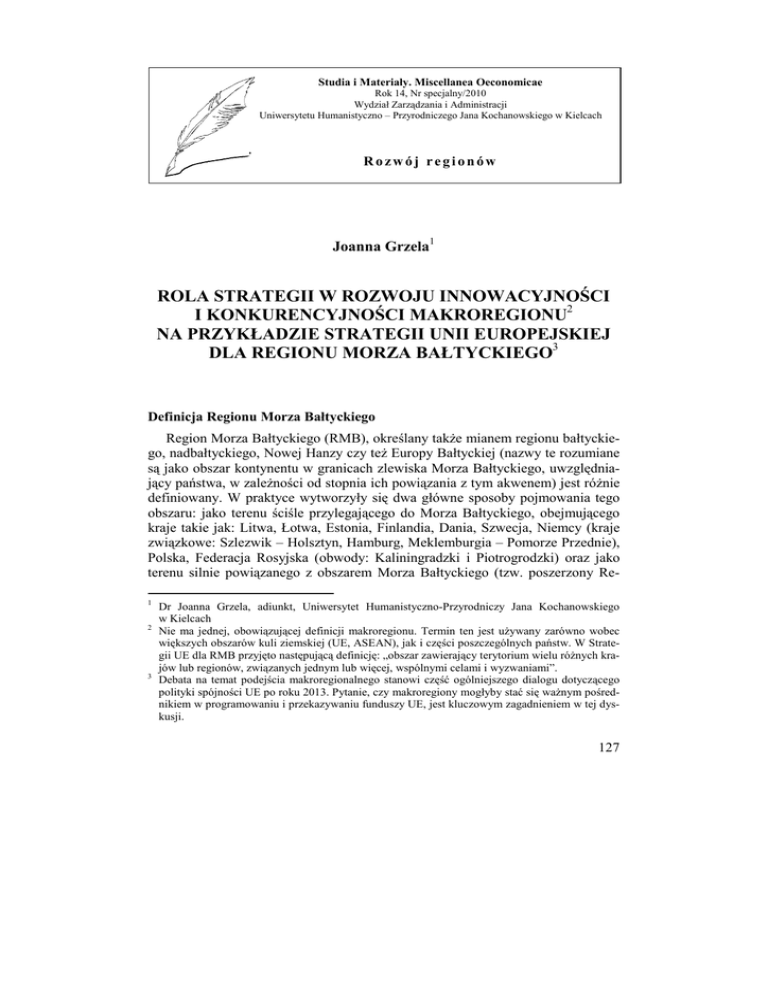 większych obszarów kuli ziemskiej (UE, ASEAN), jak i części poszczególnych państw. W Strategii UE dla RMB przyjęto następującą definicję: „obszar zawierający terytorium wielu róŜnych krajów lub regionów, związanych jednym lub więcej, wspólnymi celami i wyzwaniami”.