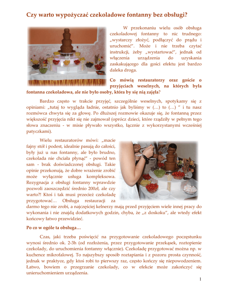 Czy warto wypożyczać czekoladowe fontanny bez obsługi? W przekonaniu wielu osób obsługa czekoladowej fontanny to nic trudnego: „wystarczy złożyć, podłączyć do prądu i uruchomić”. Może i nie trzeba czytać instrukcji, żeby „wystartować”, jednak od włączenia urządzenia do uzyskania zaskakującego dla gości efektu jest bardzo daleka droga. Co mówią restauratorzy oraz goście o przyjęciach weselnych, na których była fontanna czekoladowa, ale nie było osoby, która by się nią zajęła? Bardzo często w trakcie przyjęć, szczególnie weselnych, spotykamy się z opiniami: „tutaj to wygląda ładnie, ostatnio jak byliśmy w (…) to (…) ” i tu nasz rozmówca chwyta się za głowę. Po dłuższej rozmowie okazuje się, że fontanną przez większość przyjęcia nikt się nie zajmował (oprócz dzieci, które rządziły w pełnym tego słowa znaczeniu - w misie pływało wszystko, łącznie z wykorzystanymi wcześniej patyczkami). Wielu restauratorów mówi: „macie fajny stół i podest, idealnie pasują do całości, były już u nas fontanny, ale było brudno, czekolada nie chciała płynąć” - powód ten sam - brak doświadczonej obsługi. Takie opinie przekonują, że dobre wrażenie zrobić może wyłącznie usługa kompleksowa. Rezygnacja z obsługi fontanny wprawdzie pozwoli zaoszczędzić średnio 200zł, ale czy warto?! Ktoś i tak musi przecież czekoladę przygotować… Obsługa restauracji za darmo tego nie zrobi, a najczęściej kelnerzy mają przed przyjęciem wiele innej pracy do wykonania i nie znajdą dodatkowych godzin, chyba, że „z doskoku”, ale wtedy efekt końcowy łatwo przewidzieć. Po co w ogóle ta obsługa… Czas, jaki trzeba poświęcić na przygotowanie czekoladowego poczęstunku wynosi średnio ok. 2-3h (od rozłożenia, przez przygotowanie przekąsek, roztopienie czekolady, do uruchomienia fontanny włącznie). Czekoladę przygotować można np. w kuchence mikrofalowej. To najszybszy sposób roztapiania i z pozoru prosta czynność, jednak w praktyce, gdy ktoś robi to pierwszy raz, często kończy się niepowodzeniem. Łatwo, bowiem o przegrzanie czekolady, co w efekcie może zakończyć się unieruchomieniem urządzenia. 1 Bezpiecznej będzie przygotować czekoladę w kąpieli wodnej, ale sami tego w restauracji nie zrobimy. To sposób sprawdzający się, kiedy mamy dostęp do kuchni, a większość szanujących się lokali na tzw. ”zaplecze” nie wpuszcza nikogo spoza obsługi. Najpopularniejszym rozwiązaniem, choć czasochłonnym, jest roztapianie czekolady w misie fontanny. Trwa to od 100 do 120minut, w tym czasie obecność przy fontannie – kogokolwiek - jest konieczna niemal non stop; sukcesywnie dosypujemy pastylki, cały czas mieszając czekoladę, aby nie doszło do jej przegrzania. To jednak nie wszystko, czym musi zająć się obsługa… W trakcie przyjęcia, niezbędna jest obecność osoby, która zadba o prawidłową pracę urządzenia, a także - co bardzo ważne - o czystość. Bardzo często goście zapominają o talerzykach, serwetkach brudząc podest, naczynia i wszystko wokół. Otoczenie czekoladowej fontanny szybko zaczyna przypominać… chlewik. Niejednokrotnie zdarza się, że do misy fontanny wpadają przekąski, a wtedy czekolada zamiast płynąć – kapie. Wygląda to mało apetycznie. Czy kelner w restauracji w takiej sytuacji będzie w stanie szybko zareagować? Czy będzie wiedział, co zrobić? Czy znajdzie czas przed przyjęciem, aby uruchomić czekoladową fontannę? Jeśli tak, to obsługa nie jest Państwu potrzebna. Warto tylko wcześniej uzgodnić, czy i w jakim zakresie, restauracja weźmie na siebie odpowiedzialność za przygotowanie czekoladowej atrakcji. Podsumowując… W kompleksowej usłudze oprócz fontanny i czekolady powinien znaleźć się podświetlany podest, stół z dekoracją, jednorazowe akcesoria (serwetki, patyczki i talerzyki), szklane naczynia na przekąski i PRZEDE WSZYSTKIM osoba, która całość przygotuje, zadba o czystość otoczenia fontanny, pomoże "niewtajemniczonym" w przygotowaniu przekąsek oblanych czekoladą, a na końcu wszystko posprząta, pozostawiając wyłącznie miłe wspomnienia. Grzegorz Wojcik, www.czekoladowafontanna.org Kopiowanie i rozpowszechnianie treści artykułu w całości lub we fragmentach jest dozwolone pod warunkiem umieszczenia informacji dotyczącej źródła pochodzenia: www.czekoladowafontanna.org 2