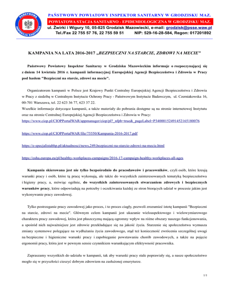 PAŃSTWOWY POWIATOWY INSPEKTOR SANITARNY W GRODZISKU MAZ. POWIATOWA STACJA SANITARNO - EPIDEMIOLOGICZNA W GRODZISKU MAZ. ul. Żwirki i Wigury 10, 05-825 Grodzisk Mazowiecki, e-mail: [email protected] Tel./Fax 22 755 57 76, 22 755 59 51 NIP: 529-16-28-584, Regon: 017201892 KAMPANIA NA LATA 2016-2017 „BEZPIECZNI NA STARCIE, ZDROWI NA MECIE" Państwowy Powiatowy Inspektor Sanitarny w Grodzisku Mazowieckim informuje o rozpoczynającej się z dniem 14 kwietnia 2016 r. kampanii informacyjnej Europejskiej Agencji Bezpieczeństwa i Zdrowia w Pracy pod hasłem "Bezpieczni na starcie, zdrowi na mecie". Organizatorem kampanii w Polsce jest Krajowy Punkt Centralny Europejskiej Agencji Bezpieczeństwa i Zdrowia w Pracy z siedzibą w Centralnym Instytucie Ochrony Pracy - Państwowym Instytucie Badawczym, ul. Czerniakowska 16, 00-701 Warszawa, tel. 22 623 36 77, 623 37 22. Wszelkie informacje dotyczące kampanii, a także materiały do pobrania dostępne są na stronie internetowej Instytutu oraz na stronie Centralnej Europejskiej Agencji Bezpieczeństwa i Zdrowia w Pracy: https://www.ciop.pl/CIOPPortalWAR/appmanager/ciop/pl?_nfpb=true&_pageLabel=P34000152491452165180076 https://www.ciop.pl/CIOPPortalWAR/file/75550/Kampania-2016-2017.pdf https://e-specjalistabhp.pl/aktualnosci/news,249,bezpieczni-na-starcie-zdrowi-na-mecie.html https://osha.europa.eu/pl/healthy-workplaces-campaigns/2016-17-campaign-healthy-workplaces-all-ages Kampania skierowana jest nie tylko bezpośrednio do pracodawców i pracowników, czyli osób, które kreują warunki pracy i osób, które tą pracę wykonują, ale także do wszystkich zainteresowanych tematyką bezpieczeństwa i higieny pracy, a, mówiąc ogólnie, do wszystkich zainteresowanych stwarzaniem zdrowych i bezpiecznych warunków pracy, które odpowiadają na potrzeby i oczekiwania każdej ze stron biorących udział w procesie jakim jest wykonywanie pracy zawodowej. Tylko postrzeganie pracy zawodowej jako proces, i to proces ciagły, pozwoli zrozumieć istotę kampanii "Bezpieczni na starcie, zdrowi na mecie". Głównym celem kampanii jest ukazanie wieloaspektowego i wielowymiarowego charakteru pracy zawodowej, która jest płaszczyzną mającą ogromny wpływ na różne obszary naszego funkcjonowania, a spośród nich najważniejsze jest zdrowie przekładające się na jakość życia. Starzenie się społeczeństwa wymusza zmiany systemowe polegające na wydłużaniu życia zawodowego, stąd też konieczność zwrócenia szczególnej uwagi na bezpieczne i higieniczne warunki pracy i zapobieganie powstawaniu chorób zawodowych, a także na pojęcie ergonomii pracy, która jest w pewnym sensie czynnikiem warunkującym efektywność pracownika. Zapraszamy wszystkich do udziału w kampanii, tak aby warunki pracy stale poprawiały się, a nasze społeczeństwo mogło się w przyszłości cieszyć dobrym zdrowiem na zasłużonej emeryturze. 1/1
