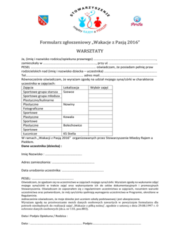 Formularz zgłoszeniowy „Wakacje z Pasją 2016” WARSZTATY Ja, (imię i nazwisko rodzica/opiekuna prawnego) …………………………………………………………………, zamieszkały w ……………..…………………………….…………, przy ul. ……………………………….………………… PESEL …………………………………………………………………… oświadczam, że posiadam pełnię praw rodzicielskich nad (imię i nazwisko dziecka – uczestnika) ……………………………………………………... Tel…………………………………………………………… adres mail…………………………………………………………… Równocześnie oświadczam, że wyrażam zgodę na udział mojego syna/córki w charakterze uczestnika w zajęciach: Zajęcia Lokalizacja Wybór zajęć Sportowe grupa starsza Szewce Sportowe grupa młodsza Plastyczno/kulinarne Plastyczne Nowiny Fotograficzne Sportowe Plastyczne Kowala Sportowe Plastyczne Bolechowice Sportowe Łucznicze KS Stella W ramach „Wakacji z Pasją 2016” organizowanych przez Stowarzyszenie Miedzy Rajem a Piekłem. Dane uczestnika (dziecka) : Imię Nazwisko : …………………………………….. Adres zamieszkania: …………………………………………… Data urodzenia uczestnika: ………………………………………….. PESEL: ………………………………………….. Oświadczam, że zgadzam się na uczestnictwo w zajęciach mojego syna/córki. Wyrażam zgodę na wykonanie zdjęć mojego syna/córki w trakcie zajęć oraz wykorzystanie ich do celów dokumentacyjnych i promocyjnych Stowarzyszenia. Oświadczam że zapoznałem się z regulaminem uczestnictwa w zajęciach, rozumiem warunki uczestnictwa oraz potwierdzam, że mój syn/córka spełniają wymagania uczestnictwa w Programie, określone w Regulaminie. Jednocześnie oświadczam, że moje dziecko jest uczniem szkoły podstawowej i jest ubezpieczone. Wyrażam zgodę na przetwarzanie moich danych osobowych zawartych w powyższym formularzu dla potrzeb niezbędnych do realizacji zajęć „Wakacje z piłką nożną”, zgodnie z ustawą z dnia 29.08.1997 r. O ochronie danych osobowych (dz.u. nr 133, poz.883). Data i Podpis Opiekuna / Rodzica : Data : ………………………………………………………….. Podpis:………………………………………………………