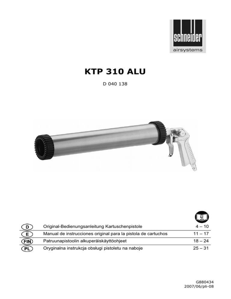KTP 310 ALU D 040 138 Original-Bedienungsanleitung Kartuschenpistole 4 – 10 Manual de instrucciones original para la pistola de cartuchos 11 – 17 Patruunapistoolin alkuperäiskäyttöohjeet 18 – 24 Oryginalna instrukcja obsáugi pistoletu na naboje 25 – 31 G880434 2007/06/pli-08 1 2 2a 2b 2c 2d KTP 310 ALU 3a 3b 4 KTP 310 ALU 3 DEUTSCH Inhalt 1. 2. 3. 4. 5. 6. 7. 8. 9. Allgemeine Hinweise ............................4 Lieferumfang.........................................4 Mitgeltende Dokumente........................4 Bestimmungsgemäße Verwendung......4 Symbole................................................5 Technische Daten.................................5 Sicherheitshinweise ..............................6 Aufbau ..................................................7 Inbetriebnahme.....................................7 9.1 Vor erster Inbetriebnahme ............7 9.2 Inbetriebnahme mit Kunststoffoder Aluminium-Kartuschen .........7 9.3 Inbetriebnahme mit Silikonpuppen8 9.4 Druckluftanschluss........................8 9.5 Betrieb ..........................................8 9.6 Nach dem Einsatz.........................8 10. Wartung ................................................9 10.1 Vor Wartungstätigkeiten ...............9 11. Außerbetriebnahme ..............................9 11.1 Lagerung ......................................9 11.2 Entsorgung ...................................9 12. Zubehör ................................................9 13. Störungsbehebung ...............................9 14. Gewährleistungsbedingungen ............10 15. Konformitätserklärung.........................10 1. Allgemeine Hinweise Prüfungen, Einstellungen und Wartungsarbeiten sollten immer von der gleichen Person oder deren Stellvertreter durchgeführt und in einem Wartungsbuch dokumentiert werden. Bei Fragen bitten wir Sie, die Artikelnummer und Bezeichnung des Gerätes anzugeben. Beachten Sie die Sicherheitshinweise! Bedienungsanleitung lesen! Der Betreiber (Besitzer / Verantwortliche) ist verpflichtet die Bedienungsanleitung zu beachten und alle Anwender dieses Gerätes gemäß der Bedienungsanleitung zu unterweisen. Die Unterweisung ist jährlich zu wiederholen. 2. x x x 3. x x 4. Lieferumfang Kartuschenpistole Garantiekarte Bedienungsanleitung Mitgeltende Dokumente Ersatzteilliste EG-Konformitätserklärung Bestimmungsgemäße Verwendung Die Kartuschenpistole Typ KPA 310 Alu ist ein handliches, druckluftbetriebenes Gerät für den handwerklichen Einsatz von Kunststoff-Kartuschen, Aluminium-Kartuschen und Silikonpuppen mit 310 ml Volumen. Sie eignet sich zum Abdichten von Fugen bei zum Beispiel Glas, Keramik, Holz, Metall, Mauerwerk und im Sanitärbereich. Jede andere Verwendung ist mit dem Hersteller abzustimmen. Wird das Gerät außerhalb von Deutschland betrieben, können andere gesetzliche Vorschriften für den Betrieb des Gerätes vorgeschrieben sein, als sie in dieser Bedienungsanleitung beschrieben sind. 4 Deutsch KTP 310 ALU 5. Symbole Achtung: Schenken Sie diesen Symbolen höchste Aufmerksamkeit! Symbol Signalwort GEFAHR WARNUNG VORSICHT HINWEIS Gefahrenstufe unmittelbar drohende Gefahr mögliche drohende Gefahr mögliche gefährliche Situation mögliche gefährliche Situation Folgen bei Nichtbeachtung Tod, schwere Körperverletzung Tod, schwere Körperverletzung Leichte Körperverletzung Sachschaden Sicherheitshinweise Symbol Bedeutung Bedienungsanleitung lesen! Symbol 6. Bedeutung Folgen bei Nichtbeachtung Körperverletzung oder Tod des Bedieners Sachschaden am Gerät falsche Bedienung des Gerätes Symbol Bedeutung Augenschutz tragen! Gerät ölen! Schutzhandschuhe tragen! Atemschutzmaske tragen! Technische Daten Luftverbrauch Maximal zulässiger Arbeitsdruck (Fließdruck) Arbeitsdruck (Fließdruck) Luftregulierung Kartuschen-, Puppengröße Kartuschenaufnahme (Durchmesser) Kartuschentyp Puppentyp mit maximal 50 mm Durchmesser Empfohlener Schlauchdurchmesser (innen) bei L= 10 m Abmessungen: Breite x Tiefe x Höhe Gewicht Benötigte Luftqualität Mindestleistungsgröße des Kompressors 100 l/min 8 bar 1-8 bar stufenlos 310 50,3 Kunststoff-Kartusche Aluminium-Kartusche z. B. Silikonpuppe 6 315 x 70 x 215 0,9 ml mm mm mm kg Gereinigt, kondensatfrei und ölfrei 110 l/min Füllleistung, 1,1 kW Motorleistung, 6 l Behältergröße Technische Änderungen vorbehalten. Abbildungen können vom Original abweichen. Stand: März 2007 KTP 310 ALU Deutsch 5 7. Sicherheitshinweise GEFAHR Gefahr schwerer Verletzung! Peitschender Druckluftschlauch beim Öffnen der Schnellkupplung. Æ Druckluftschlauch festhalten. GEFAHR Gefahr schwerer Verletzung! Æ Bei Wartungs-, Reparaturarbeiten und beim Kartuschen- oder Puppenwechsel gilt: Gerät vom Druckluftanschluss trennen, Gerät drucklos. WARNUNG Gefahr schwerer Verletzung! Aufwirbeln von Staub, Öl oder sonstigen Flüssigkeiten oder Schmutzpartikeln während des Betriebes möglich. Æ Schutzbrille tragen! WARNUNG Gefahr schwerer Verletzung! Æ Kartuschenpistole nie gegen Personen, sich selbst oder Tiere richten WARNUNG Explosionsgefahr! Lebensgefahr! Æ Gerät nicht in explosionsgefährdeten Bereichen oder Atmosphären einsetzen! Æ Maximal zulässigen Druck beachten! WARNUNG Gefahr schwerer Verletzung! Bei der Verarbeitung von Dichtstoffen auf Silikon- und Acrylatbasis können Gefahrstoffe freigesetzt werden. VORSICHT Gefahr Verletzung! Stolperfalle! Druckluftschläuche, die über den Boden geführt werden. Æ Vermeiden bzw. beachten. VORSICHT Gefahr Verletzung Kartusche kann aus der Kartuschenpistole herausschießen, wenn die Kartuschenpistole ohne Überwurfmutter (Pos. 01) betrieben wird. Æ Kartuschenpistole immer mit Überwurfmutter (Pos. 01) betreiben. x x x x x x x Ænur in gut belüfteten Räumen arbeiten! Æ gegebenenfalls Atemschutzmaske tragen! 6 Deutsch x Schützen Sie sich, andere Personen, Sachgegenstände und ihre Umwelt durch die jeweils notwendigen Schutzmaßnahmen oder Vorkehrungen um Gesundheits-, Sach-, Wert- oder Umweltschä