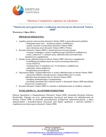 Meritum Competence zaprasza na szkolenie: "Skuteczne przygotowanie i realizacja inwestycji na obszarach Natura 2000" Warszawa, 3 lipca 2014 r. PROGRAM SZKOLENIA: 1. Aspekty prawne umocowania obszarów Natura 2000 w prawodawstwie polskim: - funkcjonowanie sieci – dyrektywa ptasia i siedliskowa, - zasady i kryteria wyznaczania obszarów Natura 2000, - stan wdrożenia sieci obszarów Natura 2000 w Polsce. 2. Kwestia obszarów Natura 2000 w ramach procesu inwestycyjnego: - wymogi wynikające z prawa wspólnotowego (dyrektywa siedliskowa), - ocena „naturowa” w ramach oceny oddziaływania na środowisko (podstawowe zagadnienia). 3. Zasady oceny oddziaływania na obszar Natura 2000 i kluczowe zagadnienia: - kwalifikacja przedsięwzięcia do oceny (screening naturowy), - ocena właściwa, - wariantowanie w kontekście art. 6.4 dyrektywy siedliskowej, - nadrzędny interes publiczny, - kompensacja przyrodnicza. 4. Najczęstsze błędy i nieprawidłowości w ocenie oddziaływania na obszar Natura 2000: - omówienie błędów metodycznych i nieprawidłowości w ocenie oddziaływania przedsięwzięć na obszary Natura 2000, - działania minimalizujące a kompensacja, - przykłady przedsięwzięć realizowanych w obszarach Natura 2000 (przykłady pozytywne i negatywne). 5. Kwestia obszarów Natura 2000 we wniosku o dofinansowanie ze środków unijnych. WYKŁADOWCA: SŁAWOMIR WODZYŃSKI Główny Specjalista w Departamencie Obszarów Natura 2000, Generalna Dyrekcja Ochrony Środowiska. Zajmuje się m.in. opiniowaniem inwestycji pod kątem ich oddziaływania na obszary Natura 2000 na potrzeby prowadzonych postępowań administracyjnych, a także opiniowaniem i konsultowaniem inwestycji pod kątem zgodności z prawem polskim i wspólnotowym dotyczącym obszarów Natura 2000. Meritum Competence ul. Syta 135, 02-987 Warszawa NIP 5262737394 [email protected], [email protected], [email protected] www.szkolenia.meritumnet.pl LOKALIZACJA: Warszawa, Centrum Konferencyjne Golden Floor, budynek Millenium Plaza, al. Jerozolimskie 123A (samo centrum Warszawy, 600 m od dworca centralnego). Szczegółowe informacje prześlemy na kilka dni przed szkoleniem. TERMIN: 3 lipca 2014 r., zajęcia odbywają się w godzinach 9.30 - 16.00 KOSZT: 500 PLN netto (+ 23% VAT) za osobę Szkolenie ma charakter usługi kształcenia zawodowego. Dla instytucji zaświadczających, że szkolenie finansowane jest ze środków publicznych (w całości bądź minimum w 70%) zastosujemy stawkę VAT zw. W KOSZT SZKOLENIA WCHODZĄ: Wykłady, Materiały szkoleniowe, Zaświadczenia uczestnictwa, Obiad, Serwis kawowy. Formularz zgłoszeniowy jest również dostępny na stronie internetowej pod adresem: www.szkolenia.meritumnet.pl w menu po lewej stronie, w zakładce: Szkolenia. Formularze zgłoszeniowe prosimy przesyłać e-mailem na adres: [email protected] lub faxem na numer: 0 22 631 07 19, tel. 728 956 434, 784 299 914 Zasady uczestnictwa: Fakturę VAT otrzymają Państwo w sposób zgodny z zaznaczonym wyborem na formularzu zgłoszeniowym. Wpłaty prosimy kierować na konto: Meritum Competence ul. Syta 135 02-987 Warszawa o numerze: 41103000190109853000352077 W tytule przelewu prosimy o wpisanie: "NATURA 03.VII.2014", oraz nazwiska uczestnika(ów). Prosimy nie zapomnieć o konieczności podania następujących danych na formularzu zgłoszeniowym: nazwa firmy, adres firmy i jej numer NIP, w celu otrzymania właściwej faktury. Przesłanie wypełnionego formularza jest równoznaczne z przyjęciem zobowiązania płatności. Rezygnacja ze szkolenia jest możliwa najpóźniej na 3 dni robocze przed datą rozpoczęcia szkolenia. W przypadku powiadomienia na mniej niż 3 dni robocze, Zleceniodawca ponosi pełne koszty szkolenia.