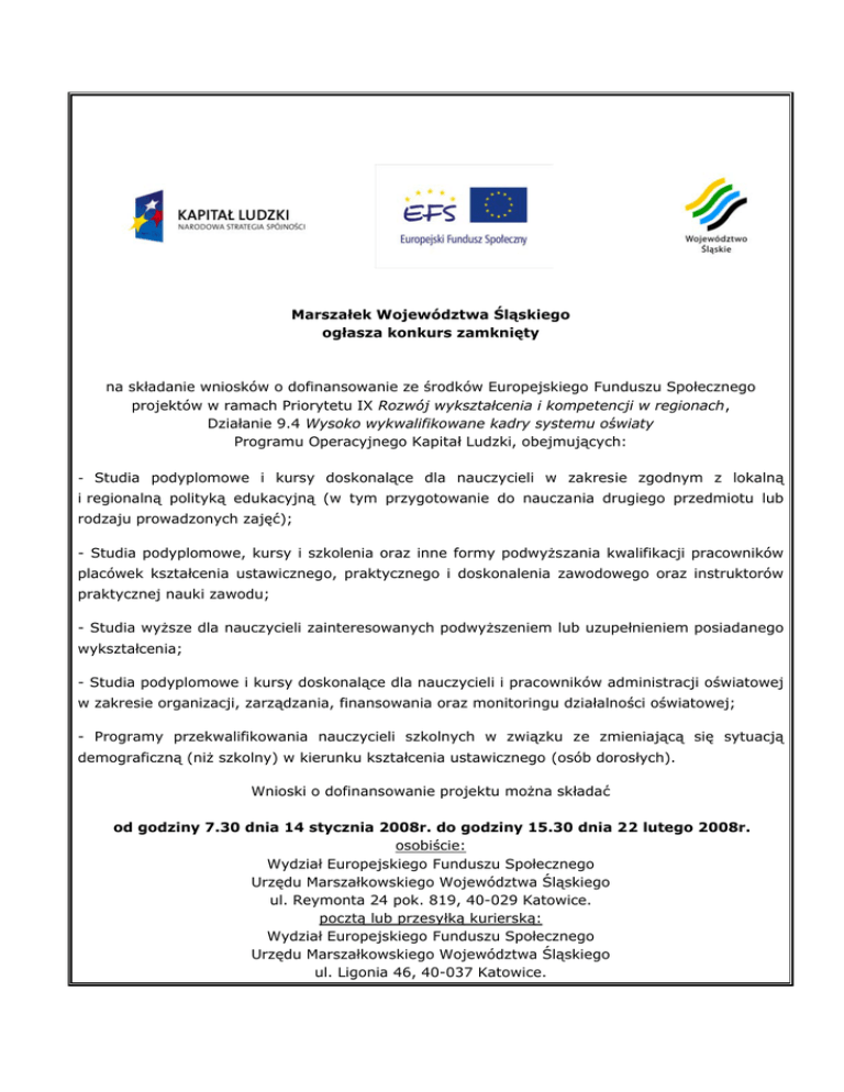 Marszałek Województwa Śląskiego ogłasza konkurs zamknięty na składanie wniosków o dofinansowanie ze środków Europejskiego Funduszu Społecznego projektów w ramach Priorytetu IX Rozwój wykształcenia i kompetencji w regionach, Działanie 9.4 Wysoko wykwalifikowane kadry systemu oświaty Programu Operacyjnego Kapitał Ludzki, obejmujących: - Studia podyplomowe i kursy doskonalące dla nauczycieli w zakresie zgodnym z lokalną i regionalną polityką edukacyjną (w tym przygotowanie do nauczania drugiego przedmiotu lub rodzaju prowadzonych zajęć); - Studia podyplomowe, kursy i szkolenia oraz inne formy podwyższania kwalifikacji pracowników placówek kształcenia ustawicznego, praktycznego i doskonalenia zawodowego oraz instruktorów praktycznej nauki zawodu; - Studia wyższe dla nauczycieli zainteresowanych podwyższeniem lub uzupełnieniem posiadanego wykształcenia; - Studia podyplomowe i kursy doskonalące dla nauczycieli i pracowników administracji oświatowej w zakresie organizacji, zarządzania, finansowania oraz monitoringu działalności oświatowej; - Programy przekwalifikowania nauczycieli szkolnych w związku ze zmieniającą się sytuacją demograficzną (niż szkolny) w kierunku kształcenia ustawicznego (osób dorosłych). Wnioski o dofinansowanie projektu można składać od godziny 7.30 dnia 14 stycznia 2008r. do godziny 15.30 dnia 22 lutego 2008r. osobiście: Wydział Europejskiego Funduszu Społecznego Urzędu Marszałkowskiego Województwa Śląskiego ul. Reymonta 24 pok. 819, 40-029 Katowice. pocztą lub przesyłką kurierską: Wydział Europejskiego Funduszu Społecznego Urzędu Marszałkowskiego Województwa Śląskiego ul. Ligonia 46, 40-037 Katowice. Decyduje data wpływu wniosku do Instytucji Organizującej Konkurs. Wniosek należy złożyć w zaklejonej kopercie, która musi: − być opatrzona sformułowaniem: „Konkurs numer 1/POKL/9.4/2008 w ramach Działania 9.4 Wysoko wykwalifikowane kadry systemu oświaty”; − zawierać pełną nazwę wnioskodawcy oraz jego adres wraz z nr faksu; − zawierać tytuł projektu; − zawierać adnotację „nie otwierać”. Dokumentacja konkursowa, wzór wniosku o dofinansowanie, oraz wzór umowy o dofinansowanie projektu są dostępne w siedzibie Wydziału Europejskiego Funduszu Społecznego Urzędu Marszałkowskiego Województwa Śląskiego ul. Reymonta 24 pok. 819, 40-029 Katowice. oraz na stronie internetowej www.efs.silesia-region.pl Generator Wniosków Aplikacyjnych jest dostępny na stronie internetowej http://www.generatorwnioskow.efs.gov.pl/GeneratorWnioskow/ Kryteria wyboru projektów zostały określone w Załączniku nr 1 do Uchwały nr 18 Prekomitetu Monitorującego PO Kapitał Ludzki z dnia 18 września 2007 r. w sprawie zaopiniowania ogólnych i szczegółowych kryteriów wyboru projektów w ramach PO Kapitał Ludzki i są dostępne na stronie internetowej http://www.funduszestrukturalne.gov.pl/NSS/programy/krajowe/pokl/komitet/ O dofinansowanie mogą występować wszystkie podmioty, które spełniają kryteria określone w dokumentacji konkursowej, z wyłączeniem podmiotów określonych w art. 211 ustawy z dnia 30 czerwca 2005 r. o finansach publicznych (Dz. U. Nr 249, poz. 2104 z późn. zm.). Na realizację projektów wyłonionych do dofinansowania w ramach konkursu dostępna jest kwota 5 648 259,00 zł, Minimalna wartość projektu to 50 000,00 zł. poziom dofinansowania wynosi 85,00% (wsparcie Europejskiego Funduszu Społecznego) wymagany wkład własny pochodzący z budżetu jednostek samorządu terytorialnego szczebla lokalnego to 15,00% Wydział Europejskiego Funduszu Społecznego Urzędu Marszałkowskiego Województwa Śląskiego informuje, że zgodnie z Wytycznymi Ministerstwa Rozwoju Regionalnego „Zasady dokonywania wyboru projektów w ramach Programu Operacyjnego Kapitał Ludzki 2007-2013” z dnia 10 września 2007 r. Instytucja Organizująca Konkurs, w ciągu 45 dni roboczych od daty zamknięcia konkursu, wystosuje wnioskodawcom pismo informujące o wynikach konkursu. Dodatkowe informacje można uzyskać w Wydziale Europejskiego Funduszu Społecznego Urzędu Marszałkowskiego Województwa Śląskiego Referat Wyboru Projektów EFS ul. Reymonta 24 pok. 819, 40-029 Katowice, tel. (32) 608 05 41, 203 01 72, [email protected]