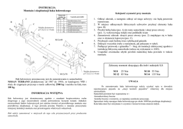 INSTRUKCJA MontaŜu i eksploatacji haka holowniczego Kolejność czynności przy montaŜu 2 B C Tulejka dystansowa φ17.2x2,3; L=8 mm. Oznaczenie zacisku wg ISO PN 1 L 2 + 3 31 4 R 5 58R 6 54 7 58L Łączenie przewodów Kierunkowskazy lewe Tylne światła przeciwmgłowe Masa Kierunkowskazy prawe Światła pozycyjne prawe Światła hamowania Światła pozycyjne lewe M12x40 1 B A C 1. Odkręć zderzak, a następnie odkręć od niego uchwyty- nie będą ponownie montowane. 2. W miejsce odkręconych fabrycznych uchwytów przykręć elementy haka (poz. B) 3. PrzyłóŜ belkę haka (poz. A) do ramy samochodu i skręć przez otwory (poz. 1), wykorzystując tulejki oraz podkładki ścięte 4. Zamontować zderzak- skręcić przez otwory (poz. 2) znajdujące się w haku oraz w elemencie kątowym (poz. C). 5. Przykręcić część kulistą wraz z płytką pod gniazdo. 6. Dokręcić wszystkie śruby z momentem, jak pokazano w tabeli. 7. Podłączyć przewody z gniazdka 7 – bieg. do instalacji elektrycznej zgodnie z instrukcją fabryczną samochodu (zaleca się wykonanie w ASO). 8. Uzupełnić ewentualne ubytki powłoki malarskiej haka powstałe w trakcie montaŜu. 1 Zalecany moment skręcający dla śrub i nakrętek 8,8: M12x70 2 Tulejka dystansowa φ17.2x2,3; L=8 mm Hak holowniczy przeznaczony jest do zamontowania w samochodzie: NISSAN TERRANO produkowany od 1987 do 1993r, nr katalogowy V53 i słuŜy do ciągnięcia przyczep o masie całkowitej 2500 kg i nacisku na kulę max 100 kg. INFORMACJA WSTĘPNA Hak holowniczy jest skonstruowany zgodnie z zasadami bezpieczeństwa ruchu drogowego a jego niezawodność została potwierdzona licznymi testami. JednakŜe niezawodność haków holowniczych jest zaleŜna równieŜ od prawidłowego montaŜu oraz prawidłowej eksploatacji. Z tego powodu prosimy Państwa o staranne przeczytanie niniejszej instrukcji montaŜu oraz przestrzeganie właściwych wskazówek. Hak naleŜy zamontować w miejscach do tego celu przeznaczonych przez producenta samochodu. M 8 25 Nm M 12 85 Nm M 10 55 Nm M 14 135 Nm UWAGA Po zamontowaniu haka holowniczego naleŜy uzyskać wpis w dowodzie rejestracyjnym pojazdu na „stacji kontroli pojazdów” właściwej dla miejsca zamieszkania. Samochód powinien być wyposaŜony w : -kierunkowskazy boczne -lusterka boczne o rozstawie, co najmniej szerokości przyczepy. Sprawdzać śruby mocujące haka holowniczego po około 1000 km przebiegu eksploatacji. Kula haka musi być utrzymana w czystości i konserwowana smarem stałym . PPUH AUTO-HAK S.J. KARTA GWARANCYJNA Produkcja Zaczepów Kulowych Henryk & Zbigniew Nejman 76-200 SŁUPSK ul. Słoneczna 16K tel/fax (059) 8-414-414; 8-414-413 E-mail: [email protected] www.autohak.com.pl Producent udziela gwarancji niniejszą kartą gwarancyjną na okres 24 miesięcy licząc od dnia zakupu haka holowniczego do samochodu: NISSAN TERRANO I produkowanego od 1987 r. do 1993 r. Zaczep kulowy bez wyposaŜenia elektrycznego Data produkcji .............................. Data zakupu................................... Klasa: A50-X Nr kat. V53 Przeznaczony do zamontowania w samochodzie: Producent: NISSAN Model: TERRANO I Typ: 3/5 drz. produkowanym od 1987r. do 1993r. Gwarancja odnosi się do wad ukrytych wynikających z niezgodności z aktualnie zobowiązującymi normami a zwłaszcza ze złej konstrukcji, zastosowania wadliwych materiałów itp. Gwarancja nie obejmuje natomiast uszkodzeń zawinionych przez nabywcę, a zwłaszcza na skutek nieprzestrzegania zasad konserwacji i uŜytkowania powstałych w czasie przewozów dokonanych przez nabywcę. Reklamacje naleŜy zgłaszać w punkcie sprzedaŜy, składając jednocześnie kartę gwarancyjną. Usunięcie "wady" następuje po stwierdzeniu przez punkt sprzedaŜy wspólnie z producentem słuszności złoŜonej reklamacji. Reklamacja powinna być załatwiona w ciągu czternastu dni od dnia uznania reklamacji. Karta gwarancyjna jest niewaŜna, jeŜeli nie jest wypełniona i podpisana. Data zgłoszenia reklamacji: ................................................................... Dane techniczne: wartość siły D: 11,75 kN maksymalna masa przyczepy: 2500 kg maksymalny nacisk na kulę: 100 kg Numer homologacji zgodnie z dyrektywą 94/20/WE: INFORMACJA WSTĘPNA Zaczep kulowy jest skonstruowany zgodnie z zasadami bezpieczeństwa ruchu drogowego. Zaczep kulowy jest elementem wpływającym na bezpieczeństwo jazdy i moŜe zostać zainstalowany wyłącznie przez personel wyspecjalizowany. Niedopuszczalne jest dokonywanie jakichkolwiek zmian w konstrukcji zaczepu. Powoduje to wygaśniecie dopuszczenia do stosowania. W przypadku obecności masy izolacyjnej lub osłony podwozia w miejscu przylegania zaczepu, naleŜy ją usunąć. Nieosłonięte miejsca karoserii oraz wywiercone otwory naleŜy pomalować farbą antykorozyjną. Informacjami wiąŜącymi odnośnie wartości obciąŜeń są dane podawane przez producenta samochodu, względnie wartości maksymalnej masy przyczepy oraz maksymalnego nacisku na kulę, przy czym wartości parametrów zaczepu kulowego nie mogą być przekroczone. Wzór do obliczania wartości siły D: Maks. masa przyczepy [kg] x Maks. masa samochodu [kg] Maks. masa przyczepy [kg] + Maks. masa samochodu [kg] X 9,81 = 1000 D [kN]