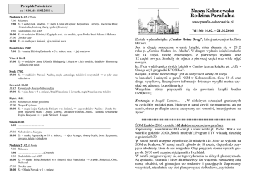 Porządek Nabożeństw od 14.02. do 21.02.2016 r. Niedziela 14.02. I Postu 7:00 Różaniec 7:30 Za + Zofię z ok. urodzin, ++ męża Leona ich synów Bogusława i Jerzego, rodziców Różę i Franciszka, bratową Marię i pokr. (Deutsch) 9:30 Godzinki ku czci NMP 10:00 Za ++ rodziców Elżbietę i Zygfryda z ok. ich urodzin, syna Pawła, braci Adama i Huberta 17:00 Gorzkie żale 18:00 Za ++ matkę w r. śmierci, ojca, teścia i pokr. Poniedziałek 15.02. 7:00 Za + matkę Elżbietę Bednarek w 5 r. śmierci oraz ++ jej rodziców Wtorek 16.02. 17:00 Za ++ rodziców Annę i Józefa, Hildegardę i Józefa w r. ich urodzin, dziadków Florentynę i Juliusza oraz pokr. Środa 17.02. 17:00 Za ++ rodziców Pawła i Paulinę, męża Antoniego, teściów i wszystkich ++ z pokr oraz rodzeństwo Czwartek 18.02. 16:45 Koronka do Bożego Miłosierdzia 17:00 Za + ojca Jana w 3 r. śmierci, braci Franciszka i Edwarda, męża Marcina oraz teściów Piątek 19.02. 16:30 Różaniec za młode pokolenie 17:00 Droga Krzyżowa 18:00 Za + męża i ojca Gerharda Steinert w r. śmierci, ++ jego rodziców Paulinę i Józefa Steinert, rodziców Marię i Józefa Kopyto, szwagrów Ernesta, Józefa, Teodora, szwagierkę Reginę Kosytorz, ++ z pokr. Steinert i Kopyto Sobota 20.02. 8:00 ………………………... ——————————————————————————————————————— 17:30 Nabożeństwo Maryjne 18:00 Za + matkę Agnieszkę w 16 r. śmierci, ++ ojca Jerzego, siostrę Otylię, brata Zygmunta, szwagra, teścia i dziadków Niedziela 21.02. II Postu 7:00 Różaniec 7:30 ………………………..(Deutsch) 9:30 Godzinki ku czci NMP 10:00 Za ++ matkę Różę Smieskol w r. śmierci, ojca Franciszka, ++ z pokr. Smieskol, Obst, Wałaszek 17:00 Gorzkie żale 18:00 Za + Marię Nowak w 1 r. śmierci Nasza Kolonowska Rodzina Parafialna www.parafia-kolonowskie.pl 7(1156) 14.02. – 21.02.2016 Została wydana książka „Camino Różne Drogi”, której autorem jest ks. Piotr Bekierz. Jest to drugie poszerzone wydanie książki, która ukazała się w 2012 roku pt. „Camino Śladami św. Jakuba”. W drugim wydaniu książki znalazło się 14 części, trochę zmienionych, z pierwszego wydania oraz 12 części nowych. Znalazły się zdjęcia z pierwszej części oraz wiele zdjęć nowych. ks. Piotr wydał oprócz dwóch książek o Camino jeszcze książkę pt. „Alfa Omega czyli przypadki KTOSIKA”. Książka „Camino Różne Drogi” jest do nabycia od soboty 20 lutego w kancelarii i zakrystii w parafii NSM w Kolonowskiem. Cena 10 zł. oraz drogą wysyłkową. Szczegółowe informacje dotyczące wysyłki można uzyskać pod adresem: [email protected] Wszystkim którzy przyczynili się do powstania książki bardzo DZIĘKUJĘ! Sentencja: z książki Camino... - „W niektórych sytuacjach granicznych w życiu Bóg ma jakiś plan. Może go w danej chwili nie rozumiemy, ale po czasie, nieraz po długim czasie, zaczynamy coś rozumieć, inaczej patrzeć na życie”. ******************************************************** ŚDM Kraków 2016 - zostało 162 dni do rozpoczęcia w parafiach Zapraszamy: www.krakow2016.com.pl i www.botafe.pl; Radio DOXA we wtorki o godzinie 20:00 „Strefa młodych”; Program I TV w każdą niedzielę o godzinie 8:30. W naszej parafii wstępnie zgłosiło się 20 młodych i ks. Piotr do wyjazdu na ŚDM do Krakowa. W naszej parafii zgłosiło się 18 rodzin, chętnych do przyjęcia młodzieży, która do nas przyjedzie. Chęć przyjazdu do nas wyraziła grupa ok. 20/30 osób z partnerskiej parafii z Hochdahl. W parafii przygotowujemy się do tego wydarzenia na różnych płaszczyznach. Są spotkania, czuwania i Msze dla młodzieży. Do włączenia zapraszamy całą naszą młodzież, od gimnazjum do studentów i pracujących. Zapraszamy wszystkich, niezależnie czy ktoś planuje wyjazd do Krakowa, czy też nie. 7/2016 Kalendarz ŚDM: podczas Rekolekcji przedstawiciele młodych, osobiście prosili osoby chore i starsze o modlitwę w int. ŚDM. 19.02. piątek – spotkanie w salce młodzieży z III klasy gimnazjum 27.02. sobota - „MARSZ DOBRZE ZAKRĘCONYCH ŚDM” ulicami parafii. Zbiórka o 19:00 przy plebanii. Ubiór kolorowy oraz w ręku jakiś instrument (gwizdki, pokrywki). Zakończenie po 21.00 ogniskiem z poczęstunkiem. 28.02. niedziela – po Mszach sprzedaż „KREMÓWEK ŚDM”. Zyski przeznaczamy na wyjazd do Krakowa. O godz. 10:00 Msza św. w int. naszej młodzieży i przygotowań do ŚDM 11.03. piątek - Msza św. dla młodzieży 18.03. piątek – Droga Krzyżowa ulicami parafii 19.03. sobota - Prolog ŚDM w Opolu 22.03. wtorek – Sakrament Pokuty 26.03. Wielka Sobota – możliwość nabycia od młodzieży „BABECZKI i KROSZONKI ŚDM” 08.04. piątek – spotkanie młodzieży gimnazjum 15.04. piątek – spotkanie wyjeżdżających do Krakowa 17.04. niedziela – możliwość nabycia „RÓŻAŃCÓW – KORALIKÓW” wykonanych ręcznie przez siostry karmelitanki i młodzież 30.04. sobota – Czuwanie młodzieży diecezji w Jemielnicy 06.05. piątek – wspólna „RADOSNA MODLITWA dzieci i młodzieży” 26.05. Boże Ciało – Spotkanie młodzieży w ogrodzie parafii 27 – 29.05. - Prolog ŚDM na Górze św. Anny 30.05. wtorek – Sakrament Bierzmowania 05.06. niedziela – Odpust NSM 10.06. piątek – czuwanie młodzieży 03.07. niedziela – OFIARA do puszek na wyjazd młodzieży do Krakowa 20 - 25.07.– ŚDM w parafii 25 – 31.07. - ŚDM w Krakowie Zapraszamy: Zostań „PRZYJACIELEM ŚDM”. Ofiaruj w tej intencji swoje modlitwy. Komunię św. Ofiaruj swoje cierpienia, choroby duchowe i fizyczne. Możesz wesprzeć finansowo wyjazd naszej młodzieży do Krakowa, przez zakup rzeczy proponowanych na kiermaszach, przez złożenie ofiary na ten cel w kancelarii lub u konkretnego młodego człowieka, przez ofiary składane do skarbonki Miłosierdzia w kościele przy figurze św. Antoniego. Wielu parafian ma kogo