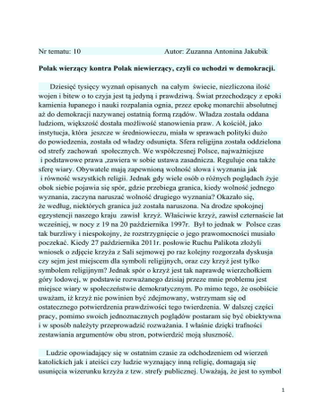 Nr tematu: 10 Autor: Zuzanna Antonina Jakubik Polak wierzący kontra Polak niewierzący, czyli co uchodzi w demokracji. Dziesięć tysięcy wyznań opisanych na całym świecie, niezliczona ilość wojen i bitew o to czyja jest tą jedyną i prawdziwą. Świat przechodzący z epoki kamienia łupanego i nauki rozpalania ognia, przez epokę monarchii absolutnej aż do demokracji nazywanej ostatnią formą rządów. Władza została oddana ludziom, większość dostała możliwość stanowienia praw. A kościół, jako instytucja, która jeszcze w średniowieczu, miała w sprawach polityki dużo do powiedzenia, została od władzy odsunięta. Sfera religijna została oddzielona od strefy zachowań społecznych. We współczesnej Polsce, najważniejsze i podstawowe prawa ,zawiera w sobie ustawa zasadnicza. Reguluje ona także sferę wiary. Obywatele mają zapewnioną wolność słowa i wyznania jak i równość wszystkich religii. Jednak gdy wiele osób o różnych poglądach żyje obok siebie pojawia się spór, gdzie przebiega granica, kiedy wolność jednego wyznania, zaczyna naruszać wolność drugiego wyznania? Okazało się, że według, niektórych granica już została naruszona. Na drodze spokojnej egzystencji naszego kraju zawisł krzyż. Właściwie krzyż, zawisł czternaście lat wcześniej, w nocy z 19 na 20 października 1997r. Był to jednak w Polsce czas tak burzliwy i niespokojny, że rozstrzygnięcie o jego prawomocności musiało poczekać. Kiedy 27 października 2011r. posłowie Ruchu Palikota złożyli wniosek o zdjęcie krzyża z Sali sejmowej po raz kolejny rozgorzała dyskusja czy sejm jest miejscem dla symboli religijnych, oraz czy krzyż jest tylko symbolem religijnym? Jednak spór o krzyż jest tak naprawdę wierzchołkiem góry lodowej, w podstawie rozważanego dzisiaj przeze mnie problemu jest miejsce wiary w społeczeństwie demokratycznym. Po mimo tego, że osobiście uważam, iż krzyż nie powinien być zdejmowany, wstrzymam się od ostatecznego potwierdzenia prawdziwości tego twierdzenia. W dalszej części pracy, pomimo swoich jednoznacznych poglądów postaram się być obiektywna i w sposób należyty przeprowadzić rozważania. I właśnie dzięki trafności zestawiania argumentów obu stron, potwierdzić moją słuszność. Ludzie opowiadający się w ostatnim czasie za odchodzeniem od wierzeń katolickich jak i ateiści czy ludzie wyznający inną religię, domagają się usunięcia wizerunku krzyża z tzw. strefy publicznej. Uważają, że jest to symbol 1 religijny i ,że jego obecność w sferze, która powinna być neutralna wyznaniowo, to indoktrynacja ludzi o innych przekonaniach. Stwierdzają także, że jest on symbolem władzy Kościoła katolickiego w Polsce. Sądzę jednak, że w prosty sposób uda mi się udowodnić, że nie jesteśmy w stanie wyeliminować znaku krzyża z naszego życia. Posłużmy się wyobraźnią. Jeśli początkiem działań mających zapewnić naszemu państwu neutralność religijną będzie zdjęcie krzyża z obrad sejmu, to usunięcie go z jakich miejsc będzie kończyło te działania? Czy krzyże znajdujące się na szczytach kościołów, widoczne z ulic, nie zaczną być kolejnym punktem w dążeniu do świeckości państwa? Co z krzyżami przydrożnymi czy tymi na karetkach? Przecież za równo sejm, szkoła, ulica czy miejski rynek to przestrzeń publiczna. Dlaczego więc walczyć z krzyżem w sejmie, ale zgadzać się na wizerunek krzyża przy drogach? W pewnym momencie takich rozważań nasuwa się pytanie, jak groźnego przeciwnika trzeba widzieć w wierze chrześcijańskiej, jeśli chce się doprowadzić jej symbol, małymi krokami, ale zdaje się, do rangi tabu? Komu i dlaczego tak naprawdę on przeszkadza? I czy to ów krzyż, jest faktycznym powodem sporu? Wydaje się przecież, że znak taki, symbolizuje coś tylko dla ludzi, którzy wierzą w naukę z nim związaną. Dla niewierzących, którzy nie szukają w nim, symbolu narodowego, powinien być nic nie znaczącym przedmiotem. Niektórzy zwolennicy krzyża stwierdzają, że jest to jedna z mających wywołać poruszenie w społeczeństwie sprzeczka. Która ucichnie bez rozwiązania. Trafność takiego sposobu myślenia niech każdy sam podda ocenie. Co na obronę krzyża mają jego sprzymierzeńcy? Historię. Słusznie, według mnie, argumentują oni, że krzyż jest częścią tradycji i kultury polskiej. Rok 966 kiedy Polska przyjmuje chrzest splata korzenie naszego kraju z korzeniami chrześcijaństwa, więc co oczywiste również z krzyżem, który jest jego symbolem. Dzięki krzyżowi wielu naszych rodaków na przestrzeni wieków znajdowało w sobie siłę do walki o zachowanie lub przywrócenie niepodległości w naszym państwie. Walczyli niezwykle zacięcie, często poświęcając na zawsze zdrowie, rodzinę, czy własne życie. Tak naprawdę nie walczyli za Krzyż, ale dzięki krzyżowi za Polskę. W czasie drugiej wojny światowej tysiące ludzi modliło się za Polskę. Miliony z nadzieją patrzyły na ten właśnie znak, to ze znakiem krzyża stoczniowcy gdańscy udali się na pierwszy strajk. Wiara i krzyż jednoczyły. I przez cały ten czas, były z naszym narodem. Dawały ludziom nadzieję i siłę. Nadzieję na lepsze jutro i siłę do walkę o nie. 2 Lepsze jutro mamy dziś, żyjemy w wolnej Polsce. W swojej wypowiedzi z szóstego grudnia 2009 roku Janusz Palikot uznaje, że symbolika krzyża w Polsce nie ogranicza się jedynie do znaku chrześcijaństwa. Pan Palikot stwierdza, że: „„Krzyż jest w takim samym stopniu w Polsce symbolem religijnym, co narodowym. Jeśli komuś przeszkadza symbol religijny niech odczytuje to w sposób narodowy właśnie. Kościół w Polsce był zawsze bowiem po stronie ludu i po stronie polskości. Dlatego – inaczej niż w Hiszpanii – nie można bezmyślnie walczyć z krzyżem”1 To, że dwa lata później w październiku 2011r ten sam polityk składa wniosek o usunięcie krzyża z Sali 