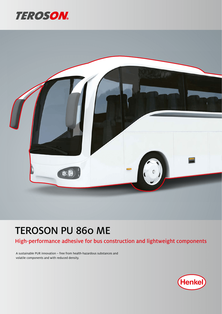TEROSON PU 860 ME High-performance adhesive for bus construction and lightweight components A sustainable PUR innovation – free from health-hazardous substances and volatile components and with reduced density. TEROSON PU 860 ME Thanks to its low density, the elastic, semi-structural adhesive TEROSON PU 860 ME for assembly work enables manufacturers to realize a significant reduction in vehicle weight. Benefits Applications >> Significantly lighter than its predecessor >> Easily applicable due to its favourable mixing ratio (1:2 by volume) >> Available in cartridges >> Does not require any hazardous labeling >> Reduces production time due to fast curing >> >> >> >> Structural bonding of AL flaps Semi-structural bonding of FRP (fibre reinforced plastic) parts Elastic bonding in highly stressed areas Replacement of products with higher density Sustainability The polyurethane-based adhesive contains no health-hazardous substances or organic solvents. Lightweight The semi-structural adhesive for assembly work enables to realize significant weight reduction. Key Characteristics: Technical Data >> >> >> >> >> >> Tensile strength approx. 15 MPa Elongation to break approx. 250 % Young’s0,05 – 0,25 modulus approx. 6 MPa Shear strength (2 mm) approx. 9 MPa No labelling Favourable mixing ratio Accelerated curing Low density of ca. 1,15 g/cm³ Excellent adhesion on ED and powder coats Improved adhesion to composites Europe Germany Henkel AG & Co. KGaA (Headquarters) Henkelstraße 67 40589 Düsseldorf Germany Phone: (+49) 211 797-0 Asia-Pacific China Henkel (China) Co. Ltd. No. 928 Zhang Heng Road Pu Dong 201203 Shanghai China Phone: (+86) 21 2891 8000 Solids 100 % Open time approx. 10 min. Green strength approx. 30 min. Application temperature 15 °C to 35 °C In service temperature – 40°C to 90°C Americas U.S.A. Henkel Corporation Madison Heights 32100 Stephenson Highway Madison Heights, MI 48071 United States Phone: (+1) 248 583 9300 www.henkel.com/automotive The data contained herein are intended as reference only. Please contact Henkel AG & Co. KGaA for assistance and r ecommendation on specifications for these products. ® designates a trademark of Henkel AG & Co. KGaA or its affiliates, registered in Germany and elsewhere © Henkel AG & Co. KGaA, 2013 AT5002013 09.2013