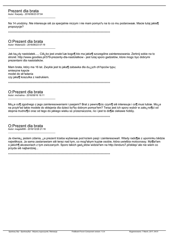 Prezent dla brata Autor: Karpaty - 2016/06/23 07:04 _____________________________________ Na 14 urodziny. Nie interesuje siê za specjalnie niczym i nie mam pomys³u na to co mu podarowaæ. Macie tutaj jakie¶ propozycje? ============================================================================ O:Prezent dla brata Autor: Waleria33 - 2016/06/23 07:19 _____________________________________ Jak ka¿dy nastolatek..... Ciê¿ko jest znale¼æ kogo¶ kto ma jakie¶ szczególne zainteresowania. Zerknij sobie na t± stronê: http://www.goodies.pl/379-prezenty-dla-nastolatkow - jest tutaj sporo gadzetów, ktore mog± byc dobrymi prezentami dla nastolatków. Mam brata, który ma 16 lat. Zwykle jest to jaka¶ zabawka dla du¿ych ch³opców typu; smieszne kapcie model do sk³adania czy jaka¶ koszulka z nadrukiem. ============================================================================ O:Prezent dla brata Autor: michalina - 2016/08/16 16:11 _____________________________________ Mo¿e co¶ zgodnego z jego zainteresowaniami i pasjami? Brat z pewno¶ci± czym¶ siê interesuje i co¶ musi lubiæ. Mo¿e na przyk³ad takie modele do sklejania dla dzieci by³by dobrym pomys³em? Teraz jest ich spory wybór w zale¿no¶ci od stopnia trudno¶ci oraz od tego do jakiego wieku s± przeznaczone, no i jest to do¶æ ciekawe hobby. ============================================================================ O:Prezent dla brata Autor: magda906 - 2016/12/28 21:16 _____________________________________ Ja równie¿ jestem zdania, ¿e prezent trzeba wybieraæ pod k±tem pasji i zainteresowañ. Wtedy rado¶æ z upominku bêdzie najwiêksza. Ja sama zastanawiam siê teraz nad tym, co mog³abym kupiæ osobie, która uwielbia motocrossy. My¶la³am o jakich¶ akcesoriach z tym zwi±zanych. Sporo takich gad¿etów widzia³am na http://enduro7.pl/sklep/ ale nie wiem co przyda siê najbardziej... ============================================================================ Sportowy Styl - SportowyStyl - Aktywny wypoczynek, Rekreacja FireBoard Forum Component version: 1.0.4 Wygenerowano: 7 March, 2017, 04:51
