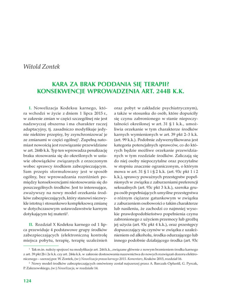 Witold Zontek Kara za brak poddania się terapii? Konsekwencje wprowadzenia art. 244b k.k. I. Nowelizacja Kodeksu karnego, która wchodzi w życie z dniem 1 lipca 2015 r., w zakresie zmian w części szczególnej nie jest nadzwyczaj obszerna i ma charakter raczej adaptacyjny, tj. zasadniczo modyfikuje jedynie niektóre przepisy, by zsynchronizować je ze zmianami w części ogólnej1. Zupełną natomiast nowością jest rozwiązanie przewidziane w art. 244b k.k. Typ ten wprowadza penalizację braku stosowania się do określonych w ustawie obowiązków związanych z orzeczonym wobec sprawcy środkiem zabezpieczającym. Sam przepis sformułowany jest w sposób ogólny, bez wprowadzania rozróżnień pomiędzy konsekwencjami niestosowania się do poszczególnych środków. Jest to interesujące, zważywszy na nowy model orzekania środków zabezpieczających, który stanowi niezwykle istotną i stosunkowo kompleksową zmianę w dotychczasowym ustawodawstwie karnym dotykającym tej materii2. II. Rozdział X Kodeksu karnego od 1 lipca przewiduje 4 podstawowe grupy środków zabezpieczających (elektroniczną kontrolę miejsca pobytu, terapię, terapię uzależnień oraz pobyt w zakładzie psychiatrycznym), a także w stosunku do osób, które dopuściły się czynu zabronionego w stanie niepoczytalności określonej w art. 31 § 1 k.k., umożliwia orzekanie w tym charakterze środków karnych wymienionych w art. 39 pkt 2–3 k.k. (art. 99 k.k.). Podobnie zdywersyfikowana jest kategoria potencjalnych sprawców, co do których będzie możliwe orzekanie przewidzianych w tym rozdziale środków. Zaliczają się do niej osoby niepoczytalne oraz poczytalne w stopniu znacznie ograniczonym, o którym mowa w art. 31 § 1 i § 2 k.k. (art. 93c pkt 1 i 2 k.k.), sprawcy poważnych przestępstw popełnionych w związku z zaburzeniami preferencji seksualnych (art. 93c pkt 3 k.k.), szeroka grupa osób popełniających umyślne przestępstwa o różnym ciężarze gatunkowym w związku z zaburzeniem osobowości o takim charakterze lub nasileniu, że zachodzi co najmniej wysokie prawdopodobieństwo popełnienia czynu zabronionego z użyciem przemocy lub groźbą jej użycia (art. 93c pkt 4 k.k.), oraz przestępcy dopuszczający się czynów w związku z uzależnieniem od alkoholu, środka odurzającego lub innego podobnie działającego środka (art. 93c 1 Tak m.in. należy spojrzeć na modyfikacje art. 244 k.k., związane głównie z nowym brzmieniem środka karnego z art. 39 pkt 2b i 2e k.k. czy art. 244a k.k. w zakresie dostosowania nazewnictwa do nowych rozwiązań dozoru elektronicznego – szerzej por. W. Zontek, (w:) Nowelizacja prawa karnego 2015. Komentarz, Kraków 2015, rozdział 16. 2 Nowy model środków zabezpieczających omówiony został najszerzej przez A. Barczak-Oplustil, G. Pyrcak, P. Zakrzewskiego, (w:) Nowelizacja, w rozdziale 14. 124 7–8/2015 pkt 5 k.k.). Jedynym wspólnym mianownikiem dla tak zarysowanej kategorii podmiotów podlegających potencjalnie reżimowi zabezpieczenia w trybach przewidzianych rozdziałem X Kodeksu jest prognostycznie określony stopień prawdopodobieństwa, że z uwagi na swoje cechy dopuszczą się oni ponownie przestępstwa. Jednak już czyny przez nich popełnione i te, które mogą oni popełnić, a także okoliczności, kwantum ryzyka, a wreszcie realna możliwość samokontroli determinować będą in concreto rodzaj i zakres orzeczonego środka. Powyższe powodować musi wszakże praktyczne konsekwencje w zakresie realizacji przez sprawców nałożonych na nich obowiązków lub zakazów. Przepis art. 244b k.k. wrzuca do przysłowiowego worka wszystkie możliwe konfiguracje faktyczne skutkujące finalnym brakiem stosowania się do określonych obowiązków. W zakresie już samej odpowiedzialności karnej oczywiście zastosowanie będą miały standardowe jej przesłanki i determinanty, zwłaszcza dyrektywy indywidualizacji. Sposób sformułowania, a dalej zakres zastosowania art. 244b k.k. można porównać do art. 244 k.k., który przewiduje penalizację niestosowania się do orzeczonego środka karnego. Z uwagi na fakt, że w uzasadnieniu projektu noweli3 brak jest jakiegokolwiek odniesienia do art. 244b k.k., należy domniemywać, że funkcja mu przydana ma charakter stricte „techniczny”, tj. obok reżimu wykonawczego ma w założeniu wzmacniać skuteczność stosowania środków zabezpieczających. III. Jednak już na etapie prac parlamentarnych przepis ten wzbudził zainteresowanie i kontrowersje. Chodziło o ten aspekt jego zakresu zastosowania, który dotyczyłby uchylania się od obowiązków związanych z poddaniem się terapii lub terapii uzależnień. W uchwale Kara za brak poddania się terapii... Senatu z 7 lutego 2015 r.4 nadano art. 244b k.k. brzmienie znacznie limitujące jego pierwotny zakres zastosowania5. W uzasadnieniu tej poprawki podkreślono, że nie będzie skutecznym narzędziem do walki z niepokornym uzależnionym lub chorym człowiekiem przepis, który wprowadza wobec niego sankcję karną, gdyż osoba uzależniona lub chora wymaga pomocy, a nie skazania. Wydaje się jednak, że Senat, słusznie dostrzegając problem, uzasadnił swoje wątpliwości w sposób z pewnością daleki od wyczerpującego. Nie jest zwłaszcza zrozumiałe, dlaczego akurat karze mógłby być poddany sprawca podejmujący czynności polegające na usunięciu, uszkodzeniu lub w inny sposób uczynieniu urządzeń technicznych używanych w przypadku stosowania elektronicznej kontroli pobytu niezdatnymi do użytku zgodnie z ich przeznaczeniem. Środek ten może być stosowany (i zapewne w dużej mierze będzie) w stosunku do sprawców cierpiących na różnorakie zaburzenia osobowości lub preferencji seksualnych (czyli tych, o których Senat wyraził się jako o potrzebujących pomocy). Z kolei dyskusja w komisji sejmowej w dniu 18 lutego 2015 r.6 koncentrowała się raczej na zapewnieniu efektywności stosowania środków zabezpieczających wobec inny