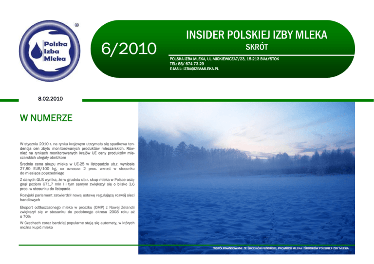 INSIDER POLSKIEJ IZBY MLEKA 6/2010 SKRÓT POLSKA IZBA MLEKA, UL.MICKIEWICZA7/23, 1515-213 BIAŁYSTOK TEL: 85/ 674 73 29 E-MAIL: [email protected] [email protected] 8.02.2010 W NUMERZE W styczniu 2010 r. na rynku krajowym utrzymała się spadkowa tendencja cen zbytu monitorowanych produktów mleczarskich. Również na rynkach monitorowanych krajów UE ceny produktów mleczarskich ulegały obniżkom Średnia cena skupu mleka w UEUE-25 w listopadzie ub.r. wyniosła 27,80 EUR/100 kg, co oznacza 2 proc. wzrost w stosunku do miesiąca poprzedniego Z danych GUS wynika, że w grudniu ub.r. skup mleka w Polsce osiągnął poziom 671,7 mln l i tym samym zwiększył się o blisko 3,6 proc. w stosunku do listopada Rosyjski parlament zatwierdził nową ustawę regulującą rozwój sieci handlowych Eksport odtłuszczonego mleka w proszku (OMP) z Nowej Zelandii zwiększył się w stosunku do podobnego okresu 2008 roku aż o 70% W Czechach coraz bardziej popularne stają się automaty, w których można kupić mleko WSPÓŁFINANSOWANE ZE ŚRODKÓW FUNDUSZU PROMOCJI MLEKA I ŚRODKÓW POLSKIEJ IZBY MLEKA 2 SPIS TREŚCI INFORMACJE MAKROEKONOMICZNE SPIS TREŚCI INFORMACJE MAKROEKONOMICZNE 4,3 INFORMACJE MAKROEKONOMICZNE 2 str NOTOWANIA CENOWE — RYNEK KRAJOWY 3 str NOTOWANIA CENOWE — RYNEK ZAGRANICZNY 4 str INFORMACJE Z POLSKI, UE I ZE ŚWIATA 5 str RYNEK KONSUMENCKI 6 str AKTUALNOŚCI POLSKIEJ IZBY MLEKA 7 str PRAWO 9 str TYDZIEŃ W MEDIACH 10 str 4,2 4,1 4,18 4,14 4,18 4,09 4,17 4,11 4,09 4,0 4,11 4,03 4,07 4,06 3,9 3,8 3,7 3,6 3,5 3,4 EUR 3,3 USD 3,2 3,1 2,99 3,0 2,9 2,8 2,90 2,81 2,81 2,88 2,87 2,90 2,72 2,87 2,91 2,80 2,7 Na koniec tygodnia 5-ego (tj. na dzień 05.02.2009) za jedno euro trzeba było zapłacić 4,0921 zł. Za jednego US dolara płacono 2,9915 zł. Komentarz do notowań walutowych (www.fmcm.pl) Pary złotowe zachowywały się mieszanie w tym tygodniu. Pierwsze dni były bardzo dobre dla polskiej waluty, dzięki czemu na parze EUR/PLN udało się w końcu przebić przez psychologiczny poziom 4,00, a kurs USD/PLN zanotował spadek poniżej 2,83. Jednak zmiana nastrojów globalnych na prodolarowe w drugiej części tygodnia wywołała znaczne osłabienie złotego Euro nie wróci już powyżej 4 zł (Puls Biznseu) Wśród analityków przeważają optymiści. Wielu z nich twierdzi jednak, że po ostatnim rajdzie złoty zasłużył już na odpoczynek. Na koniec lutego za euro zapłacimy 3,97 zł — wynika z ankiety "PB". www.izbamleka.pl 3 INFORMACJE MAKROEKONOMICZNE NOTOWANIA CENOWE — RYNEK KRAJOWY Informacje z rynku zbóż i żywca (Rzeczpospolita) NOTOWANIA CENOWE — RYNEK KRAJOWY W handlu zbożem możliwa jest dalsza obniżka notowań, a zdecydowanie taniej powinno być Ceny zbytu przetworów mleczarskich spadają (BGŻ) w marcu. Tanieją surowce eksportowe, jak tłuszcze czy podroby, bo przedsiębiorcy z Ukrainy Utrzymujące się od kilku tygodni spadkowe tendencje cen zbytu przetworów mleczarskich na nie mają zezwoleń na import. Bardzo mało jest ostatnio na giełdach transakcji zbożem. Na rynku światowym i unijnym wraz z umacniającym się złotym względem euro mogą tłumaczyć razie po konkurencyjnych cenach można kupić ziarno z importu (głównie pszenicę i kukurydzę). dalsze obniżki cen zbytu tych produktów na rynku krajowym - podają analitycy BGŻ. Dane MiniMaklerzy spodziewają się jednak znacznych obniżek na krajowym rynku wiosną, gdy skończą sterstwa Rolnictwa wskazują, że w trzecim tygodniu stycznia (18-24.01) spadły ceny m.in. masię mrozy i zniknie śnieg, a tym samym łatwiejszy będzie dostęp do magazynów ze zbożem. sła, odtłuszczonego mleka w proszku oraz serów. Stopa bezrobocia w styczniu 2010 r. (MPiPS) Średnie ceny na targowiskach w zł/sztukę (ISRIR MRiRW ceny netto u producenta) Stopa bezrobocia w styczniu 2010 r. wzrosła do 12,8% z 11,9% odnotowanej w grudniu ub.r. – Z powodu braku publikacji średniej ceny krowy i jałówki w 4 tygodniu — przypominamy dane szacuje MPiPS. IERiGŻ: Wzrost cen żywności w 2010 roku poniżej inflacji z 3 tygodnia. Średnia cena sprzedaży krowy mlecznej w 3 tygodniu br. wyniosła 2.361,11 zł/szt., a jałówki jednorocznej - 2.295,00 zł/sztukę. W 2010 roku ceny żywności wzrosną najwyżej o kilka procent, ale poniżej poziomu inflacji - Krajowe ceny artykułów mleczarskich (ARR) powiedział PAP dyrektor Instytutu Ekonomiki Rolnictwa i Gospodarki Żywnościowej Andrzej W styczniu 2010 r. na rynku krajowym utrzymała się (zapoczątkowana w grudniu 2009 r.) Kowalski. W bieżącym roku nastąpi lekki wzrost cen zbóż i pasz. Wzrosną ceny pieczywa, spadkowa tendencja cen zbytu monitorowanych produktów mleczarskich. ale na to decydujący wpływ będą miały ceny energii". Stabilne będą ceny mięs, w tym wołowiny. Ceny tygodniowe wybranych produktów mleczarskich w zł za 100 kg (ISRIR MRiRW ceny netto Zdaniem Kowalskiego, nieznane są tendencje cenowe owoców i warzyw, natomiast o kilka u producenta) procent podrożeje mleko Polska znów świeci na mapie świata (Puls Biznesu) Mamy mocny argument w twardej walce o każdy milion euro. Skoczyliśmy na 6. miejsce z 22. w rankingu atrakcyjności inwestycyjnej. To nagroda za odporność na kryzys. Sprzedaż detaliczna w strefie euro bez zmian (gospodarka.gazeta.pl) W grudniu 2009 roku sprzedaż detaliczna w strefie euro nie uległa zmianie miesiąc do miesiąca i spadła o 1,6 procent w skali roku wobec spadku o odpowiednio 0,5 i 2,0 procent po korekcie w listopadzie - podał europejski instytut statystyczny Eurostat. 1440 1400 1360 1320 1280 1240 1200 1160 1120 1080 1040 1000 960 920 880 840 800 760 720 1422,80 1420,46 1384,66 1371,50 1352,70 1216,16 1207,83 1207,38 1195,28 1179,56 1307,12 1226,74 1214,29 1233,85 1187,09 1361,03 1269,17 1314,82 1201,16 1183,40 1173,73 1281,06 1182,68 1165,87 1157,88 1176,35 1157,80 1125,90 1068,83 1002,13 788,17 51 Masło w blokach 1019,47 1026,62 1026,68 1008,93 999,47 801,49 797,11 52 OMP 53 PMP Ser Edamski