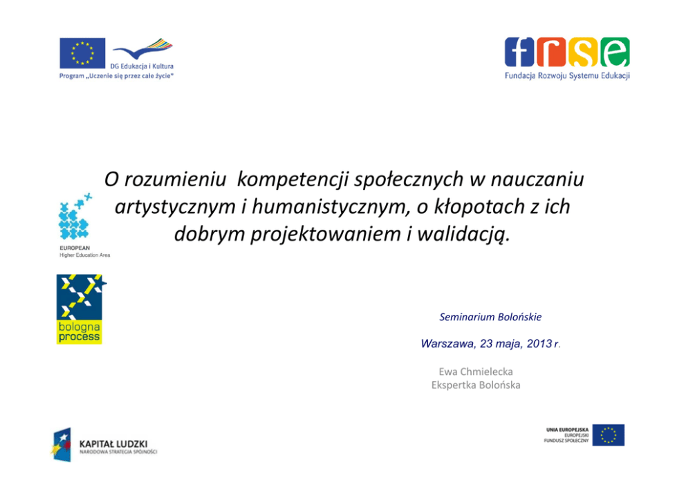 O rozumieniu kompetencji społecznych w nauczaniu p j p y artystycznym i humanistycznym, o kłopotach z ich dobrym projektowaniem i walidacją. y p j ją Seminarium Bolońskie Warszawa, 23 maja, 2013 r. Ewa Chmielecka Ekspertka Bolońska Temat naszej rozmowy: Temat naszej rozmowy: O problemach związanych z wprowadzaniem ram kwalifikacji w obszar bl h h d k lfk b kształcenia: artystycznego i humanistycznego a w szczególności g • O rozumieniu kompetencji społecznych w nauczaniu artystycznym i humanistycznym, o kłopotach z ich dobrym projektowanie i walidacją • Tematy: • Interpretacja kolumny „kompetencje społeczne Interpretacja kolumny kompetencje społeczne” z KRK z KRK • Nauczania humanistyki a KRK • Przykłady walidacji efektów kształcenia na zajęciach humanistycznych • Spodziewana pomoc – projekt WAP. Interpretacja kolumny „kompetencje społeczne” KRK • • • • Krótka historia „kompetencji społecznych” w KRK dla szkolnictwa wyższego. ó k hi i k ji ł h” dl k l i ż Właściwe rozumienie: – Kompetencje adaptacyjne, techniczne, pozwalające efektywnie i skutecznie działać, prowadzić badania, odnaleźć się na rynku pracy. – Kompetencje emancypacyjne, pozwalające na rozumienie otaczającej y g j g j rzeczywistości, własnego działania oraz jego konsekwencji oraz na dokonywanie wyborów w oparciu o własne potrzeby, uzasadnienia, wartości, ze świadomością konsekwencji związanymi z tymi wyborami. – Kompetencje krytyczne, pozwalające na dostrzeganie wszelkich uzasadnień p j yy ,p ją g legitymizujących własne działanie oraz praktykę społeczną. Dyskurs władzy, gra interesów, dominacji, wykluczania, przemoc symboliczna. Co z tego zostało? Co z tego zostało? Szczególna rola deskryptorów „kompetencji społecznych” w obszarze „sztuka” Zapisy z PRK – deskryptory uniwersalne poziomów 6‐8 PRK Kategorie: autonomia, tożsamość, odpowiedzialność, współdziałanie. K i i ż ść d i d i l ść ółd i ł i Absolwent jest gotów do: Poziom 6: • kultywowania i upowszechniania wzorów właściwego postępowania w środowisku pracy i poza nim; • samodzielnego podejmowania decyzji, krytycznej oceny działań własnych, działań zespołów, którymi kieruje i organizacji w których uczestniczy; którymi kieruje, i organizacji, w których uczestniczy; • przyjmowania odpowiedzialności za skutki tych działań Poziom 7 • tworzenia i rozwijania wzorów właściwego postępowania w środowisku pracy i życia tworzenia i rozwijania wzorów właściwego postępowania w środowisku pracy i życia podejmowania inicjatyw, krytycznej oceny siebie oraz zespołów i organizacji, w których uczestniczy przewodzenia grupie i ponoszenia odpowiedzialności za nią Poziom 8 Poziom 8 • niezależnego badania powiększającego istniejący dorobek naukowy i twórczy • podejmowania wyzwań w sferze zawodowej i publicznej z uwzględnieniem: ich etycznego y p g wymiaru i odpowiedzialności za ich skutki oraz kształtowania wzorów właściwego postępowania w takich sytuacjach Czy ramy kwalifikacji przyczyniają się do spadku Czy ramy kwalifikacji przyczyniają się do spadku kształcenia humanistycznego w Polsce? • Zauważalny spadek ilościowy i jakościowy nauczania humanistyki • malejąca liczba kandydatów na kierunki humanistyczne • Eliminacja zajęć „humanizujących” – a orientacja „praktyczna”, „rynkowa” kształcenia a orientacja prakt c na” r nko a” ks tałcenia – a ramy kwalifikacji • Ja Jak korzystać z ram, aby zabezpieczyć właściwe nauczanie o ystać a , aby abe p ec yć aśc e auc a e humanistyki? – Kierunki humanistyczne a wzrost autonomii programowej – Zajęcia usługowe a deskryptory obszarowe • Przykład: konkurs milionerów Nauczanie humanistyki (tu: filozofii) jako tzw. „zajęć usługowych” • Poziom programu kierunku studiów / uczelni – Dokumenty ogólnouczelniane – czy dobrze interpretują sens zajęć „humanizujących humanizujących” – Curricula i odwołanie się do deskryptorów obszarowych – przypominanie o wychowawczych funkcjach uczelni p yp y y j • Poziom modułów / sylabusów / y – Nowa oferta czy „historia filozofii”? – Walidacja efektów kształcenia w dziale „kompetencje społeczne” Ramy kwalifikacji a nauczanie humanistyki Fragment dyskusji na forum KNF PAN dotyczącej zapobiegania upadkowi nauczania d k f d b dk filozofii w Polsce. • • • • • • Potrzeba rzetelnej diagnozy przyczyn P b l j di tego procesu ‐ wolnej od emocji, narzekania i l j d ji k i i uprzedzeń : – Unikającej argumentacji ograniczającej autonomię akademicką („filozofia ma być obowiązkowa ) obowiązkowa”) – Unikającej argumentacji eksponującej interesy środowiska – Na rzecz argumentacji merytorycznej i wykorzystującej przepisy prawa Potrzeba dobrze uzasadnionej diagnozy społecznych skutków upadku tego nauczania … Potrzeba dobrze uzasadnionej diagnozy społecznych skutków upadku tego nauczania Potrzeba odwagi w upominaniu senatów i rad wydziałów, że łamią zasady KRK ustalając programy wolne od efektów kształcenia obecnych w kolumnie „kompetencji społecznych” bądź wypełniają ją czymkolwiek – ą yp ją ją y a zarazem potrzeba dobrego uzasadnienia, ze zajęcia p g , ję usługowe z filozofii tę kolumnę wypełniają. Potrzeba atrakcyjnych i przekonywujących modułów dla zajęć „usługowych” Potrzeba podjęcia dialogu z decydentami, zaalarmowania konferencji rektorów, innych ciał mających wpływ na system szkolnictwa wyższego w Polsce. Potrzeba zaalarmowania PKA, aby zechciała oceniać „trzecią kolumnę” jako kolumnę faktycznych kompetencji osobowych i społecznych i realizacji przez uczelnie celów wychowawczych. h h Walidacja efektów kształcenia przykład zajęć „Etyka w biznesie” (poziom 6 KRK) Przedmiot obowiązkowy dla studentów „Zarządzania” SGH, do wyboru dl