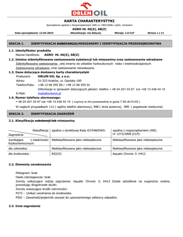 KARTA CHARAKTERYSTYKI Sporządzona zgodnie z Rozporządzeniem (WE) nr 1907/2006 z późn. zmianami AGRO HL 46(Z), 68(Z) Data sporządzenia: 12.04.2015 SEKCJA 1. Aktualizacja: nie dotyczy Wersja: 1.0 CLP Strona 1 z 11 IDENTYFIKACJA SUBSTANCJI/MIESZANINY I IDENTYFIKACJA PRZEDSIĘBIORSTWA 1.1. Identyfikator produktu Nazwa handlowa: AGRO HL 46(Z), 68(Z) 1.2. Istotne zidentyfikowane zastosowania substancji lub mieszaniny oraz zastosowania odradzane Zidentyfikowane zastosowania: olej smarny do układów hydraulicznych nisko i średnioobciążonych Zastosowania odradzane: inne zastosowanie niewskazane. 1.3. Dane dotyczące dostawcy karty charakterystyki Producent: ORLEN OIL Sp. z o.o. Adres: 31-323 Kraków, ul. Opolska 100 Telefon/Faks: +48 12 66 555 00 / +48 12 66 555 01 E-Mail: [email protected] Informacje w sprawach dotyczących jakości: telefon + 48 24 201 03 67 lub +48 13 438 44 15 1.4. Numer telefonu alarmowego: + 48 24 201 03 67 lub +48 13 438 44 15 ( czynny w dni powszednie w godz 7.00 do15.00 ) W nagłych przypadkach 112 ( ogólny telefon alarmowy), 998 ( straż pożarna), 999 ( pogotowie medyczne) SEKCJA 2. IDENTYFIKACJA ZAGROŻEŃ 2.1. Klasyfikacja substancji lub mieszaniny Klasyfikacja zgodna z dyrektywą Rady 67/548/EWG: zgodna z rozporządzeniem (WE) nr 1272/2008 (CLP): wynikające z właściwości fizykochemicznych: Nieklasyfikowana jako niebezpieczna Nieklasyfikowana jako niebezpieczna dla człowieka: Nieklasyfikowana jako niebezpieczna Nieklasyfikowana jako niebezpieczna dla środowiska: R52/53 Aquatic Chronic 3: H412 Zagrożenia 2.2. Elementy oznakowania Piktogram: brak Hasło ostrzegawcze: brak Zwroty wskazujące rodzaj zagrożenia: Aquatic Chronic 3; H412 Działa szkodliwie na organizmy wodne, powodując długotrwałe skutki. Zwroty wskazujące środki ostrożności: P273 - Unikać uwolnienia do środowiska. P501 – Zawartość/pojemnik usuwać do upoważnionego odbiorcy odpadów. 2.3. Inne zagrożenia KARTA CHARAKTERYSTYKI Sporządzona zgodnie z Rozporządzeniem (WE) nr 1907/2006 z późn. zmianami AGRO HL 46(Z), 68(Z) Data sporządzenia: 12.04.2015 Aktualizacja: nie dotyczy Wersja: 1.0 CLP Strona 2 z 11 Brak informacji na temat spełnienia kryteriów PBT lub vPvB zgodnie z załącznikiem XIII Rozporządzenia REACH. Brak danych o przeprowadzonych badaniach. SEKCJA 3. SKŁAD/INFORMACJA O SKŁADNIKACH 3.1. Substancje – nie dotyczy 3.2. Mieszaniny: mieszanina olejów bazowych, trójglicerydów i dodatków uszlachetniających Niebezpieczne składniki, zakresy ich stężeń w mieszaninie: Nr CAS / Nr WE Nr indeksowy % wag. Klasyfikacja wg 67/548/EWG 2,6-di-tert.-butyl-p-cresol 128-37-0/ -- c<0,5 N; R50/53 01-2119565113-46-0000 204-881-4 Nazwa substancji/ Nr rejestracji REACH Klasyfikacja (CLP) wg 1272/2008 Aquatic Acute 1; H400 Aquatic Chronic 1;H410 (M=1) Bis[O,O-bis(2etyloheksylo)fosforoditioat o-S,S’],(T-4)- cynku 4259-15-8 -- 0,24<c<0,29 224-235-5 Xi;R41, Aquatic Chronic2;H411 N;R51/53 Eye Dam.1, H318 01-2119493635-27 Na podstawie noty H i L oleje bazowe niespecyfikowane rakotwórcze (zawartość ekstraktu DMSO (wg IP 346) < 3%). zawarte w mieszaninie nie są klasyfikowane jako Opis zwrotów R i H podano w Sekcji 16. SEKCJA 4. ŚRODKI PIERWSZEJ POMOCY 4.1. Opis środków pierwszej pomocy Wdychanie: Poszkodowanego usunąć (wyprowadzić/wynieść) z miejsca narażenia na świeże powietrze; zapewnić spokój i ciepło. Nieprzytomnego ułożyć w pozycji bocznej ustalonej, rozluźnić uciskające części ubrania; kontrolować i utrzymywać drożność dróg oddechowych. W przypadku zaburzeń w oddychaniu podawać tlen, w przypadku braku oddechu stosować sztuczne oddychanie. W przypadku utraty przytomności, zaburzeń oddychania lub utrzymującego się złego samopoczucia natychmiast zapewnić pomoc lekarską. Kontakt ze skórą: Natychmiast zdjąć zanieczyszczoną/nasiąkniętą odzież i buty. Zanieczyszczoną skórę umyć dokładnie wodą z mydłem lub łagodnym detergentem, a następnie spłukać wodą. W przypadku wystąpienia i utrzymywania się objawów podrażnienia skonsultować się z lekarzem. UWAGA: Zanieczyszczoną/nasiąkniętą odzież usunąć w bezpieczne miejsce z dala od źródeł ciepła i źródeł zapłonu. Kontakt z oczami: Zanieczyszczone oczy natychmiast płukać ciągłym strumieniem wody, usunąć szkła kontaktowe (jeśli są) i kontynuować płukanie przez ok. 15 minut. Podczas płukania trzymać powieki szeroko rozwarte i poruszać gałką oczną. W przypadku wystąpienia i utrzymywania się dolegliwości skonsultować się z lekarzem. UWAGA: Nie stosować zbyt silnego strumienia wody, aby nie uszkodzić rogówki. KARTA CHARAKTERYSTYKI Sporządzona zgodnie z Rozporządzeniem (WE) nr 1907/2006 z późn. zmianami AGRO HL 46(Z), 68(Z) Data sporządzenia: 12.04.2015 Aktualizacja: nie dotyczy Wersja: 1.0 CLP Strona 3 z 11 Połknięcie: Natychmiast zapewnić pomoc medyczną. NIE prowokować wymiotów – zwiększone ryzyko zachłyśnięcia. W przypadku wystąpienia samoistnych wymiotów trzymać poszkodowanego w pozycji nachylonej do przodu z twarzą skierowaną do ziemi. Jeśli poszkodowany jest przytomny podać do wypicia ok. 200 ml ciekłej parafiny. Nie podawać mleka, tłuszczu, alkoholu. 4.2. Najważniejsze ostre i opóźnione objawy oraz skutki narażenia Nie określono. 4.3. Wskazania dotyczące wszelkiej natychmiastowej pomocy lekarskiej i szczególnego postępowania z poszkodowanym Nie prowokować wymiotów i nie podawać niczego doustnie osobie nieprzytomnej. Pokazać kartę charakterystyki lub etykietę/opakowanie personelowi medycznemu udzielającemu pomocy. Osoby udzielające pomocy w obszarze o nieznanym stężeniu par/mgły powinny być wyposażone w odpowiednie ochrony dróg oddechowych. Wskazówki dla lekarza: leczenie objawowe. SEKCJA 5. POSTĘPOWANIE W PRZYPADKU POŻARU 5.1. Środki gaśnicze Odpowiednie środki gaśnicze: dwutlenek węgla, proszek gaśniczy, piana; rozproszone prądy wody lub mgła wodna Niewłaściwe środ