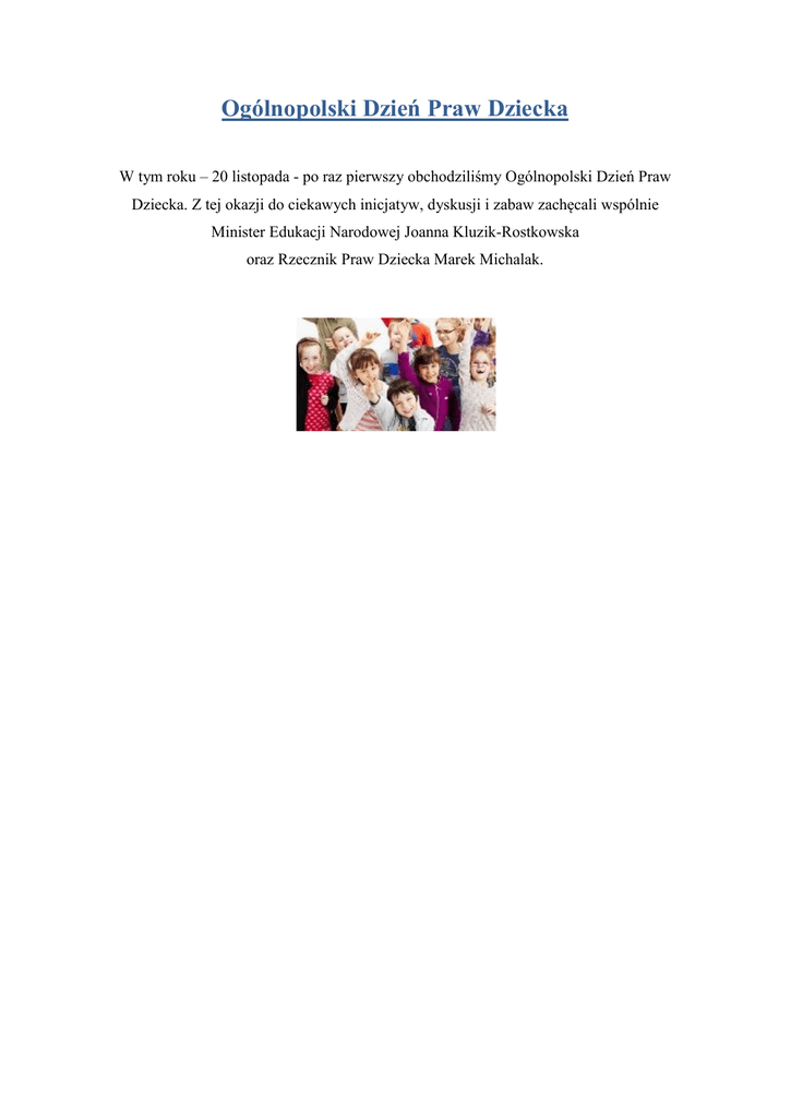 Ogólnopolski Dzień Praw Dziecka W tym roku – 20 listopada - po raz pierwszy obchodziliśmy Ogólnopolski Dzień Praw Dziecka. Z tej okazji do ciekawych inicjatyw, dyskusji i zabaw zachęcali wspólnie Minister Edukacji Narodowej Joanna Kluzik-Rostkowska oraz Rzecznik Praw Dziecka Marek Michalak.