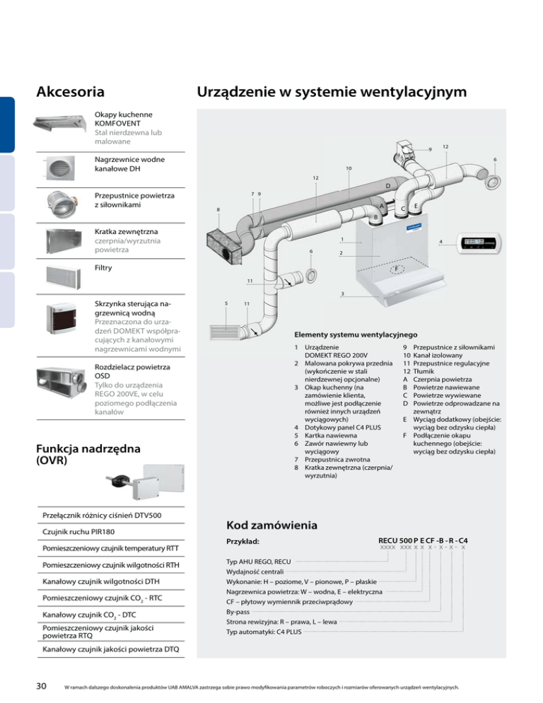Akcesoria Urządzenie w systemie wentylacyjnym Okapy kuchenne KOMFOVENT Stal nierdzewna lub malowane 12 9 Nagrzewnice wodne kanałowe DH 6 10 12 D Przepustnice powietrza z siłownikami 7 9 A 8 C E B Kratka zewnętrzna czerpnia/wyrzutnia powietrza 1 6 4 2 Filtry F 11 3 Skrzynka sterująca nagrzewnicą wodną Przeznaczona do urzadzeń DOMEKT współpracujących z kanałowymi nagrzewnicami wodnymi 5 11 Elementy systemu wentylacyjnego 1 Urządzenie DOMEKT REGO 200V 2 Malowana pokrywa przednia (wykończenie w stali nierdzewnej opcjonalne) 3 Okap kuchenny (na zamówienie klienta, możliwe jest podłączenie również innych urządzeń wyciągowych) 4 Dotykowy panel C4 PLUS 5 Kartka nawiewna 6 Zawór nawiewny lub wyciągowy 7 Przepustnica zwrotna 8 Kratka zewnętrzna (czerpnia/ wyrzutnia) Rozdzielacz powietrza OSD Tylko do urządzenia REGO 200VE, w celu poziomego podłączenia kanałów Funkcja nadrzędna (OVR) 9 10 11 12 A B C D Przepustnice z siłownikami Kanał izolowany Przepustnice regulacyjne Tłumik Czerpnia powietrza Powietrze nawiewane Powietrze wywiewane Powietrze odprowadzane na zewnątrz E Wyciąg dodatkowy (obejście: wyciąg bez odzysku ciepła) F Podłączenie okapu kuchennego (obejście: wyciąg bez odzysku ciepła) Przełącznik różnicy ciśnień DTV500 Czujnik ruchu PIR180 Pomieszczeniowy czujnik temperatury RTT Pomieszczeniowy czujnik wilgotności RTH Kanałowy czujnik wilgotności DTH Pomieszczeniowy czujnik CO2 - RTC Kanałowy czujnik CO2 - DTC Pomieszczeniowy czujnik jakości powietrza RTQ Kod zamówienia Przykład: RECU 500 P E CF -B - R - C4 xxxx xxx x x x - x - x - x Typ AHU REGO, RECU Wydajność centrali Wykonanie: H – poziome, V – pionowe, P – płaskie Nagrzewnica powietrza: W – wodna, E – elektryczna CF – płytowy wymiennik przeciwprądowy By-pass Strona rewizyjna: R – prawa, L – lewa Typ automatyki: C4 PLUS Kanałowy czujnik jakości powietrza DTQ 30 W ramach dalszego doskonalenia produktów UAB AMALVA zastrzega sobie prawo modyfikowania parametrów roboczych i rozmiarów oferowanych urządzeń wentylacyjnych.