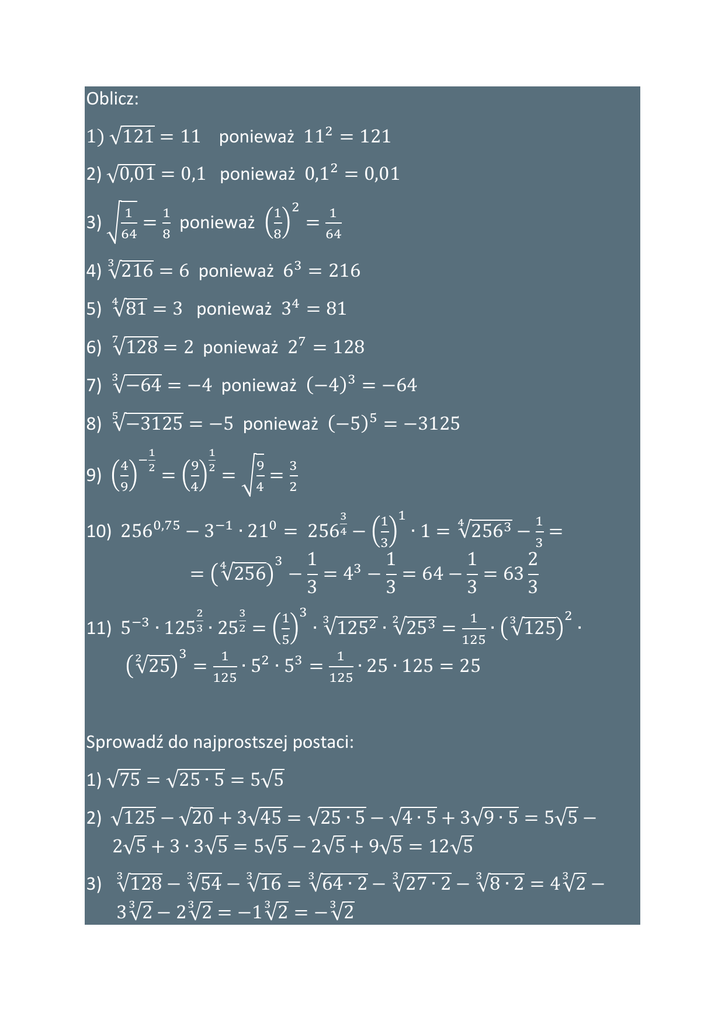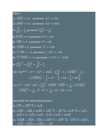Oblicz: 1) √121 = 11 ponieważ 112 = 121 2) √0,01 = 0,1 ponieważ 0,12 = 0,01 3) √ 1 64 = 1 8 1 2 1 8 64 ponieważ ( ) = 3 4) √216 = 6 ponieważ 63 = 216 4 5) √81 = 3 ponieważ 34 = 81 7 6) √128 = 2 ponieważ 27 = 128 3 7) √−64 = −4 ponieważ (−4)3 = −64 5 8) √−3125 = −5 ponieważ (−5)5 = −3125 1 9) 4 −2 ( ) 9 1 9 2 ( ) 4 = 0,75 10) 256 −3 11) 5 2 9 3 4 2 =√ = −1 3 4 0 1 1 1 4 ∙ 21 = 256 − ( ) ∙ 1 = √2563 − = 3 3 3 1 1 1 2 4 = ( √256) − = 43 − = 64 − = 63 3 3 3 3 −3 2 3 1 3 3 2 3 2 1 3 2 ∙ 125 ∙ 25 = ( ) ∙ √1252 ∙ √253 = ∙ ( √125) ∙ 5 125 3 1 1 ( √25) = 125 ∙ 52 ∙ 53 = 125 ∙ 25 ∙ 125 = 25 Sprowadź do najprostszej postaci: 1) √75 = √25 ∙ 5 = 5√5 2) √125 − √20 + 3√45 = √25 ∙ 5 − √4 ∙ 5 + 3√9 ∙ 5 = 5√5 − 2√5 + 3 ∙ 3√5 = 5√5 − 2√5 + 9√5 = 12√5 3 3 3 3 3 3 3 3) √128 − √54 − √16 = √64 ∙ 2 − √27 ∙ 2 − √8 ∙ 2 = 4 √2 − 3 3 3 3 3 √2 − 2 √2 = −1 √2 = − √2 Włącz czynnik pod pierwiastek: 1) 5√6 = √52 ∙ 6 = √25 ∙ 6 = √150 4 4 4 4 2) 7 √2 = √74 ∙ 2 = √2401 ∙ 2 = √4802 Usuń niewymierność z mianownika: 1) 2) 4 3√ 5 = 2√ 5 3√2−4 4 √5 3√ 5 √ 5 = ∙ = 2 √5 ∙ 4√ 5 3∙√5∙√5 3√2+4 3√2−4 3√2+4 2√5∙3√2+2√5∙4 3√2∙3√2+4∙3√2−4∙3√2−4∙4 6√10+8√5 6√10 8√ 5 = 2 3) 12 √5−√3 = 2 12 + 2 = 4√ 5 3∙5 = 4√ 5 15 2√5∙(3√2+4) (3√2−4)∙(3√2+4) 6√5∙2+8√5 = 9√2∙2−16 = √5+√3 √5−√3 √5+√3 ∙ = = = 6√10+8√5 9∙2−16 = 6√10+8√5 19−16 3√10 + 4√5 = 12√5+12√3 √5∙√5+√5∙√3−√3∙√5−√3∙√3 12∙(√5+√3) (√5−√3)∙(√5+√3) = = 12√5+12√3 √25+√15−√15−√9 = 12√5+12√3 12√5 + 12√3 12√5 12√3 = + = 6√5 + 6√3 2 2 2 5−3 = =