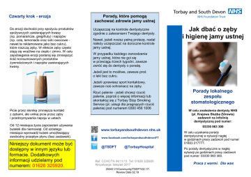 Czwarty krok - erozja Do erozji dochodzi przy spożyciu produktów spożywczych zawierających kwasy (np. pomarańcze, grejpfruty) i napojów (np. cola, lemoniada oraz soki owocowe nawet te reklamowane jako bez cukru), które niszczą zęby. W efekcie zęby często stają się wrażliwe na ciepło i zimno. W celu zapobiegania erozji postaraj się zmniejszyć ilość konsumowanych produktów żywnościowych i napojów zawierających kwasy. Porady, które pomogą zachować zdrowie jamy ustnej Uczęszczaj na kontrole dentystyczne zgodnie z zaleceniami Twojego dentysty. Nawet, jeżeli nosisz pełną protezę, nadal należy uczęszczać na doroczne kontrole jamy ustnej. Jak dbać o zęby i higienę jamy ustnej W przypadku każdego owrzodzenia jamy ustnej, które nie goi się w przeciągu trzech tygodni, zawsze zwróć się do dentysty o poradę. Jeżeli jest to możliwe, zawsze proś o leki bez cukru. Jeżeli uprawiasz sport kontaktowy, zawsze noś ochraniacz na zęby. Picie przez słomkę zmniejsza kontakt z zębami, ale unikaj picia przez zęby i przetrzymywania napoju w ustach. Od 12 miesiąca życia zaprzestań używania butelek dla niemowląt. Od szóstego miesiąca wprowadź kubek umożliwiający swobodny przepływ płynu (bez zastawek). Niniejszy dokument może być dostępny w innym języku lub formacie. Dodatkowych informacji udzielamy pod numerem: 01626 325920. Rzuć palenie - jeżeli chcesz rzucić palenie, poproś o więcej informacji lub skontaktuj się z Torbay Stop Smoking Service (pl. usługi dla pragnących rzucić palenie) pod numerem 0300 456 1006 www.torbayandsouthdevon.nhs.uk www.facebook.com/torbayandsouthdevonFT @TSDFT @TorbayHospital Ref: CCHC/TA 04/11/13 Tel: 01626 325920 Aktualizacja: listopad 2017 25343 V1/Community/TSDFT/02.17/ Review Date 02.19 Porady lokalnego zespołu stomatologicznego W celu znalezienia dentysty NHS (pl. Krajowa Służba Zdrowia) zadzwoń na infolinię dentystyczną pod numer: 03330 063 300 W celu uzyskania porady dentystycznej w sytuacji nagłej w godzinach pracy zadzwoń pod numer 01803 217777. Po porady dentystyczne w nagłej sytuacji po godzinach pracy zadzwoń pod numer: 03330 063 300. Praca z warmi. Dla was Pierwszy krok - szczotkowanie zębów Szczotkowanie zębów usuwa resztki pokarmu i bakterie, które mogą powodować próchnicę. W celu uzyskania najlepszych rezultatów wybierz szczoteczkę odpowiednią dla danej grupy wiekowej o małej/średniej wielkości główki i miękkiej/średniej twardości włosia. Szczoteczki elektryczne zapobiegają tworzeniu się kamienia nazębnego. Wybierz szczoteczkę z pojedynczą oscylującą główką. Zęby należy myć dwa razy dziennie - raz przed snem i drugi raz o innej porze. Większość osób zwykle myje zęby po śniadaniu. Wieczorem po myciu zębów nie wolno już nic jeść - wolno jedynie pić czystą wodę; dopuszczalne jest również mleko. Tabletki do wybarwiania płytki nazębnej (dostępne w aptekach) pozwolą sprawdzić, czy prawidłowo szczotkujesz zęby. Jeżeli masz problemy z utrzymaniem szczoteczki do zębów, lokalny zespół stomatologiczny poradzi, w jaki sposób można dostosować uchwyt. Do siódmego roku życia dziecka należy nadzorować mycie zębów. Drugi krok - pasta do zębów Pasta do zębów zawiera fluor, który wzmacnia zęby i chroni przed próchnicą. Różne pasty mają różne stężenie fluoru. Informacje o zawartości fluoru znajdują się na tubce i opakowaniu - jest to liczba podana w jednostkach „ppm” (części milionowe). Dzieci w wieku 0 - 3 lat Minimum 1000ppm. Używaj minimalnej ilości pasty poprzez delikatne otarcie główki szczoteczki o tubkę z pastą do zębów (zamiast wyciskania pasty na szczoteczkę do zębów). Dzieci w wieku 3 - 6 lat 1350-1500ppm. Na szczoteczkę nałóż odrobinę pasty wielkości groszku. Dzieci powyżej 6 r. ż. W przypadku dzieci powyżej szóstego roku życia jak i osób dorosłych nadal wystarcza pasta wielkości groszku. Niezależnie od grupy wiekowej należy wypluwać pastę. Bezpośrednio po wyszczotkowaniu zębów nie należy używać płynu do płukania ust, gdyż w ten sposób usuwa się ochronną warstwę fluoru z zębów. Trzeci krok - Zmniejsz spożycie cukru To częstotliwość spożywania cukru zwiększa ryzyko powstawania dziur w zębach, co może prowadzić do bólu zębów. Produkty żywnościowe i napoje zawierające cukier należy spożywać wyłącznie w czasie posiłków; w ten sposób zęby będą „atakowane” tylko trzy razy dziennie. Cukry, których należy unikać w czasie przekąsek, to: cukier, sacharoza, glukoza, maltoza, dekstroza, fruktoza, skrobia hydrolizowana, syrop kukurydziany, jasna melasa, brązowy cukier, miód, melasa i zagęszczone soki owocowe. Wybieraj „bezpieczne dla zębów” przekąski, takie jak ser, owoce, jogurty bez cukru, tosty, podpłomyki i paluszki. Ponieważ napoje często zawierają cukier, jedyne bezpieczne dla zębów napoje, które można spożywać pomiędzy posiłkami, to woda i mleko. Osoby dorosłe mogą również spożywać kawę i herbatę słodzoną sztucznymi środkami słodzącymi. Przez 20 minut po posiłku należy rzuć gumę bez cukru, najlepiej zawierającą ksylitol (nie należy podawać małym dzieciom / dzieciom pozostawionym bez nadzoru).