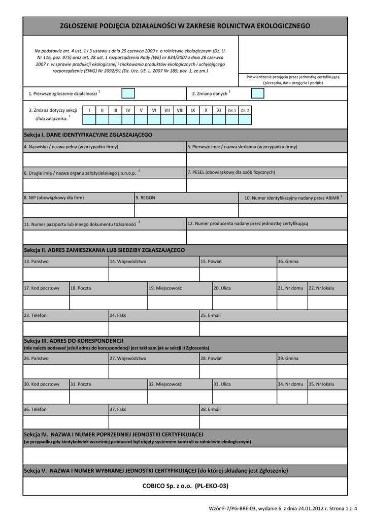 ZGŁOSZENIE PODJĘCIA DZIAŁALNOŚCI W ZAKRESIE ROLNICTWA EKOLOGICZNEGO Na podstawie art. 4 ust. 1 i 3 ustawy z dnia 25 czerwca 2009 r. o rolnictwie ekologicznym (Dz. U. Nr 116, poz. 975) oraz art. 28 ust. 1 rozporządzenia Rady (WE) nr 834/2007 z dnia 28 czerwca 2007 r. w sprawie produkcji ekologicznej i znakowania produktów ekologicznych i uchylającego rozporządzenie (EWG) Nr 2092/91 (Dz. Urz. UE. L. 2007 Nr 189, poz. 1, ze zm.) Potwierdzenie przyjęcia przez jednostkę certyfikującą (pieczątka, data przyjęcia i podpis) 1. Pierwsze zgłoszenie działalności 3. Zmiana dotyczy sekcji i/lub załącznika: I 1 II III IV V VI VII VIII 2. Zmiana danych 1 IX Zał. 1 X XI Zał. 2 1 Sekcja I. DANE IDENTYFIKACYJNE ZGŁASZAJĄCEGO 4. Nazwisko / nazwa pełna (w przypadku firmy) 5. Pierwsze imię / nazwa skrócona (w przypadku firmy) 6. Drugie imię / nazwa organu założycielskiego j.o.n.o.p. 8. NIP (obowiązkowy dla firm) 2 7. PESEL (obowiązkowy dla osób fizycznych) 10. Numer identyfikacyjny nadany przez ARiMR 3 9. REGON 11. Numer paszportu lub innego dokumentu tożsamości 4 12. Numer producenta nadany przez jednostkę certyfikującą Sekcja II. ADRES ZAMIESZKANIA LUB SIEDZIBY ZGŁASZAJĄCEGO 13. Państwo 17. Kod pocztowy 14. Województwo 18. Poczta 23. Telefon 15. Powiat 19. Miejscowość 24. Faks 20. Ulica 16. Gmina 21. Nr domu 22. Nr lokalu 25. E-mail Sekcja III. ADRES DO KORESPONDENCJI (nie należy podawać jeżeli adres do korespondencji jest taki sam jak w sekcji II Zgłoszenia) 26. Państwo 30. Kod pocztowy 36. Telefon 27. Województwo 31. Poczta 28. Powiat 32. Miejscowość 37. Faks 33. Ulica 29. Gmina 34. Nr domu 35. Nr lokalu 38. E-mail Sekcja IV. NAZWA I NUMER POPRZEDNIEJ JEDNOSTKI CERTYFIKUJĄCEJ (w przypadku gdy kiedykolwiek wcześniej producent był objęty systemem kontroli w rolnictwie ekologicznym) Sekcja V. NAZWA I NUMER WYBRANEJ JEDNOSTKI CERTYFIKUJĄCEJ (do której składane jest Zgłoszenie) COBICO Sp. z o.o. (PL-EKO-03) Wzór F-7/PG-BRE-03, wydanie 6 z dnia 24.01.2012 r. Strona 1 z 4 Zgłaszam do kontroli następujące kategorie działalności: 1 Sekcja VI. EKOLOGICZNA UPRAWA ROŚLIN I UTRZYMANIE ZWIERZĄT ekologiczna 5 zlecana konwencjonalna 6 39. Produkcja roślinna 40. Produkcja zwierzęca 41. Produkcja wegetatywnego materiału rozmnożeniowego i/lub nasion do celów uprawy Sekcja VII. ZBIÓR ZE STANU NATURALNEGO ekologiczna zlecana 5 konwencjonalna 6 ekologiczna zlecana 5 konwencjonalna 6 ekologiczna zlecana 5 konwencjonalna 6 5 konwencjonalna 6 42. Działalność w zakresie zbioru roślin dziko rosnących i ich części Sekcja VIII. PSZCZELARSTWO 43. Działalność w zakresie pszczelarstwa Sekcja IX. PRODUKTY AKWAKULTURY I WODOROSTY MORSKIE 44. Działalność w zakresie produkcji akwakultury 45. Działalność w zakresie produkcji wodorostów morskich Sekcja X. PRZETWÓRSTWO PRODUKTÓW EKOLOGICZNYCH ORAZ PRODUKCJA PASZ LUB DROŻDŻY Działalność w zakresie przetwórstwa/produkcji: ekologiczna zlecana 46. Artykułów rolno-spożywczych 47.Pasz 48. Drożdży Sekcja XI. WPROWADZANIE NA RYNEK PRODUKTÓW EKOLOGICZNYCH W TYM IMPORTOWANYCH Z PAŃSTW TRZECICH Działalność w zakresie wprowadzania na rynek produktów ekologicznych: ekologiczna zlecana 5 konwencjonalna 6 49. Wprowadzanie na rynek produktów ekologicznych (obrót wewnątrz UE) 50. Import z krajów trzecich wymienionych na liście będącej załącznikiem III do rozporządzenia Komisji (WE) Nr 1235/2008 51. Import z krajów trzecich nie wymienionych na liście będącej załącznikiem III do rozporządzenia Komisji (WE) Nr 1235/2008 52. Import z krajów trzecich, w których kontrola produkcji jest prowadzona przez jednostkę lub organ kontrolny wymieniony w załączniku IV do rozporządzenia Komisji (WE) nr 1235/2008 53. Eksport produktów ekologicznych poza UE Oświadczam, że: zapoznałam/zapoznałem się z obowiązującymi przepisami prawa dotyczącymi rolnictwa ekologicznego oraz zobowiązuję się do: - wykonywania czynności zgodnie z przepisami dotyczącymi rolnictwa ekologicznego, o których mowa w art. 2 ust. 5 ustawy z dnia 25 czerwca 2009 r. o rolnictwie ekologicznym (Dz.U.Nr 116, poz. 975); - zgłaszania każdej zmiany z zakresu danych objętych niniejszym Zgłoszeniem podjęcia działalności w zakresie rolnictwa ekologicznego. Wyrażam zgodę na objęcie prowadzonych przeze mnie działań systemem kontroli, o którym mowa w art. 27 rozporządzenia Rady (WE) nr 834/2007. Wyrażam zgodę na przetwarzanie przez wybraną jednostkę certyfikującą (wskazaną w sekcji V niniejszego Zgłoszenia) oraz przez Inspekcję Jakości Handlowej Artykułów Rolno-Spożywczych, moich danych osobowych i danych o prowadzonej przeze mnie działalności w rolnictwie ekologicznym do celów statystycznych oraz dla potrzeb systemu kontroli, o którym mowa w 7 ust. 1 ustawy o rolnictwie ekologicznym oraz w celu prowadzenia wykazu producentów, zgodnie z przepisami dotyczącymi rolnictwa ekologicznego. Data wypełnienia zgłoszenia Dzień Podpis (Imię i Nazwisko) zgłaszającego/osoby uprawnionej do reprezentacji/pełnomocnika* Miesiąc Rok *w przypadku złożenia podpisu przez pełnomocnika należy dołączyć pełnomocnictwo 1) zaznaczyć wybór znakiem "x" 2) j.o.n.o.p => jednostka organizacyjna nieposiadająca osobowości prawnej 3) wypełnia osoba fizyczna posiadająca numer identyfikacyjny nadany przez ARiMR 4) wypełnia osoba fizyczna nieposiadająca obywatelstwa polskiego 5) zaznaczyć jeżeli zgłoszona ekologiczna kategoria działalności jest zlecona w całości lub w części stronie trzeciej (podwykonawcy) 6)zaznaczyć jeżeli Zgłaszający prowadzi zarówno działalność ekologiczną jak i konwencjonalną w tej samej kategorii Wzór F-7/PG-BRE-03, wydanie 6 z dnia 24.01.2012 r. Strona 2 z 4 Załącznik 1 do Zgłoszenia podjęcia działalności w zakresie rolnictwa ekologicznego LOKALIZACJA OBIEKTÓW Lp. Rodzaj obiektu 7 Użytkownik obiektu, w którym prowadzona jest Wykorzystanie Województwo Powia