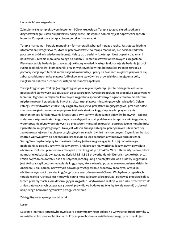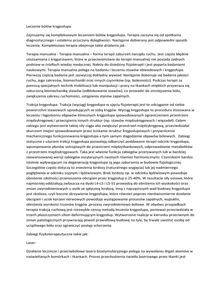 Leczenie bólów kręgosłupa. Zajmujemy się kompleksowym leczeniem bólów kręgosłupa. Terapia zaczyna się od spotkania diagnostycznego i ustaleniu przyczyny dolegliwości. Następnie dobierany jest odpowiedni sposób leczenia. Kompleksowa terapia obejmuje takie działania jak: Terapia manualna - Terapia manualna – forma terapii zaburzeń narządu ruchu. Jest często błędnie utożsamiana z kręgarstwem, które w przeciwieństwie do terapii manualnej nie posiada żadnych podstaw w źródłach wiedzy medycznej. Należy do dziedziny fizjoterapii i jest poparta badaniami naukowymi. Terapia manualna polega na badaniu i leczeniu stawów obwodowych i kręgosłupa. Pierwszą częścią badania jest zazwyczaj dokładny wywiad. Następnie dokonuje się badania jakości ruchu, jego zakresów, biomechaniki oraz innych czynników (np. bolesności). Podczas terapii za pomocą specjalnych technik mobilizacji lub manipulacji i pracy na tkankach miękkich przywraca się zaburzoną biomechanikę stawów (odblokowanie stawów), co prowadzi do zmniejszenia bólu, zwiększenia zakresu ruchomości, ustąpienia stanów zapalnych. Trakcja kręgosłupa- Trakcja (wyciąg) kręgosłupa w ujęciu fizjoterapii jest to odciąganie od siebie powierzchni stawowych sąsiadujących ze sobą kręgów. Wyciąg kręgosłupa to procedura stosowana w leczeniu i łagodzeniu objawów klinicznych kręgosłupa spowodowanych ograniczeniem przestrzeni międzykręgowej i przeciążenia innych struktur (np. stawów międzykręgowych i więzadeł). Celem zabiegu jest wytworzenie takiej siły ciągu aby zwiększyć przestrzeń międzykręgową, przeciwdziałać skurczom mięśni spowodowanym przez ściskanie struktur kręgosłupowych i przywrócenie mechanicznego funkcjonowania kręgosłupa a tym samym złagodzenie objawów bólowych. Zabiegi statyczne z użyciem trakcji kręgosłupa pozwalają odbarczyć poddawane terapii odcinki kręgosłupa, wpompowanie płynów ustrojowych do przestrzeni międzytkankowych, odprowadzenie metabolitów z przestrzeni międzykręgowych. Taka jest właśnie funkcja zabiegów przerywanych lub w bardziej zaawansowanej wersji zabiegów oscylacyjnych zwanych również harmonicznymi. Czynnikiem bardzo istotnie wpływającym na degenerację kręgosłupa są jego zaburzenia w budowie fizjologicznej. Szczególnie często dotyczy to zniesienia lordozy (naturalnego wygięcia) lub jej nadmiernego pogłębienia w odcinku szyjnym i lędźwiowym. Brak lordozy np. w odcinku lędźwiowym powoduje obniżenie zdolności przenoszenia obciążeń przez kręgosłup o 25-40%. W rezultacie siły osiowe, które najmocniej oddziałują zwłaszcza na dyski L4-L5 i L5-S1 prowadzą do obniżenia ich wyskokości oraz zmian zwyrodnieniowych u osób ze spłyconą lordozą. Inną z najczęstszych wad budowy kręgosłupa jest skolioza, czyli boczne skrzywienie kręgosłupa, które również poprzez nierównomierne działanie obciążeń i ucisk korzeni nerwowych powoduje występowanie procesów zapalnych, wypuklin, obniżenia wyrskości trzonów kręgów ,procesy zwyrodnieniowo-bólowe. W obydwu przypadkach terapia trakcją ruchową jest niezwykle cenną metodą leczenia kręgosłupa, ponieważ przeciwdziała w trzech płaszczyznach siłom deformującym kręgosłup. Wytworzone reakcje w kierunku przeciwnym do zmian patologicznych przywracają powoli prawidłową budowę na tyle, by trwale uwolnić osobę od uciążliwego bólu oraz ograniczyć postęp schorzenia. Zabiegi fizykoterapeutyczne takie jak: LaserDziałanie lecznicze i przeciwbólowe lasera biostymulacyjnego polega na wywołaniu drgań atomów w naświetlanych komórkach i tkankach. Proces przechodzenia światła laserowego przez tkanki jest procesem niezwykle skomplikowanym, a jest to wynik między innymi ich niejednorodnej budowy. Przechodząc przez poszczególne warstwy światło ulega odbiciu, rozproszeniu, transmisji, częściowej absorbcji. Stopień tych zjawisk zależy od rodzaju tkanek, długości fali promieniowania, energii i czasu oddziaływania, a także od kąta padania promieniowania na tkankę. Promieniowanie laserowe światło optyczne - przenikając w głąb tkanki zapoczątkowuje reakcję łańcuchową, która przekazuje wszystkie zachodzące efekty zabiegu leczniczego tkankom położonym głębiej. Światło laserowe może penetrować tkankę do głębokości kilku centymetrów. Efekty zachodzące w tkankach pod wpływem działania lasera biostymulacyjnego można podzielić na dwie grupy: efekty pierwotne efekty wtórne Efekty pierwotne to efekty, które dokonują się w tkankach bezpośrednio naświetlanych. Są one powodem powstania tak zwanych efektów wtórnych. Efekty pierwotne obejmują efekt biochemiczny, bioelektryczny i bioenergetyczny. Efekt biochemiczny wywołuje stymulację wydzielania histaminy i serotoniny. Może również stymulować lub hamować reakcje enzymatyczne kwasu ATP, którego wydzielanie może powodować przyspieszenie procesów mitozy. Efekt bioelektryczny normalizuje potencjał membrany. Każda komórka ma więcej ładunków ujemnych niż dodatnich, a potencjał wynosi od 60 do 90 miliwoltów. W patologicznych stanach potencjał ten spada w związku z przenikaniem przez membranę do wnętrza komórki jonów Na+. W celu odwrócenia tego procesu komórka potrzebuje energii, a może ją otrzymać np. z procesu hydrolizy kwasu ATP. Z kolei naświetlanie laserem stymuluje wydzielanie ATP. Efekt bioenergetyczny jest czynnikiem, który stymuluje odżywianie i wzrost komórek oraz reguluje liczne procesy międzykomórkowe. Efekty wtórne, będące końcowym wynikiem reakcji łańcuchowych zapoczątkowanych przez efekty pierwotne, obejmują efekt przeciwbólowy, przeciwzapalny i biostymulacyjny. Efekt przeciwbólowy powoduje liczne zjawiska, w tym wzmożenie wydzielania endorfin, stymulowanie regeneracji obwodowych aksonów po uszkodzeniu nerwów, hyperpolaryzację błon komórek nerwowych, zmiany stężeń transmiterów w synapsa