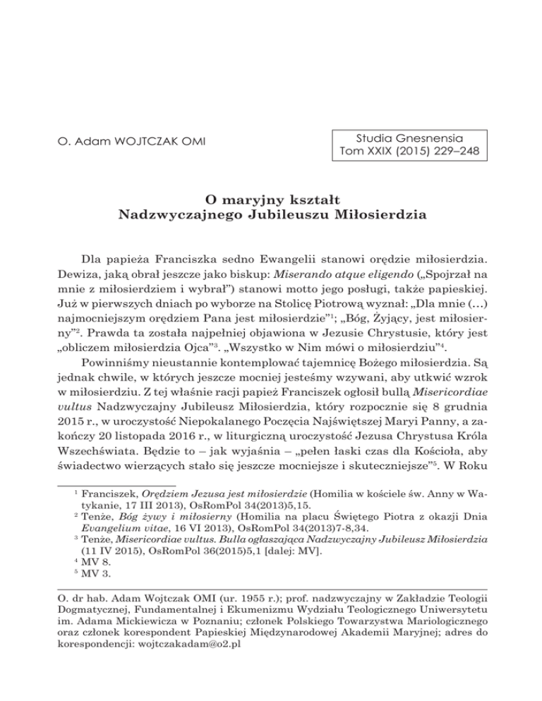O. Adam WOJTCZAK OMI Studia Gnesnensia Tom XXIX (2015) 229–248 O maryjny kształt Nadzwyczajnego Jubileuszu Miłosierdzia Dla papieża Franciszka sedno Ewangelii stanowi orędzie miłosierdzia. Dewiza, jaką obrał jeszcze jako biskup: Miserando atque eligendo („Spojrzał na mnie z miłosierdziem i wybrał”) stanowi motto jego posługi, także papieskiej. Już w pierwszych dniach po wyborze na Stolicę Piotrową wyznał: „Dla mnie (…) najmocniejszym orędziem Pana jest miłosierdzie”1; „Bóg, Żyjący, jest miłosierny”2. Prawda ta została najpełniej objawiona w Jezusie Chrystusie, który jest „obliczem miłosierdzia Ojca”3. „Wszystko w Nim mówi o miłosierdziu”4. Powinniśmy nieustannie kontemplować tajemnicę Bożego miłosierdzia. Są jednak chwile, w których jeszcze mocniej jesteśmy wzywani, aby utkwić wzrok w miłosierdziu. Z tej właśnie racji papież Franciszek ogłosił bullą Misericordiae vultus Nadzwyczajny Jubileusz Miłosierdzia, który rozpocznie się 8 grudnia 2015 r., w uroczystość Niepokalanego Poczęcia Najświętszej Maryi Panny, a zakończy 20 listopada 2016 r., w liturgiczną uroczystość Jezusa Chrystusa Króla Wszechświata. Będzie to – jak wyjaśnia – „pełen łaski czas dla Kościoła, aby świadectwo wierzących stało się jeszcze mocniejsze i skuteczniejsze”5. W Roku Franciszek, Orędziem Jezusa jest miłosierdzie (Homilia w kościele św. Anny w Watykanie, 17 III 2013), OsRomPol 34(2013)5,15. 2 Tenże, Bóg żywy i miłosierny (Homilia na placu Świętego Piotra z okazji Dnia Evangelium vitae, 16 VI 2013), OsRomPol 34(2013)7-8,34. 3 Tenże, Misericordiae vultus. Bulla ogłaszająca Nadzwyczajny Jubileusz Miłosierdzia (11 IV 2015), OsRomPol 36(2015)5,1 [dalej: MV]. 4 MV 8. 5 MV 3. 1 O. dr hab. Adam Wojtczak OMI (ur. 1955 r.); prof. nadzwyczajny w Zakładzie Teologii Dogmatycznej, Fundamentalnej i Ekumenizmu Wydziału Teologicznego Uniwersytetu im. Adama Mickiewicza w Poznaniu; członek Polskiego Towarzystwa Mariologicznego oraz członek korespondent Papieskiej Międzynarodowej Akademii Maryjnej; adres do korespondencji: [email protected] 230 O. Adam WOJTCZAK OMI Miłosierdzia chodzi więc nie tylko o wyjątkowe doświadczenie miłosiernej miłości Boga, ale także o życie nią i świadczenie jej innym. Szczególny udział w głoszeniu Bożego miłosierdzia posiada Maryja. „Nikt nie poznał tak jak Ona – uzasadnia Franciszek – głębi tajemnicy Boga, który stał się człowiekiem. Wszystko w Jej życiu zostało ukształtowane przez obecność miłosierdzia, które stało się ciałem. Matka Ukrzyżowanego i Zmartwychwstałego weszła do sanktuarium miłosierdzia Bożego, ponieważ duchowo uczestniczyła w tajemnicy Jego miłości”6. Z tego względu papież nazywa Ją „Matką miłosierdzia” i zawierza Jej Rok Miłosierdzia: „Słodycz Jej spojrzenia niech nam towarzyszy w tym Roku Świętym, abyśmy wszyscy potrafili odkryć radość z czułości Boga”7. Przy innej okazji dopowiada: „Zawierzamy (…) ten Rok Matce miłosierdzia, by skierowała na nas swoje spojrzenie i czuwała nad nami w drodze: w naszej drodze pokutnej, naszej drodze z otwartym sercem, przez rok, abyśmy otrzymali odpust Boży, abyśmy otrzymali Boże miłosierdzie”8. W niniejszym artykule pragnę odczytać teologiczną wymowę tytułu „Matka miłosierdzia” na podstawie samej bulli Misericordiae vultus, a także sięgając do wielu innych wypowiedzi Franciszka, które ubogacają lub rozwijają maryjne treści zawarte w dokumencie ogłaszającym Rok Miłosierdzia. Konkretnie chodzi o to, aby ukazać dlaczego i w jakim sensie Maryja może pomóc Kościołowi w owocnym przeżyciu tego Roku, czyli doświadczeniu przez niego Bożego miłosierdzia, by następnie żyć nim i przybliżać wszystkich do jego zdrojów. 1.Maryja – szczególnie obdarowana miłosierdziem i „zasługująca” na nie Franciszek stwierdza w bulli, że mówiąc o Maryi jako Matce miłosierdzia, widzimy w Niej nade wszystko Tę, która doświadczywszy miłosierdzia w sposób wyjątkowy („ukształtowana przez obecność miłosierdzia, które stało się ciałem”), w podobny sposób „zasłużyła” na miłosierdzie całym swym życiem („Matka Ukrzyżowanego i Zmartwychwstałego weszła do sanktuarium miłosierdzia Bożego, ponieważ duchowo uczestniczyła w tajemnicy Jego miłości”). Z tejże racji została powołana do przybliżania ludziom miłosiernej miłości, jaką Jej Syn przyszedł im objawić. MV 24. Tamże. Por. również S.M. Maggiani, La „Mater Misericordiae” nel Giubileo straordinario della misericordia. Ricordando i 50 anni dalla chiusura del Concilio Vaticano II, Marianum 77(2015)13-16. 8 Franciszek, „Bądźcie miłosierni jak Ojciec” (Przemówienie podczas nabożeństwa pokutnego w Bazylice Watykańskiej, 13 III 2015), OsRomPol 36(2015)3-4,5. 6 7 O maryjny kształt Nadzwyczajnego Jubileuszu Miłosierdzia 231 a)Ukształtowana przez Boże miłosierdzie Bóg „bogaty w miłosierdzie” (Ef 2,4) działa od początków naszej historii. Tym bardziej po grzechu Adama i Ewy nie chciał, aby ludzkość została sama, wystawiona na pastwę zła. Toteż na bezmiar grzechu odpowiada pełnią przebaczenia. Miłosierdzie okazuje się zawsze większe od każdego grzechu i nikt nie może zatamować miłości Boga, który przebacza9. Objawienie pośród wielkich dzieł Bożego miłosierdzia sytuuje Maryję. Jawi się Ona w pełni zbawczego czasu jako wybrana Córa Ojca, o czym czytamy w Liście do Galatów 4,4-6. Słowa te, sławiące zbawczą miłość Boga Ojca wobec świata, stanowią syntezę Jego zbawczej misji. Bóg postanowił i zechciał, aby Maryja, święta i nieskalana w miłości (por. Ef 1,4), stała się Matką Odkupiciela człowieka10. Stąd pierwszym aktem Jego zbawczego działania wobec Niej było Jej niepokalane poczęcie. „Na Niej – stwierdza papież – spoczęło spojrzenie Pana, który Ją wybrał, żeby była M