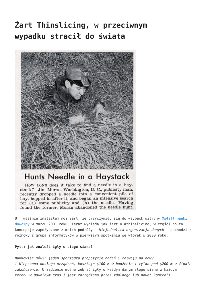 Żart Thinslicing, w przeciwnym wypadku stracił do świata Uff właśnie znalazłem mój żart, że przyczyniły się do wayback witryny Xs4all nauki dowcipy w marcu 2001 roku. Teraz wygląda jak żart o #thinslicing, w części bo to koncepcje zapożyczone z moich podróży – Niejednolita organizacja danych – pochodzi z rozmowy z grupą informatyków w pierwszym spotkaniu we wtorek w 2000 roku: Pyt.: jak znaleźć igły w stogu siana? Naukowiec mówi: jeden sporządza propozycję badań i rozwoju na nowy i Ulepszona obsługa urządzeń, kosztuje $100 m w budżecie i tylko pod $200 m w finale zakończenie. Urządzenie można zebrać igły w każdym danym stogu siana w każdym terenu w dowolnym czas i jest zarządzana przez zdalnego lub nawet kontroli. Chaotician mówi: obliczu Niejednolita organizacja danych montaż grono znajomych (powiedzmy 10 lub mniej lub może więcej, jeśli jest wolna alkohol) i przytrzymaj stroną na stogu siana. Ktoś będzie zobowiązany do znalezienia Igła wstępnej lub siedzi na jej temat. Lub jeśli nie coś bardziej dziwne + ciekawe pojawi się, tak, że igła jest klasyfikowany jako wariant siana słomy. I nowe odkrycie sklasyfikowane jako dziwny Atraktor. Różnica między jak klienci i przemysłu myśleć i mówić Żargon klienta: "Bo widzisz. nie robi ' nikt nie wiedzą, że jest Bogiem, wiesz, bo mam na myśli widziałem bogów czarny, różowy bogów, biały bogów. wszystkie kolor bogów, i nikt nie wie naprawdę Boga. An' gdy one być sayin ', jeśli jesteś dobry, idziesz t'heaven, tha bzdury, bo nie jest Goin ' do nie nieba, bo nie ma nieba, aby przejść do. Przemysł typem języka: 1. Każdy człowiek ma inny pomysł jak jest Bóg. 2. W związku z tym nikt nie bardzo wie, że Bóg istnieje. 3. Jeśli istnieje niebo, to było robione przez Boga. 4. Jeśli Bóg nie istnieje on/ona nie może się nieba. 5. W związku z tym niebie nie istnieje. 6. Nie można przejść do gdzieś, że nie istnieje. Jest to dobry przykład ostatnich to w poście "Witty uwag na temat oczekiwań klientów" który wyraża to pod kątem wyboru produktu. I sugerują, że jeden most między jak klienci i przemysłu myślenia i mówienia jest efektywne wykorzystanie mediów społecznych. Pomaga zrozumieć, co klient widzi w produkcie, nie tylko inżynierowie za pomocą narzędzie, takie jak Radian6. Na przykład ma że nowy aparat trafić sweet spot ze względu na techniczne wyższość czujnika na własną rękę – czy bo to jest czujnik + w połączeniu z funkcją wifi + w połączeniu z dzielenia się z kolegów? Czytam książki Erica podczas mojej głowie ogolone i wszystko, co można zrobić to śmiać się?