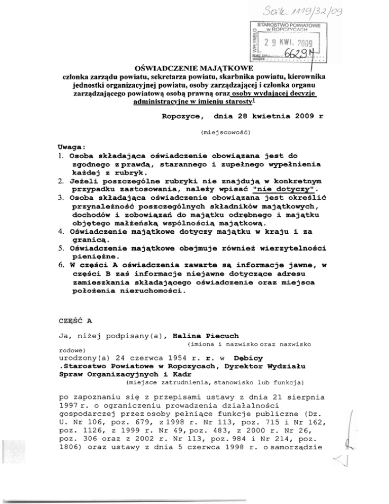 ~SWIADCZENIE MAJ~TKOWE I czlonka zanqdu powiatu, sekretana powiatu, skarbnika powiatu, kierownika jednostki organizacyjnej powiatu, osoby zanqdzajqcej i czlonka organu zanqdzajqcego powiatowq osobq prawnq oraz osobv wvdaiacei decvzie administracyine w imieniu starostyl Ropczyce, dnia 28 kwietnia 2009 r (miejscowo8C) Uwaga : 1. Osoba skzadajqca oswiadczenie obowiqzana jest do zgodnego zprawdq, starannego i zupelnego ~ e z n i e n i a kaidej z rubryk. 2. Jeieli poszczegolne rubryki nie znajdujq w konkretnym przypadku zastosowania, naleiy wpisac "nie dotyczy". 3. Osoba skzadajqca oswiadczenie obowiqzana jest okreslic przynaleinosc poszczegolnych skzadnikow majqtkowych, dochodow i zobowiqzan do majqtku odrenego i majqtku objgtego mazienskq wspolnosciq majqtkowq. 4. Oswiadczenie majqtkowe dotyczy majqtku w kraju i za granicq. 5. Oswiadczenie majqtkowe obejmuje rowniei wierzytelnosci pienieine. 6. W czesci A oswiadczenia zawarte sq informacje jawne, w czesci B zas informacje niejawne dotyczqce adresu zamieszkania skzadajqcego oswiadczenie oraz miejsca pozoienia nieruchomosci. Ja, niiej podpisany(a), Halina Piecuch (imiona i nazwiskooraz nazwisko rodowe) urodzony (a) 24 czerwca 1954 r. r. w Deity .Starostwo Powiatowe w Ropczycach, Dyrektor Wydziazu Spraw Organizacyjnych i Kadr (miejsce zatrudnienia, stanowisko lub funkcja) po zapoznaniu sie z przepisami ustawy z dnia 21 sierpnia 1997 r. o ograniczeniu prowadzenia dziakalnoSci gospodarczej przez osoby pekniace funkcje publiczne (Dz. U. Nr 106, poz. 679, z 1998 r. Nr 113, poz. 715 i Nr 162, poz. 1126, z 1999 r. Nr 49,poz. 483, z 2000 r. Nr 26, poz. 306 oraz z 2002 r. Nr 113, poz. 984 i Nr 214, poz. 1806) oraz ustawy z dnia 5 czerwca 1998 r. osamorzadzie powiatowym (Dz. U. z 2001 r. Nr 142, poz. 1592 orazz 2002 r. Nr 23, poz. 220, Nr 62, poz. 558, Nr 113, poz. 984, Nr 153, poz. 1271, Nr 200, poz. 1688 i Nr 214, poz. 1806), zgodnie z art. 25c tej ustawy oSwiadczam, ie posiadam wchodzacew skkad malieriskiej wsp6lnosci majqtkowej lub stanowiace m6j majatek odrebny: Zasoby pienieine: - Srodki pienieine zgromadzone w walucie polskiej: nie dotyczy - srodki pienieine zgromadzone w walucie obcej: nie dotyczy - papiery wartoSciowe: nie dotyczy na kwote: nie dotyczy 11. 1. Dom o powierzchni:llO m2, o warto5ci:lSO 0 0 0 ~ 2 tytuk prawny: malienska wspolnosc majqtkowa 2. Mieszkanie o powierzchni: nie dotyczy m2, o wartoSci: nie dotyczy tytuk prawny: nie dotyczy 3. Gospodarstwo rolne: rodzaj gospodarstwa: nie dotyczy, p0wierzchnia:nie dotyczy o wartosci: nie dotyczy rodzaj zabudowy: nie dotyczy tytuk prawny: nie dotyczy Z tego tytuku osiagnakem(ekam) w roku ubiegkym przych6d nie dotyczy idochod w wysokoSci: nie dotyczy 4. Inne nieruchomoSci: powierzchnia: 4a/ garai w budowie ok.30 m kw. 4b/ dziaxka na ktorsj stoi dom i garai tytuk prawny: 4a/ maxienska wspo1no66 majatkowa 4b/ maXienka wspolnosc majatkowa; i 111. Posiadam udziaky w sp6kkach handlowych - naleiy podaC liczbe i emitenta udziak6w: nie dotyczy i' udziaky te stanowia pakiet wiekszy nii 10% udziakbw w h 1 ir