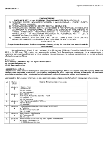 Dąbrowa Górnicza 15.02.2013 r. ZP/01/ZS7/2013 1) 2) 3) 4) ZAWIADOMIENIE ZGODNIE Z ART. 92 ust. 1 USTAWY PRAWO ZAMÓWIEŃ PUBLICZNYCH O: WYBORZE OFERTY NAJKORZYSTNIEJSZEJ I WYKONAWCACH, KTÓRZY ZŁOŻYLI OFERTY (wraz z punktacją), WYKONAWCACH, KTÓRYCH OFERTY ZOSTAŁY ODRZUCONE, WYKONAWCACH, KTÓRZY ZOSTALI WYKLUCZENI Z POSTĘPOWANIA O UDZIELENIE ZAMÓWIENIA W POSTĘPOWANIU O UDZIELENIE ZAMÓWIENIA PUBLICZNEGO W TRYBIE PRZETARGU NIEOGRANICZONEGO O WARTOŚCI PONIŻEJ KWOT OKREŚLONYCH W PRZEPISACH WYDANYCH NA PODSTAWIE ART. 11 UST. 8 USTAWY PRAWO ZAMÓWIEŃ PUBLICZNYCH TERMINIE, OKREŚLONYM ZGODNIE Z ART. 94 UST. 1 LUB 2, PO KTÓRYM UPŁYWIE UMOWA W SPRAWIE ZAMÓWIENIA PUBLICZNEGO MOŻE BYĆ ZAWARTA NA ZADANIE PN.: „Zorganizowanie wyjazdu śródrocznego tzw. zielonej szkoły dla uczniów klas trzecich szkoły podstawowej” Na podstawie art. 92 ust. 1 pkt. 1 ustawy z dnia 29 stycznia 2004 roku Prawo Zamówień Publicznych (Dz. U. z 2010 r. Nr 113, poz. 756 z późn. zm., zwana dalej ustawą Pzp), Zamawiający zawiadamia, że w postępowaniu o udzielenie zamówienia publicznego w trybie przetargu nieograniczonego na zadanie o przedmiocie jw. została wybrana oferta złożona przez Firmę: Oferta nr 6 Biuro Podróży „PARTNER” Sp.z o.o. Spółka Komandytowa Al. Józefa Piłsudskiego 92 41-308 Dąbrowa Górnicza Uzasadnienie wyboru Jedyna ważna oferta spośród złożonych do postępowania przetargowego. Wykonawca spełnił wszystkie wymogi SIWZ oraz ustawy Prawo zamówień publicznych, które zostały zweryfikowane przez Członków Komisji Przetargowej na podstawie przedłożonych dokumentów i oświadczeń potwierdzających spełnienie warunków udziału w postępowaniu. Jednocześnie Zamawiający informuje, że do przedmiotowego postępowania oferty złożyli następujący Wykonawcy: Lp Numer oferty 1 oferta nr 1 2 oferta nr 2 3 oferta nr 3 4 oferta nr 4 5 oferta nr 5 6. oferta nr 6 Nazwa (firma) i adres wykonawcy Gastro – Tour Jarosław Ruta 72-300 Gryfice Ul. Warszawska 27 BUS MEDIA s.c. Piotr Polok, Aleksandra Zielińska – Polok Ul. Pukowca 15 40- 847 Katowice Biuro Turystyczne LUBATUR Sp.j. 42-500 Bedzin Ul. Podwale 2 Ośrodek Rehabilitacyjno – Wczasowy SŁOWINIEC w Poddąbiu Ul. Promenada Słońca 24 76-270 Ustka Biuro Podróży „MARMARA” Ul. Piotrkowska 92 90-103 Łódź Biuro Podróży „PARTNER” Sp.z o.o. Spółka Komandytowa Al. Józefa Piłsudskiego 92 41-308 Dąbrowa Górnicza Streszczenie oceny i porównania złożonych ofert zawierające punktacje przyznaną ofertom w każdym kryterium oceny ofert i łączna punktację. Nr oferty / nazwa wykonawcy Liczba pkt w kryterium „Cena brutto za organizację wypoczynku dla jednego ucznia” waga 94 % Liczba pkt w kryterium „Dodatkowa atrakcyjność programu kult. – sport” waga 6 % Razem pkt 94 pkt 6 pkt 100 pkt Oferta nr 6 Biuro Podróży „PARTNER” Sp.z o.o. Spółka Komandytowa Al. Józefa Piłsudskiego 92 41-308 Dąbrowa Górnicza Podpisał Dyrektor Szkoły Ewa Stawicka