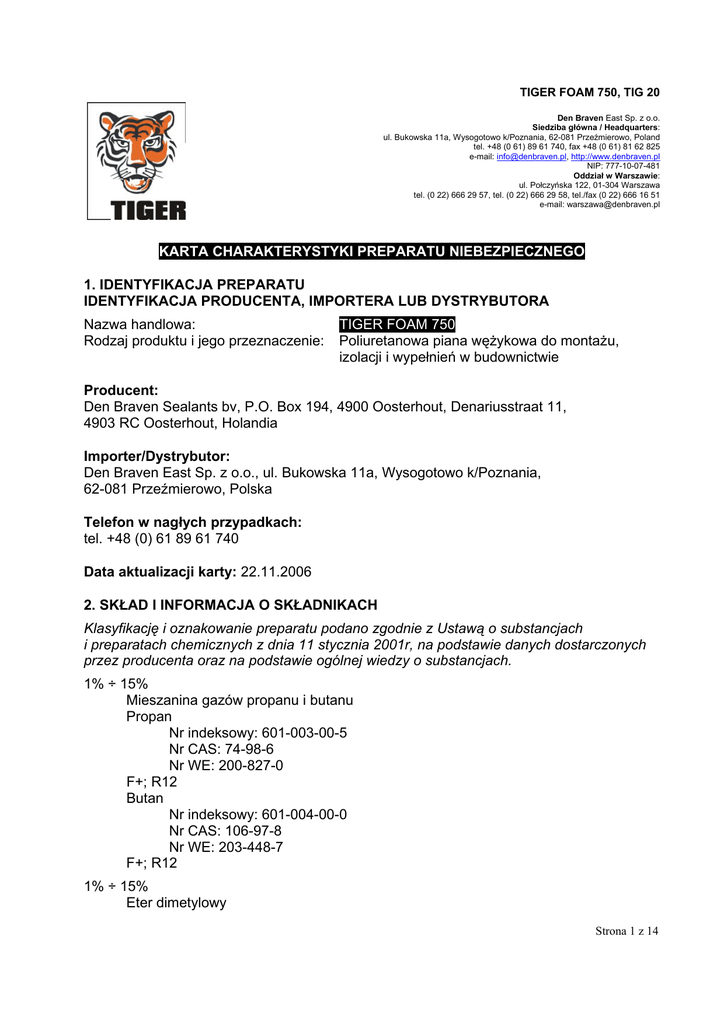 TIGER FOAM 750, TIG 20 Den Braven East Sp. z o.o. Siedziba główna / Headquarters: ul. Bukowska 11a, Wysogotowo k/Poznania, 62-081 Przeźmierowo, Poland tel. +48 (0 61) 89 61 740, fax +48 (0 61) 81 62 825 e-mail: [email protected], http://www.denbraven.pl NIP: 777-10-07-481 Oddział w Warszawie: ul. Połczyńska 122, 01-304 Warszawa tel. (0 22) 666 29 57, tel. (0 22) 666 29 58, tel./fax (0 22) 666 16 51 e-mail: [email protected] KARTA CHARAKTERYSTYKI PREPARATU NIEBEZPIECZNEGO 1. IDENTYFIKACJA PREPARATU IDENTYFIKACJA PRODUCENTA, IMPORTERA LUB DYSTRYBUTORA Nazwa handlowa: Rodzaj produktu i jego przeznaczenie: TIGER FOAM 750 Poliuretanowa piana wężykowa do montażu, izolacji i wypełnień w budownictwie Producent: Den Braven Sealants bv, P.O. Box 194, 4900 Oosterhout, Denariusstraat 11, 4903 RC Oosterhout, Holandia Importer/Dystrybutor: Den Braven East Sp. z o.o., ul. Bukowska 11a, Wysogotowo k/Poznania, 62-081 Przeźmierowo, Polska Telefon w nagłych przypadkach: tel. +48 (0) 61 89 61 740 Data aktualizacji karty: 22.11.2006 2. SKŁAD I INFORMACJA O SKŁADNIKACH Klasyfikację i oznakowanie preparatu podano zgodnie z Ustawą o substancjach i preparatach chemicznych z dnia 11 stycznia 2001r, na podstawie danych dostarczonych przez producenta oraz na podstawie ogólnej wiedzy o substancjach. 1% ÷ 15% Mieszanina gazów propanu i butanu Propan Nr indeksowy: 601-003-00-5 Nr CAS: 74-98-6 Nr WE: 200-827-0 F+; R12 Butan Nr indeksowy: 601-004-00-0 Nr CAS: 106-97-8 Nr WE: 203-448-7 F+; R12 1% ÷ 15% Eter dimetylowy Strona 1 z 14 TIGER FOAM 750, TIG 20 Nr indeksowy: 603-019-00-8 Nr CAS: 115-10-6 Nr WE: 204-065-8 F+; R12 30% ÷ 45% Izomery i homologi diizocyjanianu 4,4’-metylenodifenylu - substancje są polimerami Nr indeksowy: brak Nr CAS: 9016-87-9 Nr WE: brak Xn; R20; Xi; R36/37/38; R42/43 Znaczenie symboli i treść zwrotów R – patrz p. 16. 3. IDENTYFIKACJA ZAGROŻEŃ Zgodnie z obowiązującymi przepisami (patrz p. 15) produkt jest zaklasyfikowany jako niebezpieczny. Zagrożenia fizykochemiczne: produkt jest skrajnie łatwopalnym preparatem w sprayu pary tworzą palne i wybuchowe mieszaniny z powietrzem w trakcie spalania wydzielają się toksyczne gazy, pary i dymy Zagrożenia dla zdrowia: Uwaga: Produkt zawiera poliizocyjaniany. Zapoznaj się z instrukcją dostarczoną przez producenta. - produkt jest szkodliwy produkt działa szkodliwie przez drogi oddechowe produkt jest drażniący produkt działa drażniąco na oczy, drogi oddechowe i skórę produkt może być uczulający produkt może powodować uczulenie w następstwie narażenia drogą oddechową i w kontakcie ze skórą Zagrożenia dla środowiska: unikać zrzutów do środowiska postępować zgodnie z instrukcją lub kartą charakterystyki może działać szkodliwie na środowisko wodne produkt ulega powolnej biodegradacji Inne zagrożenia: Uwaga! Pojemnik pod ciśnieniem. Chronić przed promieniami słonecznymi i temperaturami powyżej 50oC (np. ciepłem pochodzącym z żarówki). Także po zużyciu nie otwierać gwałtownie ani nie spalać. Nie rozpylać w kierunku płomienia ani żarzących się przedmiotów. Trzymać z dala od źródeł ognia. Nie palić tytoniu. zawiera do 30% wagowych składników skrajnie łatwopalnych w przypadku braku wystarczającej wentylacji możliwe jest tworzenie się mieszanin wybuchowych trzymać w miejscu niedostępnym dla dzieci 4. PIERWSZA POMOC Strona 2 z 14 TIGER FOAM 750, TIG 20 Wskazania ogólne: W przypadku wystąpienia jakichkolwiek niepokojących objawów wezwać natychmiast lekarza lub odwieźć poszkodowanego do szpitala, pokazać opakowanie preparatu, etykietę lub kartę charakterystyki. Pierwsza pomoc przy narażeniu inhalacyjnym: osobę poszkodowaną wynieść ze skażonej atmosfery w razie potrzeby zastosować sztuczne oddychanie osobie poszkodowanej zapewnić spokój, chronić przed utratą ciepła w przypadku wystąpienia niepokojących objawów wezwać lekarza Pierwsza pomoc przy skażeniu oczu: usunąć szkła kontaktowe przemywać oczy dużą ilością letniej wody, co najmniej 15 min. (przy odwiniętych powiekach), unikać silnego strumienia wody ze względu na ryzyko uszkodzenia rogówki, w przypadku zanieczyszczenia jednego oka chronić w trakcie przemywania drugie oko przed zanieczyszczeniem konieczna konsultacja okulistyczna Uwaga: Osoby narażone na skażenie oczu powinny być pouczone o konieczności i sposobie ich natychmiastowego płukania. Pierwsza pomoc przy skażeniu skóry: zdjąć skażoną odzież, przemywać skórę dużą ilością wody z mydłem w razie wystąpienia podrażnienia skóry lub uczulenia zapewnić poszkodowanemu konsultację dermatologiczną Pierwsza pomoc przy przyjęciu doustnym: ze względu na postać (aerozol) połknięcie jest mało prawdopodobne jeśli poszkodowany jest przytomny powinien wypłukać jamę ustną wodą nie wywoływać wymiotów w przypadku, gdy osoba poszkodowana wymiotuje, skierować jej głowę w dół, w celu uniknięcia zachłyśnięcia się wymiocinami nie podawać do picia mleka, roślinnych lub zwierzęcych kwasów tłuszczowych (olejów) natychmiast skonsultować się z lekarzem, pokazać opakowanie, etykietę lub kartę charakterystyki osobie poszkodowanej zapewnić spokój, chronić przed utratą ciepła 5. POSTĘPOWANIE W PRZYPADKU POŻARU Zagrożenia pożarowe: produkt jest skrajnie łatwopalnym preparatem w sprayu pary tworzą palne i wybuchowe mieszaniny z powietrzem w trakcie spalania wydzielają się toksyczne gazy, pary i dymy pary są cięższe od powietrza i mogą unosić się nad ziemią lub podłogą i powracać do źródła zapłonu istnieje niebezpieczeństwo wybuchu pojemnika Zalecane środki gaśnicze: ditlenek węgla (gaśnica śniegowa), proszek gaśniczy, prądy wodne rozproszone, piana gaśnicza odporna na działanie alkoholu nie stosować zwartych strumieni wodnych. Inne zagrożenia: Strona 3 z 14 TIGER FOAM 750, TIG 20 - Uwaga! Pojemnik pod ciśnieniem. Chronić przed promieniami słonecznymi 