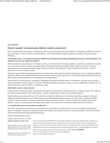 Nowe zasady wystawiania faktur należy poprawić - - Gazeta Prawna - ... 1z1 http://www.gazetaprawna.pl/drukowanie/632453 trzy pytania Nowe zasady wystawiania faktur należy poprawić Prawo do odliczenia ma powstawać w rozliczaniu za okres, w którym powstał obowiązek podatkowy u sprzedawcy, jednak nie wcześniej niż w rozliczeniu za okres, w którym otrzymano fakturę - mówi Joanna Rudzka, doradca podatkowy, menedżer w Kancelarii Ożóg i Wspólnicy. Nowelizacja ustawy o VAT, opracowana przez Ministerstwo Finansów, przewiduje modyfikacje dotyczące wystawiania faktur. Jak wpłynie to na prawo do odliczenia podatku? Prawo do odliczenia ma powstawać w rozliczaniu za okres, w którym powstał obowiązek podatkowy u sprzedawcy, jednak nie wcześniej niż w rozliczeniu za okres, w którym otrzymano fakturę. Obowiązek podatkowy powstanie z kolei z upływem miesiąca, w którym dokonano dostawy towaru lub wykonano usługę. Wystawienie faktury ma nastąpić do 7. dnia od zakończenia miesiąca, w którym dostarczono towar lub wykonano usługę. Projekt nie zawiera jednak regulacji dotyczących wystawiania faktur przed terminem (obecnie funkcjonują one przy niektórych rodzajach sprzedaży). Można z tego wyprowadzić dwa sprzeczne wnioski: albo nie będzie ograniczeń w wystawianiu faktur przed końcem miesiąca, albo w ogóle nie będzie możliwości wcześniejszego wystawiania faktury. Jeżeli trzymać się ściśle przepisów, to podatnicy będą faktycznie kredytowali Skarb Państwa. Przykładowo: sprzedaż towaru wystąpi w styczniu, sprzedawca wystawi fakturę 7-go lutego. Obowiązek podatkowy powstanie u niego w styczniu, jednak prawo do odliczenia z tej faktury powstanie u nabywcy dopiero w rozliczeniu za luty. Jakie będzie wyjście z takiej sytuacji? Logiczne byłoby wystawianie faktur wcześniej tak, aby nabywca miał możliwość rozliczyć je jeszcze w miesiącu zakupu. Nie wydaje się też właściwe kazać klientowi, który zrobił zakupy w sklepie i zażądał faktury, czekać na nią do końca miesiąca. Projekt jednak nie precyzuje tych kwestii. W konsekwencji można się obawiać, czy nie rozwinie się praktyka, uznająca wystawienie faktury przed końcem miesiąca za tzw. fakturę pustą (tj. nie dokumentującą żadnej transakcji). W mojej ocenie, wykładnia literalna i systemowa nowych przepisów wskazuje na możliwość takiego określenia terminów wystawiania faktur, aby uniknąć negatywnych skutków u nabywcy. Zatem przepisy należałoby takk rozumieć, aby możliwe było wystawianie faktur przed końcem miesiąca. Czy projekt doprecyzować, aby uniknąć wątpliwości? Tak. Warto, aby materia ta została jasno sprecyzowana przez ustawodawcę, tak żeby potem nie była ona przedmiotem interpretacji i sporów. Przykładowo, dobrym rozwiązaniem byłoby wprowadzenie, jako zasady, możliwości wystawiania faktur w dowolnym terminie, przed momentem powstania obowiązku podatkowego. Źródło: Dziennik Gazeta Prawna Artykuł z dnia: 2012-07-13, ostatnia aktualizacja: 2012-07-13 07:45 Na serwisach internetowych INFOR PL S.A i jej spółek zależnych są wykorzystywane pliki cookies. Stosujemy je w Autor: Magdalena Majkowska celach zapewnienia maksymalnej wygody użytkowników przy korzystaniu z naszych serwisów (zapamiętywanie preferencji stronach, zbieranie anonimowych danych dla celów reklamowych i statystycznych). Żadna część jak i całość utworów zawartych w dziennikui ustawień nie może na byćnaszych powielana i rozpowszechniania lub dalej rozpowszechniana w jakiejkolwiek formie i w jakikolwiek sposób (w tym także elektroniczny lub mechaniczny lub inny albo na wszelkich polach eksploatacji) włącznie z kopiowaniem, szeroko digitalizacją, Użytkownik ma możliwość samodzielnej zmiany ustawień dotyczących cookies w swojej przeglądarcepojętą internetowej. fotokopiowaniem lub kopiowaniem, w tym także zamieszczaniem w Internecie - bez pisemnej zgody Infor Biznes Sp. z o.o. Jeżeli wyrażasz zgodę na zapisywanie informacji zawartej w cookies kliknij w Zamknij. Jeżeli nie wyrażasz zgody - zmień ustawienia swojej przeglądarki. Jakiekolwiek użycie lub wykorzystanie utworów w całości lub w części bez zgody Infor Biznes Sp. z o.o. lub autorów z naruszeniem prawa jest zabronione pod groźbą Przeczytaj naszą Politykę Prywatności. kary i może być ścigane prawnie. 2013-08-13 16:39