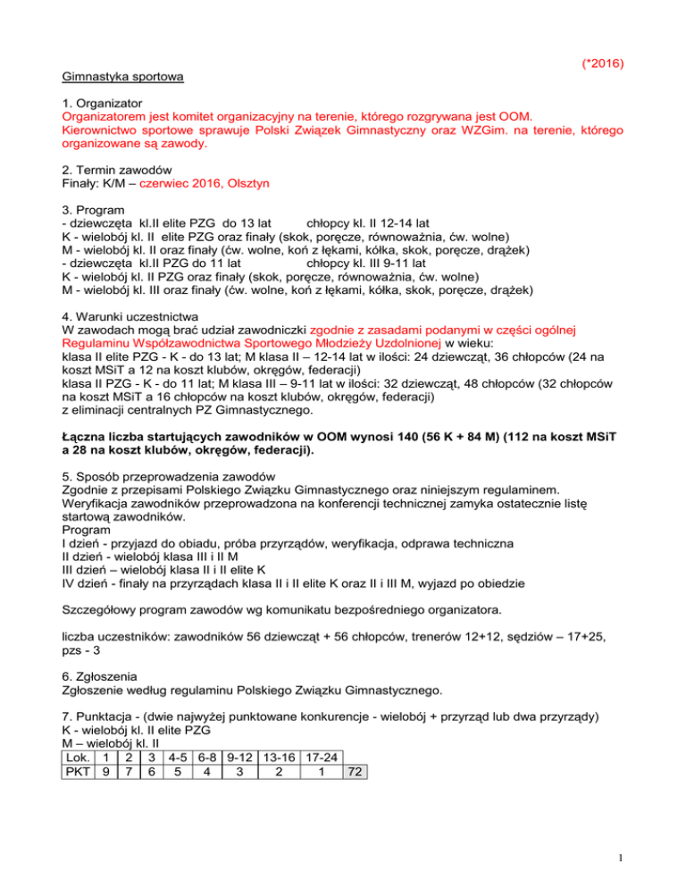 (*2016) Gimnastyka sportowa 1. Organizator Organizatorem jest komitet organizacyjny na terenie, którego rozgrywana jest OOM. Kierownictwo sportowe sprawuje Polski Związek Gimnastyczny oraz WZGim. na terenie, którego organizowane są zawody. 2. Termin zawodów Finały: K/M – czerwiec 2016, Olsztyn 3. Program - dziewczęta kl.II elite PZG do 13 lat chłopcy kl. II 12-14 lat K - wielobój kl. II elite PZG oraz finały (skok, poręcze, równoważnia, ćw. wolne) M - wielobój kl. II oraz finały (ćw. wolne, koń z łękami, kółka, skok, poręcze, drążek) - dziewczęta kl.II PZG do 11 lat chłopcy kl. III 9-11 lat K - wielobój kl. II PZG oraz finały (skok, poręcze, równoważnia, ćw. wolne) M - wielobój kl. III oraz finały (ćw. wolne, koń z łękami, kółka, skok, poręcze, drążek) 4. Warunki uczestnictwa W zawodach mogą brać udział zawodniczki zgodnie z zasadami podanymi w części ogólnej Regulaminu Współzawodnictwa Sportowego Młodzieży Uzdolnionej w wieku: klasa II elite PZG - K - do 13 lat; M klasa II – 12-14 lat w ilości: 24 dziewcząt, 36 chłopców (24 na koszt MSiT a 12 na koszt klubów, okręgów, federacji) klasa II PZG - K - do 11 lat; M klasa III – 9-11 lat w ilości: 32 dziewcząt, 48 chłopców (32 chłopców na koszt MSiT a 16 chłopców na koszt klubów, okręgów, federacji) z eliminacji centralnych PZ Gimnastycznego. Łączna liczba startujących zawodników w OOM wynosi 140 (56 K + 84 M) (112 na koszt MSiT a 28 na koszt klubów, okręgów, federacji). 5. Sposób przeprowadzenia zawodów Zgodnie z przepisami Polskiego Związku Gimnastycznego oraz niniejszym regulaminem. Weryfikacja zawodników przeprowadzona na konferencji technicznej zamyka ostatecznie listę startową zawodników. Program I dzień - przyjazd do obiadu, próba przyrządów, weryfikacja, odprawa techniczna II dzień - wielobój klasa III i II M III dzień – wielobój klasa II i II elite K IV dzień - finały na przyrządach klasa II i II elite K oraz II i III M, wyjazd po obiedzie Szczegółowy program zawodów wg komunikatu bezpośredniego organizatora. liczba uczestników: zawodników 56 dziewcząt + 56 chłopców, trenerów 12+12, sędziów – 17+25, pzs - 3 6. Zgłoszenia Zgłoszenie według regulaminu Polskiego Związku Gimnastycznego. 7. Punktacja - (dwie najwyżej punktowane konkurencje - wielobój + przyrząd lub dwa przyrządy) K - wielobój kl. II elite PZG M – wielobój kl. II Lok. 1 2 3 4-5 6-8 9-12 13-16 17-24 PKT 9 7 6 5 4 3 2 1 72 1 K – finały kl. II elite M - finały kl. II Lok. 1 2 3 4 5 6 7 8 PKT 9 7 6 5 4 3 2 1 37 K - wielobój kl. II PZG M - wielobój kl. III Lok. 1 2-3 4-8 9-16 17-24 25-32 PKT 6 5 4 3 2 1 84 K - finały klasa II PZG, M - finały kl. III Lok. 1 2 3 4 5-6 7-8 PKT 6 5 4 3 2 1 24 D. System ocen Gimnastyka sportowa I. Młodzieżowe Mistrzostwa Polski M – 18-21 lat 1. Program M - wielobój oraz finały ćwiczenia wolne, koń z łękami, kółka, skok, poręcze, drążek 2. Punktacja - (trzy najwyżej punktowane konkurencje - wielobój + dwa przyrządy lub trzy przyrządy) Lok. 1 2 3 4 5 6 7 8 PKT 25 21 18 16 14 12 18 8 124 II. Mistrzostwa Polski Juniorów Klasa I PZG - K - do 14-15 lat, Klasa I - M – 15-17 lat 1. Program K - wielobój kl. I oraz finały (ćwicz. wolne, skok, poręcze, równoważnia) M - wielobój kl. I oraz finały (ćwicz. wolne, koń z łękami, kółka, skok, poręcze, drążek). 2. Punktacja - (trzy najwyżej punktowane konkurencje - wielobój + dwa przyrządy lub trzy przyrządy) wielobój Lok. 1 2 3 4 5 6 7 8 9 10-11 12-13 14-16 PKT 15 12 10 9 8 7 6 5 4 3 2 1 89 finały Lok. 1 2 3 4 5 6 7 8 PKT 15 12 10 8 6 4 3 2 60 III. Olimpiada Młodzieży - Mistrzostwa Polski Juniorów młodszych K - Klasa II elite PZG – do 13 lat, Klasa II PZG – do 11 lat M – klasa II – 12-14 lat, Klasa III – 9-11 lat 1. Program - dziewczęta kl.II elite PZG do 13 lat chłopcy kl. II 12-14 lat K - wielobój kl. II elite PZG oraz finały (skok, poręcze, równoważnia, ćw. wolne) M - wielobój kl. II oraz finały (ćw. wolne, koń z łękami, kółka, skok, poręcze, drążek) - dziewczęta kl.II PZG do 11 lat chłopcy kl. III 9-11 lat K - wielobój kl. II PZG oraz finały (skok, poręcze, równoważnia, ćw. wolne) M - wielobój kl. III oraz finały (ćw. wolne, koń z łękami, kółka, skok, poręcze, drążek) 2. Punktacja - (dwie najwyżej punktowane konkurencje - wielobój + przyrząd lub dwa przyrządy) K - wielobój kl. II elite PZG M – wielobój kl. II Lok. 1 2 3 4-5 6-8 9-12 13-16 17-24 PKT 9 7 6 5 4 3 2 1 72 2 K – finały kl. II elite M - finały kl. II Lok. 1 2 3 PKT 9 7 6 4 5 5 4 6 3 7 2 8 1 37 K - wielobój kl. II PZG M - wielobój kl. III Lok. 1 2-3 4-8 9-16 17-24 25-32 PKT 6 5 4 3 2 1 K - finały klasa II PZG, M - finały kl. III Lok. 1 2 3 4 5-6 7-8 PKT 6 5 4 3 2 1 24 84 Eliminacje do OOM-MPJM – eliminacje centralne IV. Międzywojewódzkie Mistrzostwa Młodzików K – klasa młodzieżowa do 8 lat M – klasa młodziezowa 6-9 lat 1. Program K - wielobój kl. młodzieżowa (ćw. wolne, skok, poręcze, równoważnia,) M - wielobój kl. młodzieżowa (ćw. wolne, koń (skrzynia), skok, drążek) 2. Punktacja - (dwie najwyżej punktowane konkurencje - wielobój + przyrząd lub dwa przyrządy) K, M - wielobój Lok. 1 2-5 6-12 PKT 3 2 1 18 K - finały Lok. 1 2 3-4 PKT 3 2 1 7 M - finały Lok. 1 2-3 4-6 PKT 3 2 1 10 Młodziczki – strefy A – LUB, MŁP, ŁDZ B – KPM, POM, WM, ZPM C – OPO, DŚL, ŚL 2014 ŁDZ ZPM ŚL 2015 MŁP POM ŚL 2016 MŁP WM OPO 2017 2014 KPM POM MŁP ŚL 2015 POM KPM MŁP ŚL 2016 ZPM KPM MŁP OPO 2017 Młodzicy – strefy A – POM, ZPM B – KPM, MAZ C – ŁDZ, MŁP D – DSL, OPO, ŚL Terminy i miejsca rozgrywania MMM ustalane w obrębie stref wg wytycznych PZG. E. Roczniki juniorki juniorki młodsze młodziczki K K K K 14-15 lat (w 2016 roku urodzeni 01.01.2001 – 31.12.2002) klasa I PZG do 13 lat (w 2016 roku urodzeni 01.01.2003 i młodsi) klasa II elite PZG do 11 lat (w 2016 
