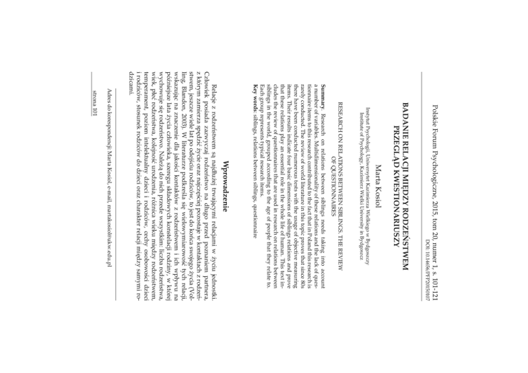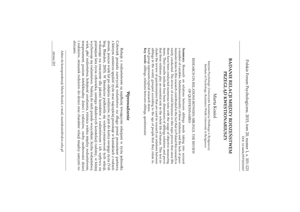 XWU]\P\ZDQLHNRQWDNWX DZȱŗŖǯŗŚŜśŜȦŘŖŗśŖŗŖŝ Polskie Forum Psychologiczne, 2015, tom 20, numer 1, s. 101-121 ȱȱ9ȱSȱ &ȱ Marta Kosiol Instytut Psychologii, Uniwersytet Kazimierza Wielkiego w Bydgoszczy Institute of Psychology, Kazimierz Wielki University in Bydgoszcz RESEARCH ON RELATIONS BETWEEN SIBLINGS. THE REVIEW OF QUESTIONNAIRES Summaryǯȱ ȱ ȱ ȱ ȱ ȱ ȱ ȱ ȱ ȱ ȱȱȱǯȱ¢ȱȱȱȱȱȱȱȱȱȱȱȱȱȱȱȱȱȱȱȱȱȱȱ rarely conducted. The review of world literature in this topic proves that since 80s ȱȱȱȱȱȱ ȱȱȱȱȱȱ ǯȱȱȱȱȱȱȱȱȱȱȱȱ ȱȱȱ¢ȱȱȱȱȱȱ ȱȱȱǯȱȱ¡ȱȱȱ ȱȱȱȱȱȱȱȱȱȱ ȱ ȱȱȱ ǰȱȱȱȱȱȱȱȱȱ¢ȱȱǯȱ Each group represents typical research items. Key wordsDZȱǰȱȱ ȱǰȱ Wprowadzenie ȱ £ȱ £Ú ȱ ȱ ÙČȱ ¢ȱ ȱ ȱ Č¢ȱ ǯȱ £Ù ȱ ȱ ££ ¢£ȱ £Ú ȱ ȱ Ùȱ £ȱ £ȱ ǰȱ £ȱà¢ȱ££ȱ¿£°ȱČ¢ȱ£ȱ£¿ïȱ£ȱ ȱȱ£ȱ£Ú ǰȱ££ȱ ȱȱȱïȱ£à ǰȱȱȱȱÚȱ ȱČ¢ȱǻǰȱ ǰȱ ŘŖŖřǼǯȱ ȱ £ȱ ïȱ ¿ȱ ¢ ï°ȱ ¢ȱ ǰȱ £ȱ ȱ ££ȱ ȱ ïȱ à ȱ £ȱ £Ú ȱ ȱ ȱ Ù¢ ȱ ȱ àĊ£ȱȱČ¢ȱ£Ù ǰȱ£ȱÙ ¢ȱȱ£¢ǰȱ ȱàȱ ¢ ȱ¿ȱ£Ú ǯȱČȱȱȱ£ȱ £¢DZȱ£ȱ£Ú ǰȱ ǰȱÙ°ȱ£Ú ǰȱï°ȱ£ǰȱàČȱ ȱ¿£¢ȱ£Ú ǰȱ ǰȱ £ȱ ¢ȱ £ȱ ȱ £à ǰȱ ¢ȱ ïȱ £ȱ ȱ£à ǰȱȱ£à ȱȱ£ȱ£ȱȱȱ¿£¢ȱ¢ȱdzicami. ȱȱDZȱȱǰȱȬǰȱȓ ǯǯȱ strona 101 ï°ȱ £¢ȱ ¢ȱ °ȱ ££ȱ ȱ ïȱ ȱ ¿£¢ȱ £Ú ȱ ǰȱČȱȱ£Ú ȱȱ£¿ £¿ȱï°ȱ¢ǯȱ ȱ£¿£¢ȱ£¢ȱ £¢¢ȱ£ȱȱ£ £ǯȱ ȱ ȱ£¢ȱ£¢ȱ ȱ¢ȱȱ££ȱȱ ȱ £ȱȱȱÚȱà £¢ȱǻȬÙ ǰȱŗşşŘǼǯȱȱȱà Čȱ £ȱÚȱÙČ¢ǰȱ £¿¢ȱǰȱȱ£ȱ£ȱǰȱȱ ȱ£ȱ¿£¢ȱ£Ú ȱȱ££ȱǯ ȱȱ¿£¢ȱ£Ú ȱȱȱ ȱ ¢¢ȱ ïȱ ȱ ȱ £ȱ Úȱ £¢ȱ ȱ £Ú ȱ ȱ ǯȱ ȱ ȱ ȱ ££ǰȱ ȱ ¢¢ǰȱ¢ ȱȱ£¿£ȱ £ ¢ȱȱȱȱ¿£¢ȱ £Ú ǯȱ £ȱ¢£ȱ ȱ£¢ȱȱȱ¢£ȱ ȱÙà ȱ £ȱ ££ȱ ȱ ȱ ȱ ¢ȱ ȱ ȱ ȱ ȱ £ȱ ǻ¢£ ǰȱŗşŞśDzȱ ǰȱŗşŞŜDzȱ¢£ǰȱŘŖŖŘDzȱǰȱŘŖŖŚDzȱÙ¿ǰȱŘŖŗŖǼǰȱȱȱ àÙÙČȱǻǰȱŗşŝŝǰȱ£DZȱȬÙ ǰȱŗşşŘǼȱ£ȱ£ £à ȱ £¢ȱ £ȱ ïàȱ £Ú ȱ £ȱ ïȱ ǻ£ ǰȱ Úǰȱ ŘŖŗŖǼǯȱ ȱ ȱ ȱ ȱ Ùà ȱ £ȱ £¢ȱ à £ȱ ¢à ȱ ȱàȱ¢ȱ£Ú ǯȱȱȱ¿ȱȱ ¢£ȱ££ȱȱ£Ú ȱ£¢ȱȱ£ ȱ££ǰȱ£ȱ¢¢ȱȱ¿£¢ȱ£Ú ǯȱȱÚȱȱ£ȱ £¢ȱ £ȱ £¢¢ ¢ȱ ȱ ¢ȱ ¢ȱ £ȱ ȱ ¢à ȱ ¢£¢ȱ ȱ £ȱ ȱ £Ú ȱ ǻ ǰȱ ŗşŞŚDzȱ¢£ ǰȱŗşŞśDzȱ ǰȱŗşŞŜDzȱǰȱŗşŞŞDzȱǰȱŘŖŖŚDzȱ ÚǰȱŘŖŗŖDzȱ ÙǰȱÚǰȱŘŖŗŖǼǯȱ£ȱ¢ȱ ȱȱ£¢ȱȱ¿ȱà Čȱ ȱ¢ęȱ ȱ£Ú ȱĊȱ£¢¢£¢ǯȱ£ȱ¿ȱ ȱ ï°ȱ £à ȱ ¢£¢ȱ ǰȱ ȱ ȱ ¢Ù£¢ȱ à ȱ ȱ£Ú ǰȱ£ ȱ ¿ȱȱ££àȱ¿ȱï ȱ ȱȱ ȱ¿£¢ȱ°ȱȱȱǻ ǰȱŘŖŗŖǼǯȱ¿ȱ¿ȱȱ ȱȱ¢£ȱ ȱ£ ¢ȱ£ȱ ¢ ¢ȱ¿ȱ £ȱ £Ú ȱ ¢ȱ Ċȱ ȱ ïȱ àȱ Ù ¢ȱ £ȱ ȱ ȱ ȱ ¿£¢ȱ £Ú ȱ ǻǯȱ £ǰȱ ŗşŞřDzȱ £¢£ ǰȱ ŗşŞŚDzȱ ǰȱ ŘŖŖśDzȱ ǰȱ ŘŖŖŝDzȱ ǰȱ ŘŖŗřǼǯȱ ȱ ¿£¢ȱ £Ú ȱ £ ¢ȱ £ȱǰȱ ȱà¢ȱȱ£ȱ¿ȱ£ Úȱ£¢ȱȱ£¿ïȱȮȱ£ȱ £¢ȱ ¢ȱ Ȯȱ ȱ ȱ ǰȱ ¢ȱ ȱ Ù¢ǰȱ £¢ȱ £¢ ¢ȱ£ȱ££ȱï ȱ£ȱȱ£Ù ȱ ïȱ £ȱ ££ȱ £ȱ £¢ȱ ï £Úȱ ȱ Ùȱ Č¢ȱ ǻ¢£ ǰȱ ŗşŞśDzȱ ǰȱŘŖŖŞǰȱŘŖŗŖǼǯ ȱȱ¿£¢ȱ£Ú ȱ ȱ£ȱ££ £ȱ ¢¿ȱ ȱ ȱ ¿£¢ȱ £Ú ȱ ȱ £ȱ ££ǰȱ Čȱ £ Č¢°ǰȱ Čȱ ȱ ȱ £ȱ ȱ £¿ £¿ǯȱ ȱȱ ¢ȱ¢Ú¢ǰȱȱȱ£¢ȱȱ ǰȱ strona 102 ¢ȱ ¢ȱ Úȱ £ȱ ¢£¢ȱ £¢ȱ ȱ ȱ ȱ ¿£¢ȱ £Ú ȱ ǻǰȱ ǰȱ ŗşŞŗDzȱ ǰȱ ǰȱ ŗşŞśDzȱ ǰȱǰȱŗşŞśDzȱǰȱǰȱǰȱŗşŞşDzȱǰȱǰȱŗşşŖDzȱǰȱ ǰȱ ŗşşŘDzȱ ǰȱǰȱ ǰȱ ŗşşŚDzȱ Ȭǰȱ ǰȱ ŗşşŚDzȱ ǰȱ ǰȱ ŗşşśDzȱ ǰȱ ǰȱ ǰȱ ŗşşŝDzȱ ǰȱ ǰȱ ŗşşŞDzȱ ǰȱŘŖŖŖǼǯȱȱȱ£¿ïȱ¢£ȱ£ȱȱÙ£Č¢ǰȱ££ȱȱ¿£¢ȱ£Ú ȱ ȱȱÙïǰȱȱ£ȱȱ ȱ£ȱÙà ¢ȱspektywach teoretycznych. Pierwsza z nich to perspektywa psychoanalityczno-ewolucyjna. W jej ramach ȱ ¢ïȱȱ¿£¢ȱ£Ú ȱ ¢£¢ȱ¿ȱ¿ȱ£¢ £ȱ ¢Ȃȱ £ȱ ¿ȱ ¢ȱ ¢ ȱ ȱ ǻǰȱ ǰȱ ǰȱ ŘŖŗŗǼǯȱ ȱ ¢ ¿ȱ ȱ ïȱ ¢ȱ Ù£ǰȱ £ȱ ¿ȱ ȱ ȱ à Úȱ Ù£¢ȱ ǰȱ Ù£ȱ ȱ ¢¢ȱ £ȱȱ£Ùǯȱ£ȱ¢ ȱȱȱÙ£ȱ£ȱ¿ǰȱïȱ ¿ȱ £à ȱ £ȱ £ȱ ȱ £ Úȱ ¢ȱ àǯȱ ȱ £ȱ£ ȱ¿ȱȱ¿ȱȱ¢ ¢ȱ£¢ȱ¢à ȱdziny (ang. family-ecological systemsǼǯȱ¢£¢ȱ¿ȱ ȱȱ¿ȱ¢à ȱ£ȱ £ ȱ¿ȱ ¿ȱȱ£¢ȱ£ ¿£ǰȱȱ Ù¢ ȱȱ£¿ǯȱ¢ȱ ¢ ¢ȱ¢£ǰȱ¿ȱ ȱ ¢ȱÚǰȱ£Ùȱ¿ȱ £ǰȱ £ȱ £ȱ ȱ Ù¢ à ǰȱ ȱ ȱ ȱ ¿£¢ȱ £Ú ǯ ȱ ȱ£ȱ££ȱȱ£ȱČ¢ȱȱ £ ¢ȱ £Ù¢ȱȱ ¢¿ȱ£ȱ ¢ȱ ¢à ȱ ȱ¿£¢ȱ£Ú ǯȱČȱȱDZȱÙȦï°ǰȱĚǰȱ¢ £ȱ £ȱ £¢Ȧ Ù£ȱ ǻǰȱ ǰȱ ŘŖŖřǼǯȱ £¢ȱ ¢ȱ £Ù¢ȱ ££ȱ ȱ ę¢ǰȱ ȱ ȱ ȱ £Ú ǯȱ £ȱ £¢ȱ ȱ ȱ ¢ȱ ȱ ȱ ȱ £¢£ȱ Č¢ȱ £ȱ ȱ ȱ ǰȱ ȱ £àȱȱï ȱ£ȱĊàÙȱ ǯȱȱȱ£Ú ȱȱ ¢ȱ ¿£¢ȱ £Ú ȱ ȱ Č¢ȱ £¢ȱ ȱ ȱ ¢ȱ Ěà ȱ ¿£¢ȱ £ǰȱ £¢£¢ȱ ¿ȱ ȱ ȱ ȱ Ù£¢ȱ£ȱ£££ȱ£ȱ£ ȱ¢Ù£¢ǯȱȱČȱ£¢°ȱ ¿£ȱ£Čï°ȱȱ£à ȱ ȱȱ£ ǰȱȱ ¿£ȱ ȱ ȱ ȱ Ù£¢ȱ £ȱ £ǯȱ ȱ £ȱ £Ú ǰȱ ££ȱ£ȱ ȱȱ ȱȱ£Ú ǰȱ¢ ȱČȱ Čȱ¿ȱ ȱ£¢ȱ£ ȱ¢£ȱ ȱ ȱ ȱ£ȱ¢ȱ£à ǯȱà Čȱȱ££ȱÙȱČ¢ǰȱ£à ȱ¢ǰȱ ȱ ȱ ¿Č£¢Ċǰȱ ££ȱ ï°ȱ àȱ ȱ £ȱ Č¢ȱ Ú ȱ ȱ£ȱï £ȱà ȱ¢¢ȱǻ ¢ȱǰȱĴǰȱŘŖŗŖDzȱ ǰȱ ǰȱ ǰȱ ŘŖŗŗDzȱ ǰȱ ǰȱ ȱ ǰȱ ŘŖŗřDzȱ ȱ ȱ ǯǰȱ ȱǼǯȱ£¢£ȱ ¢ȱÚȱï £ȱȱÙ¢ȱ££ȱȱ£ȱ£Ú ȱȱČ¢ȱǰȱȱ¢ȱ¢ȱ £ȱ£ï°ȱ £ȱ Úȱ£ȱȱ£ȱȱȱ£¢ ¢ȱ£¿£ǯ £ȱȱ¿£¢ȱ£Ú ȱ£ ȱȱ£Čȱ£ȱ ȱïȱȱ£¿ ïȱà ȱ£Ú ȱȱ££ȱČ¢ǯȱ£ȱstrona 103 ¢ ȱȱȱȱ ȱ£Ú ȱ£ȱ ȱȱ£ ǯȱȱàĊ£¢ȱ £ǰȱ ȱ ¿ȱ Č¢ȱ ¢ ȱ ï £ȱ Č¢ ǰȱ ¢ęȱ££ȱ¢ȱȱȱȱ¢ǯȱȱ Ù ïȱ£ȱ ȱ£ ȱ ȱàČȱ£ȱ £¢ǰȱȱ Ù¢ȱȱȱȱ¿£¢ȱ£Ú ȱ ȱàČ¢