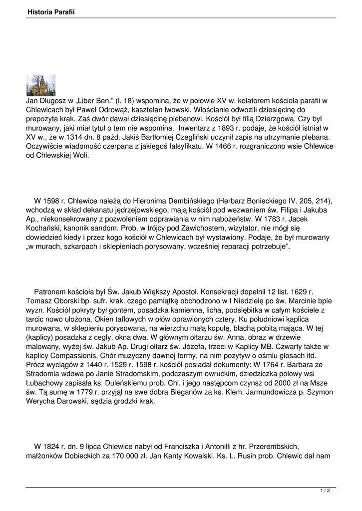 Historia Parafii Jan Długosz w „Liber Ben.” (l. 18) wspomina, że w połowie XV w. kolatorem kościoła parafii w Chlewicach był Paweł Odrowąż, kasztelan lwowski. Włościanie odwozili dziesięcinę do prepozyta krak. Zaś dwór dawał dziesięcinę plebanowi. Kościół był filią Dzierzgowa. Czy był murowany, jaki miał tytuł o tem nie wspomina. Inwentarz z 1893 r. podaje, że kościół istniał w XV w., że w 1314 dn. 8 paźd. Jakiś Bartłomiej Czegliński uczynił zapis na utrzymanie plebana. Oczywiście wiadomość czerpana z jakiegoś falsyfikatu. W 1466 r. rozgraniczono wsie Chlewice od Chlewskiej Woli. W 1598 r. Chlewice należą do Hieronima Dembińskiego (Herbarz Bonieckiego IV. 205, 214), wchodzą w skład dekanatu jędrzejowskiego, mają kościół pod wezwaniem św. Filipa i Jakuba Ap., niekonsekrowany z pozwoleniem odprawiania w nim nabożeństw. W 1783 r. Jacek Kochański, kanonik sandom. Prob. w trójcy pod Zawichostem, wizytator, nie mógł się dowiedzieć kiedy i przez kogo kościół w Chlewicach był wystawiony. Podaje, że był murowany „w murach, szkarpach i sklepieniach porysowany, wcześniej reparacji potrzebuje”. Patronem kościoła był Św. Jakub Większy Apostoł. Konsekracji dopełnił 12 list. 1629 r. Tomasz Oborski bp. sufr. krak. czego pamiątkę obchodzono w I Niedzielę po św. Marcinie bpie wyzn. Kościół pokryty był gontem, posadzka kamienna, licha, podsiębitka w całym kościele z tarcic nowo ułożona. Okien taflowych w ołów oprawionych cztery. Ku południowi kaplica murowana, w sklepieniu porysowana, na wierzchu małą kopułę, blachą pobitą mająca. W tej (kaplicy) posadzka z cegły, okna dwa. W głównym ołtarzu św. Anna, obraz w drzewie malowany, wyżej św. Jakub Ap. Drugi ołtarz św. Józefa, trzeci w Kaplicy MB. Czwarty także w kaplicy Compassionis. Chór muzyczny dawnej formy, na nim pozytyw o ośmiu głosach itd. Prócz wyciągów z 1440 r. 1529 r. 1598 r. kościół posiadał dokumenty: W 1764 r. Barbara ze Stradomia wdowa po Janie Stradomskim, podczaszym owruckim, dziedziczka połowy wsi Lubachowy zapisała ks. Duleńskiemu prob. Chl. i jego następcom czynsz od 2000 zł na Msze św. Tą sumę w 1779 r. przyjął na swe dobra Bieganów za ks. Klem. Jarmundowicza p. Szymon Werycha Darowski, sędzia grodzki krak. W 1824 r. dn. 9 lipca Chlewice nabył od Franciszka i Antonilli z hr. Przerembskich, małżonków Dobieckich za 170.000 zł. Jan Kanty Kowalski. Ks. L. Rusin prob. Chlewic dał nam 1/2 Historia Parafii takie szczegóły o parafii: „Od pewnego czasu zamieszkały w Chlewicach Michał Bontoni, bardzo pobożny człowiek co dzień bywał na Mszy św. A jeśli jacy goście byli zostawiał ich w domu, a szedł na ofiarę Mszy św. a w niedzielę na nieszpory; inwentarzem zwykle pół dnia robił, a pole 3000 morgów obszaru na czas obrobił. Prowadząc życie chrześcijańskie i przykładne, będące zbudowaniem dla parafian, widząc mały kościółek … w 1864 r. wystawił kościół, płacąc nawet za każdą posługę. W ołtarzach umieścił obrazy Pana Jezusa na krzyżu; do nóg Pańskich garnie się Maria Magdalena pokutnica. Drugi obraz to św. Michał zwołujący na sąd ostateczny. Obrazy te miały parafianom przypominać pokutę i sąd Boży…” „Kościół dawny był w 1862 r. rozebrany a na jego miejsce nowy rozpoczęty. Dn. 25 lipca 1864 r. kościół był wykończony, a w dn. Św. Jakuba został uroczyście pobenedykowany przy dość licznem zgromadzeniu duchowieństwa i wiernych w obecności fundatora. Odnośny dokument został przez obecnych i fundatora podpisany.. Poświęcenia dokonał ks. Wojciech Latosiński, kanonik honorowy Sandomierski, prob. Obiechowski, dziekan Dzierzgowski…”. Źródło: Ks. Jan Wiśniewski, „Historyczny opis kościołów, miast, zabytków i pamiątek w powiecie Włoszczowskim”, Kielce 2000. 2/2