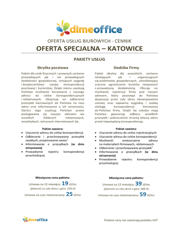 OFERTA USŁUG BIUROWYCH - CENNIK OFERTA SPECJALNA – KATOWICE PAKIETY USŁUG Skrytka pocztowa Siedziba Firmy Pakiet dla osób fizycznych i prawnych zarówno prowadzących jak i nie prowadzących działalności gospodarczej, ceniących wygodę i bezpieczeństwo swojej korespondencji pocztowej i kurierskiej. Dzięki niemu uzyskują Państwo możliwość korzystania z naszego adresu do celów korespondencyjnych i reklamowych. Obejmuje on odbieranie przesyłek kierowanych do Państwa na nasz adres oraz informowanie o ich otrzymaniu. Oprócz tego uzyskują Państwo prawo posługiwania się naszym adresem we wszelkich folderach reklamowych, wizytówkach, witrynach internetowych itp. Pakiet idealny dla wszystkich, zarówno istniejących jak i organizujących się podmiotów gospodarczych, umożliwiający znaczne ograniczenie kosztów związanych z prowadzoną działalnością. Oferuje on możliwość rejestracji firmy pod naszym adresem, który pozostaje do Państwa dyspozycji przez cały okres obowiązywania umowy oraz zapewnia wygodną i szybką obsługę korespondencji kierowanej do Państwa firmy. Dzięki tej usłudze mają Państwo gwarancję odbioru wszelkich przesyłek i jednocześnie chronią własny adres przed niepożądaną korespondencją. Pakiet zawiera: Użyczenie adresu do celów korespondencji Odbieranie i przechowywane przesyłek zwykłych, przyjmowanie awizo1 Informowanie o przesyłkach (w dniu otrzymania) Prowadzenie rejestru korespondencji przychodzącej Pakiet zawiera: Użyczenie adresu do celów rejestracyjnych Użyczenie adresu do celów korespondencji Możliwość umieszczenia adresu na materiałach firmowych, reklamowych Odbieranie i przechowywane przesyłek1 Informowanie o przesyłkach (w dniu otrzymania) Prowadzenie rejestru korespondencji przychodzącej • • • • • • • • • • Miesięczna cena pakietu: Umowa na 12 miesięcy: 19 zł/mc (płatność za cały okres z góry: 228 zł) Umowa na czas nieoznaczony: 25 zł/mc Miesięczna cena pakietu: Umowa na 12 miesięcy: 39 zł/mc (płatność za cały okres z góry: 468 zł) Umowa na czas nieoznaczony: 59 zł/mc Podane ceny nie zawierają podatku VAT Siedziba Firmy PLUS Sekretariat Firmy Pakiet ten jest wzbogaconą odmianą pakietu „Siedziba Firmy” przeznaczonym dla firm ceniących sobie najwygodniejsze formy dostępu do naszych usług. Poza wszystkimi składnikami pakietu „Siedziba Firmy” wariant „PLUS” zawiera skanowanie nielimitowanej7 liczby przesyłek listowych wraz z przesłaniem skanów na Państwa adres e-mail. Dodatkowo w pakiecie tym otrzymują Państwo 33% rabat na oferowane przez nas usługi dodatkowe. Pakiet ten jest doskonałym rozwiązaniem dla firm, których działalność wymaga w pełni funkcjonalnego biura, a jednocześnie poszukujących oszczędności w tym zakresie. Zawiera on wszystkie elementy pakietu „Siedziba firmy” jednak wzbogacony jest o profesjonalną obsługę przydzielonego Państwu numeru telefonu w wybranej strefie numeracyjnej, odbieranie połączeń oraz informowanie o działalności firmy. W ramach tego pakietu otrzymują Państwo również dedykowany numer faks, który będzie kierował wszystkie wysłane dokumenty na Państwa adres e-mail. Pakiet zawiera: • Użyczenie adresu do celów rejestracyjnych • Użyczenie adresu do celów korespondencji • Możliwość umieszczenia adresu na materiałach firmowych, reklamowych • Odbieranie i przechowywane przesyłek1 • Informowanie o przesyłkach (w dniu otrzymania) • Skanowanie korespondencji przychodzącej7 • Prowadzenie rejestru korespondencji przychodzącej • 33% rabat na usługi dodatkowe w pierwszym roku trwania umowy Miesięczna cena pakietu: Miesięczna cena pakietu: Umowa na 12 miesięcy: 59 zł/mc (płatność za cały okres z góry: 708 zł) Umowa na czas nieoznaczony: Pakiet zawiera: • Wszystkie elementy pakietu „Siedziba firmy PLUS” • Obsługę telefoniczną na dedykowanym numerze stacjonarnym2 • Sporządzanie notatek i informowanie o odbytych rozmowach • Udostępnienie numeru faks • Obsługę faksów • Skanowanie korespondencji przychodzącej7 • 33% rabat na usługi dodatkowe 89 zł/mc Umowa na 12 miesięcy: 139 zł/mc (płatność za cały okres z góry: 1668 zł) Umowa na czas nieoznaczony: 169 zł PROMOCJE! Księgowość za 33,33 zł miesięcznie przez pół roku ! Podane ceny nie zawierają podatku VAT USŁUGI DODATKOWE Własny numer stacjonarny Udostępnienie dedykowanego stacjonarnego numeru telefonu w dowolnej krajowej strefie numeracyjnej, z ustawionym przekierowaniem rozmów na wskazany przez Państwa inny numer telefonu (krajowy lub zagraniczny). Opłaty: 30 zł (20 zł po rabacie) – miesięczny abonament za usługę + opłaty za przekierowane połączenia rozliczane wg Cennika Usług Drobnych. Fax to Email Udostępnienie dedykowanego numeru faks w dowolnej krajowej strefie numeracyjnej. Wszystkie faksy wysyłane pod ten numer zostaną automatycznie przekazane na Państwa skrzynkę poczty elektronicznej. Na życzenie udostępniamy również możliwość wysyłania faksów. Opłaty: 15 zł (10 zł po rabacie) – miesięczny abonament za usługę. Wynajem sali konferencyjnej Udostępnienie wygodnej sali konferencyjnej idealnej do prowadzenia spotkań z klientami, prowadzenia szkoleń itp. W cenie zawarty jest mini-catering (woda, kawa, herbata) oraz dostęp do bezprzewodowego internetu Opłaty: 20 zł (13,40 zł po rabacie) – miesięczny abonament za usługę. USŁUGI DROBNE Skanowanie korespondencji przychodzącej 15 zł/mc 10 zł/mc od 5 zł/mc4 Odbieranie przesyłek awizowanych Przechowywanie dokumentów firmowych opłaty pocztowe/kurierskie Przesłanie korespondencji na wskazany adres Powiadamianie sms-em o przesyłkach Minuta rozmowy telefonicznej z krajowymi numerami stacjonarnymi Minuta rozmowy telefonicznej z sieciami komórkowymi T-Mobile, Plus, Orange Minuta rozmowy telefonicznej z siecią Play Minuta rozmowy telefonicznej z pozostałymi kraj