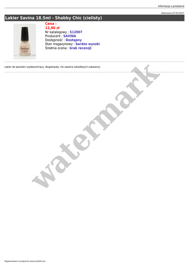 Informacje o produkcie Utworzono 07-03-2017 Lakier Savina 18.5ml - Shabby Chic (cielisty) Cena : 12,90 zł Nr katalogowy : S12007 Producent : SAVINA Dostępność : Dostępny Stan magazynowy : bardzo wysoki Średnia ocena : brak recenzji w at er m ar k Lakier do paznokci szybkoschnący, długotrwały, nie zawiera szkodliwych substancji. Wygenerowano w programie www.oscGold.com
