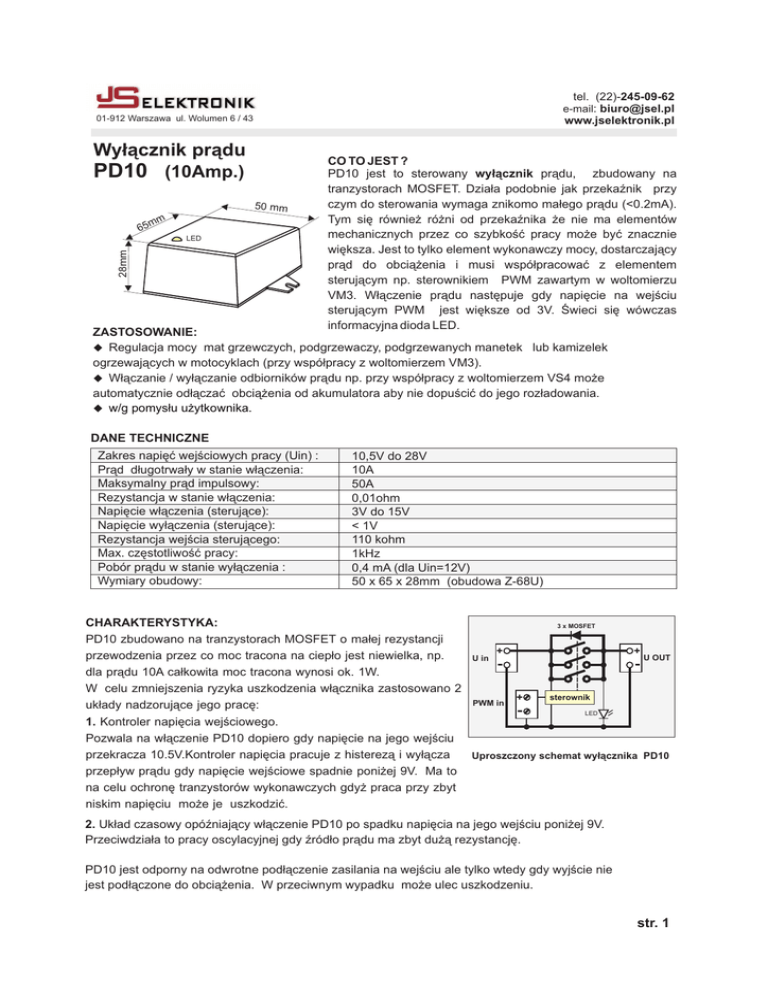 tel. (22)-245-09-62 e-mail: [email protected] 01-912 Warszawa ul. Wolumen 6 / 43 www.jselektronik.pl Wy³¹cznik pr¹du PD10 (10Amp.) 50 mm 65 mm 28mm LED CO TO JEST ? PD10 jest to sterowany wy³¹cznik pr¹du, zbudowany na tranzystorach MOSFET. Dzia³a podobnie jak przekaŸnik przy czym do sterowania wymaga znikomo ma³ego pr¹du (<0.2mA). Tym siê równie¿ ró¿ni od przekaŸnika ¿e nie ma elementów mechanicznych przez co szybkoœæ pracy mo¿e byæ znacznie wiêksza. Jest to tylko element wykonawczy mocy, dostarczaj¹cy pr¹d do obci¹¿enia i musi wspó³pracowaæ z elementem steruj¹cym np. sterownikiem PWM zawartym w woltomierzu VM3. W³¹czenie pr¹du nastêpuje gdy napiêcie na wejœciu steruj¹cym PWM jest wiêksze od 3V. Œwieci siê wówczas informacyjna dioda LED. ZASTOSOWANIE: u Regulacja mocy mat grzewczych, podgrzewaczy, podgrzewanych manetek lub kamizelek ogrzewaj¹cych w motocyklach (przy wspó³pracy z woltomierzem VM3). u W³¹czanie / wy³¹czanie odbiorników pr¹du np. przy wspó³pracy z woltomierzem VS4 mo¿e automatycznie od³¹czaæ obci¹¿enia od akumulatora aby nie dopuœciæ do jego roz³adowania. u w/g pomys³u u¿ytkownika. DANE TECHNICZNE Zakres napiêæ wejœciowych pracy (Uin) : Pr¹d d³ugotrwa³y w stanie w³¹czenia: Maksymalny pr¹d impulsowy: Rezystancja w stanie w³¹czenia: Napiêcie w³¹czenia (steruj¹ce): Napiêcie wy³¹czenia (steruj¹ce): Rezystancja wejœcia steruj¹cego: Max. czêstotliwoœæ pracy: Pobór pr¹du w stanie wy³¹czenia : Wymiary obudowy: 10,5V do 28V 10A 50A 0,01ohm 3V do 15V < 1V 110 kohm 1kHz 0,4 mA (dla Uin=12V) 50 x 65 x 28mm (obudowa Z-68U) CHARAKTERYSTYKA: 3 x MOSFET PD10 zbudowano na tranzystorach MOSFET o ma³ej rezystancji + + przewodzenia przez co moc tracona na ciep³o jest niewielka, np. U OUT U in dla pr¹du 10A ca³kowita moc tracona wynosi ok. 1W. W celu zmniejszenia ryzyka uszkodzenia w³¹cznika zastosowano 2 sterownik + PWM in uk³ady nadzoruj¹ce jego pracê: LED 1. Kontroler napiêcia wejœciowego. Pozwala na w³¹czenie PD10 dopiero gdy napiêcie na jego wejœciu przekracza 10.5V.Kontroler napiêcia pracuje z histerez¹ i wy³¹cza Uproszczony schemat wy³¹cznika PD10 przep³yw pr¹du gdy napiêcie wejœciowe spadnie poni¿ej 9V. Ma to na celu ochronê tranzystorów wykonawczych gdy¿ praca przy zbyt niskim napiêciu mo¿e je uszkodziæ. 2. Uk³ad czasowy opóŸniaj¹cy w³¹czenie PD10 po spadku napiêcia na jego wejœciu poni¿ej 9V. Przeciwdzia³a to pracy oscylacyjnej gdy Ÿród³o pr¹du ma zbyt du¿¹ rezystancjê. PD10 jest odporny na odwrotne pod³¹czenie zasilania na wejœciu ale tylko wtedy gdy wyjœcie nie jest pod³¹czone do obci¹¿enia. W przeciwnym wypadku mo¿e ulec uszkodzeniu. str. 1 POD£¥CZENIE: wspó³praca z woltomierzem motocyklowym VM3 : Pod³¹czenia nale¿y dokonaæ w/g schematu nr.1 1. Rozkrêciæ obudowê (2 wkrêty) 2. Odkrêciæ p³ytkê od obudowy (2 wkrêty) 3. Przylutowaæ do wejœcia (IN) przewody pr¹dowe zwracaj¹c uwagê na prawid³ow¹ polaryzacjê +/-. Przewód dodatni (+) powinien byæ pod³¹czone do jednego z bezpieczników motocykla (10A), (lub do bezpiecznika dodatkowego) a ujemny do masy. 4. Na razie nie pod³¹czaæ wyjœcia (obci¹¿enia). 5. Pod³¹czyæ przewody z regulatora PWM przykrêcaj¹c je do styków niebieskiej kostki "J2" zwracaj¹c uwagê na prawid³ow¹ polaryzacjê +/-. 6. W³¹czyæ napiêcie zasilaj¹ce i regulator PWM. Powinna zaœwieciæ siê dioda kontrolna na sterowniku. Je¿eli do sterowania u¿ywamy woltomierza VM3 to zmieniaj¹c poziom mocy w VM3 powinna równie¿ zmieniaæ siê jasnoœæ diody. Dioda nie œwieci siê œwiat³em ci¹g³ym lecz szybko miga. 7. Je¿eli wszystko dzia³a tak jak opisano powy¿ej mo¿emy pod³¹czyæ obci¹¿enie (np. kamizelkê) lutuj¹c przewody pr¹dowe do wyjœcia (OUT) wy³¹cznika PD10 (oczywiœcie bez napiêcia na wejœciu). 8. W obudowie wykonaæ odpowiednie podciêcia na kable np. okr¹g³ym pilnikiem. 9. Przykrêciæ p³ytkê do obudowy zwracaj¹c uwagê na w³aœciwe po³o¿enie diody LED 10. Delikatnie dokrêciæ denko obudowy. UWAGI: Przewodów "pr¹dowych" nie ma w komplecie. U¿ytkownik powinien je dobraæ w/g w³asnych kryteriów (kolor, elastycznoœæ itp.) zwracaj¹c jedynie uwagê na zachowanie odpowiedniego przekroju . 2 2 2 Np. dla pr¹du 5A przewody powinny miêæ przekrój minimum 0.7mm , dla 7A - 1mm a dla 10A - 1,5mm Przewody nale¿y przylutowaæ starannie, zwracaj¹c uwagê na mo¿liwoœæ zwaræ. wy³¹cznik pr¹du PD10 +12V bezpiecznik 10A IN IN=12V + - wejœcie masa (-) + +3V = ON PRZYCISK OUT + wyjœcie - +PWM + J2 bez opaski CZUJNIK TEMPERATURY + ZASILANIE pomiar napiêcia + - dioda LED 0V = OFF niebieska opaska OUT czerwona opaska VM3 Woltomierz VM3 z regulatorem PWM i pomiarem temperatury schemat nr.1 str. 2 251012
