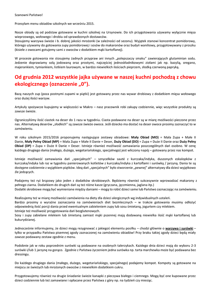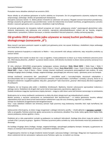 Szanowni Państwo! Przesyłam menu obiadów szkolnych we wrześniu 2015. Nasze obiady są od podstaw gotowane w kuchni szkolnej na Ursynowie. Do ich przygotowania używamy wyłącznie mięsa wieprzowego, wołowego i drobiu od sprawdzonych dostawców. Stosujemy warzywa świeże i b. dobrej jakości mrożonki (w zależności od sezonu). Wyjątek stanowi koncentrat pomidorowy, którego używamy do gotowania zupy pomidorowej i sosów do makaronów oraz budyń waniliowy, przygotowywany z proszku (kisiele z owocami gotujemy sami z owoców z dodatkiem mąki kartoflanej). W procesie gotowania nie stosujemy żadnych przypraw ani innych „polepszaczy smaku” zawierających glutaminian sodu. Jedzenie doprawiamy solą jodowaną oraz prostymi, najczęściej jednoskładnikowymi ziołami jak np. bazylią, oregano, majerankiem, tymiankiem, listkiem laurowym, w bardzo niewielkich ilościach pieprzem, słodką czerwoną papryką. Od grudnia 2012 wszystkie jajka używane w naszej kuchni pochodzą z chowu ekologicznego (oznaczenie „0”). Bazą naszych zup (poza postnymi zupami w piątki) jest gotowany przez nas wywar drobiowy z dodatkiem mięsa wołowego oraz dużej ilości warzyw. Artykuły spożywcze kupujemy w większości w Makro – nasz pracownik robi zakupy codziennie, więc wszystkie produkty są zawsze świeże. Ograniczyliśmy ilość ciastek na deser do 1 razu w tygodniu. Ciasta podawane na deser są w miarę możliwości pieczone przez nas. Alternatywą deserów „słodkich” są zawsze świeże owoce. Jeśli dziecko ma dostać na deser owoce prosimy zaznaczyć to w zamówieniu. W roku szkolnym 2015/2016 proponujemy następujące zestawy obiadowe: Mały Obiad (MO) = Mała Zupa + Małe II Danie, Mały Pełny Obiad (MP) = Mała Zupa + Małe II Danie + Deser, Duży Obiad (DO) = Zupa + Duże II Danie oraz Duży Pełny Obiad (DP) = Zupa + Duże II Danie + Deser. Istnieje również możliwość zamawiania poszczególnych dań osobno. W cenę każdego drugiego dania (małego, dużego, wegetariańskiego, specjalnego) jest wliczony napój – gotowany przez nas kompot. Istnieje możliwość zamawiania dań „specjalnych” – sznycelków sauté z kurczaka/indyka, duszonych eskalopków z kurczaka/indyka lub raz w tygodniu panierowanych kotletów z kurczaka/indyka z kartoflami i surówką / jarzyną. Dania te są dostępne codziennie z wyjątkiem piątków. Ideą dań „specjalnych” było stworzenie „pewnej” alternatywy dla dzieci wyjątkowo źle jedzących. Podajemy też ryż brązowy jako jeden z dodatków skrobiowych. Będziemy również sukcesywnie wprowadzać makarony z pełnego ziarna. Dodatkiem do drugich dań są też różne kasze (gryczana, jęczmienna, jaglana itp.) Dodatki skrobiowe mogą być wymieniane między daniami – mogą to robić dzieci same lub Państwo zaznaczając na zamówieniu. Realizujemy też w miarę możliwości zamówienia na diety dla dzieci alergicznych wg indywidualnych ustaleń. Bardzo prosimy o wyraźne zaznaczania na zamówieniach diet bezmlecznych – w trakcie gotowania musimy odłożyć odpowiednią ilość porcji dania przed ewentualnym zabieleniem zupy lub sosu śmietaną, jogurtem czy mlekiem. Istnieje też możliwość przygotowania dań bezglutenowych. Sosy i zupy zabielane mlekiem lub śmietaną zamiast mąki pszennej mają dodawaną niewielka ilość mąki kartoflanej lub kukurydzianej. Jednocześnie informujemy, że dzieci mogą rezygnować z jakiegoś elementu posiłku – chodzi głównie o warzywa i surówki – tylko w przypadku Państwa pisemnej zgody zaznaczonej na zamówieniu obiadów! Przy braku takiej zgody dzieci będą miały zawsze podawany zestaw zgodnie z menu. Podobnie jak w roku poprzednim surówki są podawane na osobnych talerzykach. Każdego dnia dzieci mają do wyboru 2-3 surówki i/lub 1 jarzynę na gorąco. Zgodnie z Państwa życzeniem jedna surówka np. tarta marchewka może być podawana bez dressingu. Do każdego drugiego dania (małego, dużego, wegetariańskiego, specjalnego) podajemy kompot. Kompoty są gotowane na miejscu ze świeżych lub mrożonych owoców z niewielkim dodatkiem cukru. Przygotowujemy również na drugie śniadanie świeże kanapki z pieczywa białego i ciemnego. Mogą być one kupowane przez dzieci codziennie lub też zamawiane i opłacane przez Państwa z góry np. na tydzień czy miesiąc. Tak jak w latach poprzednich obiady można kupować na cały miesiąc, na tydzień lub na inny dowolny okres. Sprzedaż karnetów obiadowych na wrzesień 2015r rozpoczynamy w poniedziałek 01.09.2015. Obiady indywidualne można kupować codziennie do godz. 9.00 w Jadalni szkolnej. Obiady są wydawane do godz. 15.15. Wykupiony na dany dzień obiad można odwołać wyłącznie telefonicznie pod numerem 22 644 04 14 najpóźniej do godz. 9.00 rano. Zwroty za odwołane obiady będą odliczane od zamówienia w następnym miesiącu. Zachęcamy do regulowania należności za obiady przelewem na nasze konto. Przy płatności przelewem bardzo prosimy o przesłanie dokładnego zamówienia pocztą elektroniczną lub złożenie go w Jadalni, gdyż jedynie wypełniony formularz zamówienia jest podstawą do wydania dziecku posiłku. Menu obiadów wraz z kartami zamówień mogą Państwo otrzymać pocztą elektroniczną po wysłaniu zgłoszenia na adres: [email protected] , podając w tytule „obiady Ursynów”. Jest ono również dostępne w PDF-ie na stronie Szkoły. Przelewy prosimy wystawiać na: Pruszynski Catering Sp. Jawna, ul. Śniadeckich 23/10, 00-654 Warszawa Bank Pekao S.A. Oddz. w Warszawie 60 1240 6247 1111 0000 4972 9650 jedyny właściwy rachunek ! Na przelewie i na zamówieniu wysyłanym mailem prosimy podać imię i nazwisko dziecka oraz klasę. Ponieważ formularze są drukowane przez program automatycznie, nawet jedno niepodpisane zamówienie zmusza nas do ponownego, „ręcznego” przejrzenia całej poczty i dopasowania anonimu do maila. W skrajnych przypadkach może to spowodować, że dziecko ni