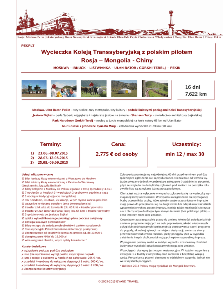 PEKPLT Wycieczka Koleją Transsyberyjską z polskim pilotem Rosja – Mongolia - Chiny MOSKWA – IRKUCK – LISTWIANKA – UŁAN BATOR / GORKHI-TERELJ – PEKIN 16 dni 7.622 km Moskwa, Ułan Bator, Pekin – trzy stolice, trzy metropolie, trzy kultury · podróż liniowymi pociągami Kolei Transsyberyjskiej Jezioro Bajkał – perła Syberii, najgłębsze i najstarsze jezioro na świecie · Skansen Talcy – świadectwo architektury bajkalskiej Park Narodowy Gorkhi-Terelj – nocleg w jurcie mongolskiej na łonie natury 65 km od Ułan Bator Mur Chiński i grobowce dynastii Ming – całodniowa wycieczka z Pekinu (90 km) Cena: Terminy: 1) 2) 3) 23.06.-08.07.2015 28.07.-12.08.2015 25.08.-09.09.2015 2.775 € od osoby Usługi wliczone w cenę ☑ bilet lotniczy klasy ekonomicznej z Warszawy do Moskwy ☑ bilet lotniczy klasy ekonomicznej z Pekinu do Warszawy (drugi termin: loty z/do Berlina!) ☑ bilety kolejowe z Moskwy do Pekinu zgodnie z trasą (przedziały 4-os.) ☑ 7 noclegów w hotelach 3* w pokojach 2-osobowym zgodnie z trasą ☑ 1 nocleg w tradycyjnej jurcie mongolskiej ☑ 10x śniadanie, 2x obiad, 2x kolacja, w tym słynna kaczka pekińska ☑ wszystkie konieczne transfery (z/na dworzec/lotnisko) ☑ transfer z Irkucka do Listwianki (ok. 65 km) + transfer powrotny ☑ transfer z Ułan Bator do Parku Terelj (ok. 65 km) + transfer powrotny ☑ 2-godzinny rejs po Jeziorze Bajkał ☑ opieka wykwalifikowanego polskiego pilota podczas całej trasy ☑ obsługa lokalnych przewodników ☑ bilety wstępu do zwiedzanych obiektów i parków narodowych ☑ Transsyberyjski Pakiet Podróżnika (informacje praktyczne) ☑ ubezpieczenie od kosztów leczenia za granicą KL do 30.000 € ☑ ubezpieczenie NNW do 16.000 zł ☑ wiza rosyjska i chińska, w tym opłaty konsularne * Koszty dodatkowe ✗ wyżywienie podczas podróży pociągiem ✗ inne (nie wymienione wyżej) posiłki, zwyczajowe napiwki ✗ jurta i pokoje 1-osobowe w hotelach na całej trasie: 265 € / os. ✗ przedział 4-osobowy do wyłącznej dyspozycji 2 osób: 600 € / os. ✗ przedział 4-osobowy do wyłącznej dyspozycji 3 osób: € 200 / os. ✗ ubezpieczenie kosztów rezygnacji Uczestnicy: min 12 / max 30 Zgłoszenia przyjmujemy najpóźniej na 60 dni przed terminem podróży (późniejsze zgłoszenia nie są wykluczone). Niezależnie od terminu wyjazdu polecamy jednak wcześniejsze zgłoszenie (najpóźniej w styczniu), gdyż ze względu na dużą liczbę zgłoszeń pod koniec i na początku roku zwykle listy są zamykane już na początku lutego. Oferta jest ważna wyłącznie w wypadku zgłoszenia się na wycieczkę wymaganej liczby uczestników. W wypadku niezgłoszenia się wymaganej liczby uczestników osoby, które zgłosiły swoje uczestnictwo w imprezie mają prawo do przepisania się na drugi termin lub odzyskania wszystkich wpłat wniesionych na poczet imprezy. Istnieje także możliwość skorzystania z oferty indywidualnej w tym samym terminie (bez polskiego pilota) – cena imprezy może ulec zmianie. Organizator zastrzega sobie prawo do zmiany kolejności zwiedzania i/lub zmian w programie mających na celu poprawienie jakości oferowanych usług i/lub podyktowanych koniecznością dostosowania trasy i programu do pogody, aktualnej sytuacji na miejscu destynacji, zmian ze strony przewoźników i/lub zmian rozkładu jazdy pociągów i/lub w wypadku zaistnienia innych okoliczności mających wpływ na przebieg imprezy. W programie podany został w każdym wypadku czas lokalny. Rozkład jazdy oraz wysokość opłat konsularnych mogą ulec zmianie. W pociągach dostępny jest wagon restauracyjny. W każdym wagonie są dostępne 1-2 toalety z umywalką oraz samowar z bezpłatną wrzącą wodą. Prysznice są płatne i dostępne w oddzielnym wagonie, jednak nie we wszystkich pociągach. * Od lipca 2014 Polacy mogą wjeżdżać do Mongolii bez wizy. © 2005-2015 EYAND TRAVEL Zapraszamy Państwa na ponad 2-tygodniową wycieczkę liniowymi pociągami Kolei Transsyberyjskiej. Oznacza to 7.622 km ciekawej trasy prowadzącej przez Syberię, wysokogórskie krajobrazy Uralu, liczne syberyjskie metropolie i wioski, następnie przez piękną i ciekawą rosyjską Republikę Buriacji i niemalże niezaludnione mongolskie stepy. Podczas całej trasy towarzyszy Państwu wykwalifikowany polski pilot. W pociągu będzie okazja do zawarcia nowych ciekawych znajomości, zapoznania się z inną kulturą i zrobienia pięknych zdjęć. Na peronach stacji pośrednich będą Państwo mieli okazję spróbowania świeżych regionalnych przysmaków. Podczas podróży przewidziane są postoje w wybranych ciekawych miejscowościach na trasie: Irkucku i Ułan Bator oraz pobyt na łonie natury – nad Jeziorem Bajkał w miejscowości Listwianka i w mongolskim Parku Narodowym Terelj połączony z noclegiem w tradycyjnej jurcie mongolskiej. W Listwiance będzie możliwość skosztowania bajkalskiego specjału – wędzonej ryby omul i skorzystania z tradycyjnej sauny rosyjskiej – banji. W programie przewidziany jest ponadto 2-godzinny rejs po Jeziorze Bajkał oraz całodniowa wycieczka, podczas której zobaczą Państwo jeden z najlepiej zachowanych odcinków słynnego Muru Chińskiego. Przebieg trasy Moskwa (1) Zbiórka na lotnisku w Warszawie (drugi termin: zbiórka w Berlinie), lot do Moskwy. Transfer z lotniska do hotelu. Zakwaterowanie, kolacja i nocleg w 3* hotelu. (2) Dziś zwiedzą Państwo Kreml, Plac Czerwony i okolice. W programie przewidziany jest także spacer po słynnej historycznej ulicy Arbat znanej z piosenek Bułata Okudżawy, przy której zamieszkiwał także Aleksander Puszkin. Czeka Państwa także wycieczka moskiewskim metrem, podczas której zobaczą Państwo wybrane najciekawsze stacje i przekonają się dlaczego określane są one mianem podziemnych pałaców. Po południu czas wolny. Nocleg w Moskwie. (3) Czas wolny, a dla chętnych bezpłatny program fakultatywny: wycieczka na Wzgórza Worobiowe połączona z re