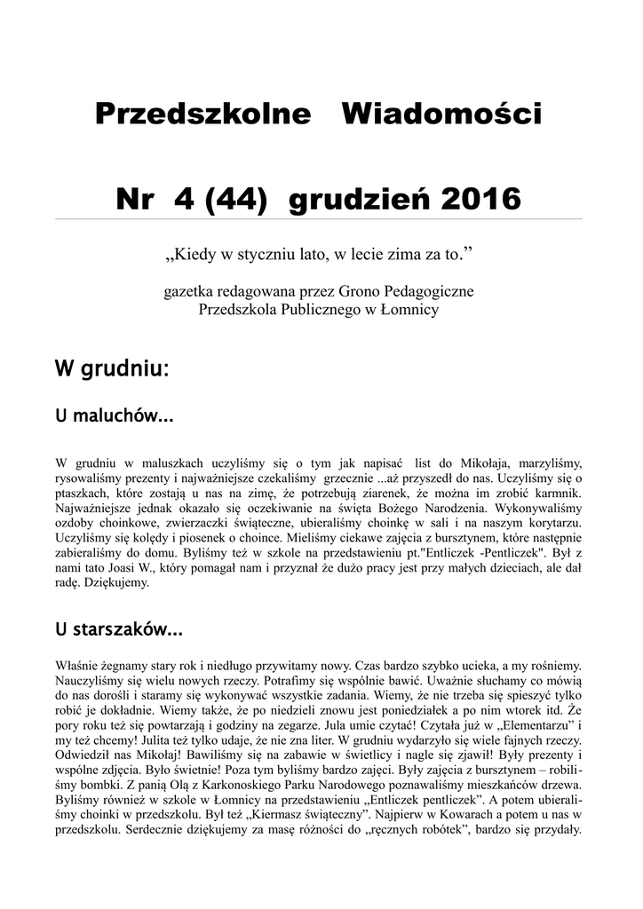 Przedszkolne Wiadomości Nr 4 (44) grudzień 2016