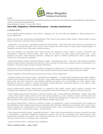 Źródło: http://old.mimowszystko.org/pl/anna-dymna/8222spotkajmy-sie8221/archiwum/619,Anna-Wilk-Magdalena-i-Michal-Mrow czynscy-choroba-nowotworowa.html Wygenerowano: Wtorek, 7 marca 2017, 04:52 Anna Wilk, Magdalena i Michał Mrówczyńscy - choroba nowotworowa 2 kwietnia 2007 r. W tym tygodniu gośćmi programu „Anna Dymna – Spotkajmy się” byli Anna Wilk oraz Magdalena i Michał Mrówczyńscy z synem Nikodemem. Dzisiaj pani Ania jest uśmiechniętą dwudziestolatką. Przed trzema laty przeżyła jednak dramat. Podczas kąpieli wyczuła guzka w swojej piersi. Nowotwór okazał się złośliwy. – Wiedziałam, co mnie czeka – opowiadała rozmówczyni Anny Dymnej. – Moja mam także miała nowotwór, amputowano jej obie piersi. To ona podtrzymywała mnie na duchu w tych trudnych dla mnie chwilach. W maju miałam robioną biopsję, a w listopadzie usunięto mi pierś, którą potem zrekonstruowano. Pani Ania wydawała się wspominać okres swojej choroby bez specjalnych emocji. Robiła to nawet z uśmiechem. Jak powiedziała w programie, rozumie jednak, czym może ona się kończyć. Jej mama zmarła przed dwoma laty – mimo amputacji obu piersi, miała przerzuty nowotworu. Dlatego tak ważne są badania profilaktyczne, którym każda kobieta powinna się systematycznie poddawać. – Kiedy przechodziłam leczenie, nikogo bliskiego nie miałam – opowiadała pani Ania. – Teraz mam. Mój chłopak od początku wiedział o mojej chorobie. Poznaliśmy dwa lata temu, kiedy moja pierś nie była jeszcze zrekonstruowana. Powiedziałam mu o wszystkim, bo przecież trudno zaczynać związek od kłamstwa. Rozmówczyni Anny Dymnej przyznała, że choroba nie odebrała jej radości życia. Co prawda zdarzało się, że płakała, czując się gorsza od zdrowych koleżanek, ale chwile trudne potrafiła przetrwać dzięki swojemu optymizmowi oraz nadziei. Państwo Magdalena i Michał Mrówczyńscy pojawili się w studiu z synem Nikodemem. – Wszystko między nami było jak w bajce – opowiadała pani Magdalena. – Po dwóch latach spotykania się ze sobą, wzięliśmy cudowny ślub w katedrze. Szybko udało mi się zajść w ciążę. Jednak podczas badań ginekolog poinformował mnie, że mam w piersi guzka. Nie byłam zaskoczona. Wyczuwałam wcześniej tego guzka, ale nie przykładałam do niego zbytniej uwagi. Sądziłam, że jakoś się „rozejdzie”. Lekarze nie podzielali mojego optymizmu. Ostatecznie okazało się, że, będąc w ciąży, muszę mieć amputowaną pierś, bo nowotwór jest złośliwy. Lekarze poinformowali państwa Mrówczyńskich, że najpewniej ciąża będzie musiała zostać usunięta, ponieważ takie rozwiązanie jest najlepsze w trakcie stosowania chemioterapii. Małżonkowie wahali się z podjęciem ostatecznej decyzji. – Kiedy dostałam pierwszą chemię, byłam w czwartym miesiącu ciąży – kontynuowała pani Magdalena. – Miałam różne myśli i emocje. Nasze dzicko mogło urodzić się chore. Nie bardzo wiedziałam, co robić. Wspólnie z mężem trafiliśmy jednak do wspaniałej pani doktor, która dała nam siłę i nadzieję. To właściwie jej zawdzięczamy, że Nikuś jest z nami na świecie. No i Misiu strasznie mnie wspierał. Życzyłabym każdej kobiecie takiego męża, faceta… Syn państwa Mrówczyńskich urodził się w siódmym miesiącu, po mastektomii i sześciu chemioterapiach, jakim poddała się pani Magdalena. Potem kobieta przeszła jeszcze dwadzieścia pięć naświetleń. Małżonkowie przechodzili różne trudne okresy, zarówno wspólnie jak i indywidualnie. Ich mocą była jednak miłość i wiara. One pomagały im przetrwać niejedne ciężkie chwile, podejmować – jak się potem okazało – słuszne decyzje. – Nikuś urodził się zupełnie zdrowy – opowiadał pan Michał. – Potem miał co prawda problemy z płucami, ale jest to normalne u wcześniaków. Z wszystkich dolegliwości wyszedł bez szwanku. Jeśli się uda, chcielibyśmy mieć drugie dziecko. Teraz dziewczynkę, Michalinkę. Żona będzie miała zrekonstruowaną pierś, bo z tym problemów żadnych nie ma. Zresztą nigdy nie straciła w moich oczach nic ze swojego czaru i kobiecości. – Jeszcze wskoczę w bikini – zaśmiała się pani Magdalena. TVP2, 2 kwietnia 2007 r., godz. 18.00 Tweet