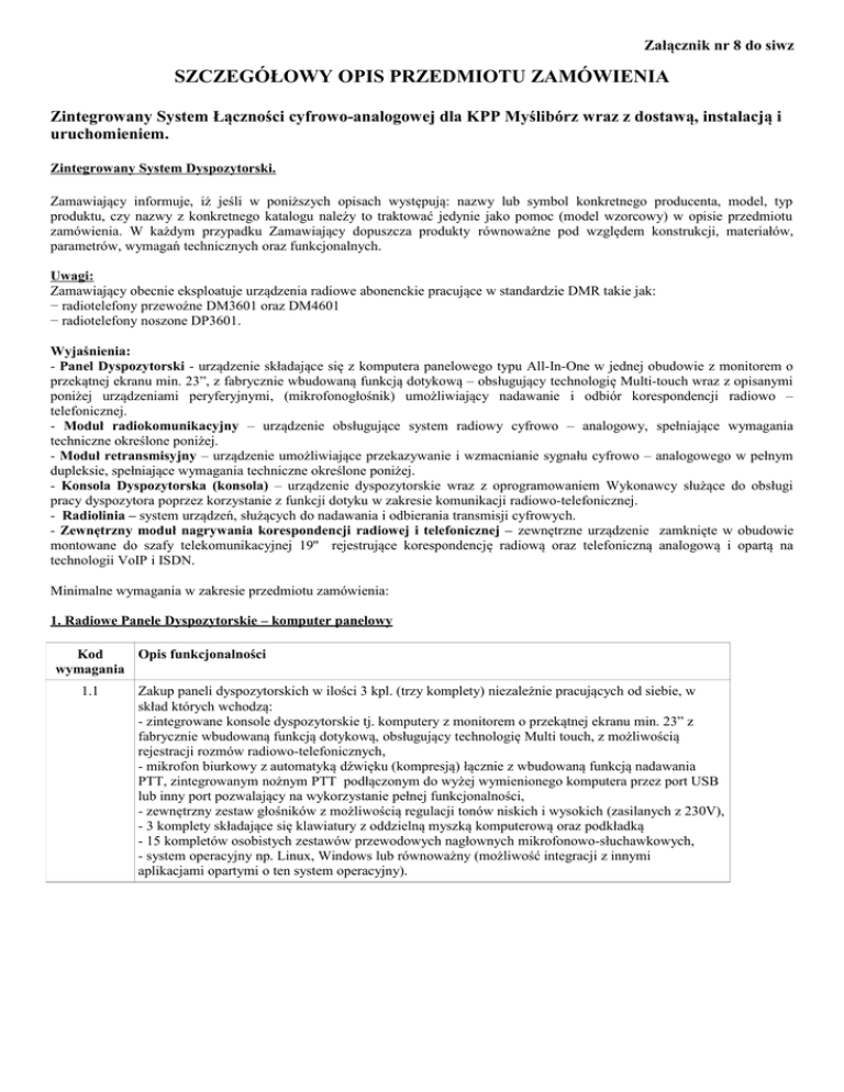 Załącznik nr 8 do siwz SZCZEGÓŁOWY OPIS PRZEDMIOTU ZAMÓWIENIA Zintegrowany System Łączności cyfrowo-analogowej dla KPP Myślibórz wraz z dostawą, instalacją i uruchomieniem. Zintegrowany System Dyspozytorski. Zamawiający informuje, iż jeśli w poniższych opisach występują: nazwy lub symbol konkretnego producenta, model, typ produktu, czy nazwy z konkretnego katalogu należy to traktować jedynie jako pomoc (model wzorcowy) w opisie przedmiotu zamówienia. W każdym przypadku Zamawiający dopuszcza produkty równoważne pod względem konstrukcji, materiałów, parametrów, wymagań technicznych oraz funkcjonalnych. Uwagi: Zamawiający obecnie eksploatuje urządzenia radiowe abonenckie pracujące w standardzie DMR takie jak: − radiotelefony przewoźne DM3601 oraz DM4601 − radiotelefony noszone DP3601. Wyjaśnienia: - Panel Dyspozytorski - urządzenie składające się z komputera panelowego typu All-In-One w jednej obudowie z monitorem o przekątnej ekranu min. 23”, z fabrycznie wbudowaną funkcją dotykową – obsługujący technologię Multi-touch wraz z opisanymi poniżej urządzeniami peryferyjnymi, (mikrofonogłośnik) umożliwiający nadawanie i odbiór korespondencji radiowo – telefonicznej. - Moduł radiokomunikacyjny – urządzenie obsługujące system radiowy cyfrowo – analogowy, spełniające wymagania techniczne określone poniżej. - Moduł retransmisyjny – urządzenie umożliwiające przekazywanie i wzmacnianie sygnału cyfrowo – analogowego w pełnym dupleksie, spełniające wymagania techniczne określone poniżej. - Konsola Dyspozytorska (konsola) – urządzenie dyspozytorskie wraz z oprogramowaniem Wykonawcy służące do obsługi pracy dyspozytora poprzez korzystanie z funkcji dotyku w zakresie komunikacji radiowo-telefonicznej. - Radiolinia – system urządzeń, służących do nadawania i odbierania transmisji cyfrowych. - Zewnętrzny moduł nagrywania korespondencji radiowej i telefonicznej – zewnętrzne urządzenie zamknięte w obudowie montowane do szafy telekomunikacyjnej 19'' rejestrujące korespondencję radiową oraz telefoniczną analogową i opartą na technologii VoIP i ISDN. Minimalne wymagania w zakresie przedmiotu zamówienia: 1. Radiowe Panele Dyspozytorskie – komputer panelowy Kod Opis funkcjonalności wymagania 1.1 Zakup paneli dyspozytorskich w ilości 3 kpl. (trzy komplety) niezależnie pracujących od siebie, w skład których wchodzą: - zintegrowane konsole dyspozytorskie tj. komputery z monitorem o przekątnej ekranu min. 23” z fabrycznie wbudowaną funkcją dotykową, obsługujący technologię Multi touch, z możliwością rejestracji rozmów radiowo-telefonicznych, - mikrofon biurkowy z automatyką dźwięku (kompresją) łącznie z wbudowaną funkcją nadawania PTT, zintegrowanym nożnym PTT podłączonym do wyżej wymienionego komputera przez port USB lub inny port pozwalający na wykorzystanie pełnej funkcjonalności, - zewnętrzny zestaw głośników z możliwością regulacji tonów niskich i wysokich (zasilanych z 230V), - 3 komplety składające się klawiatury z oddzielną myszką komputerową oraz podkładką - 15 kompletów osobistych zestawów przewodowych nagłownych mikrofonowo-słuchawkowych, - system operacyjny np. Linux, Windows lub równoważny (możliwość integracji z innymi aplikacjami opartymi o ten system operacyjny). 2. Wymagania dotyczące oprogramowania zainstalowanego na konsolach dyspozytorskich do obsługi radiotelekomunikacji. Kod Opis funkcjonalności wymagania 2.1 1. Komunikacja pomiędzy modułem zdalnego sterowania łącznością radiową, a pulpitem dyspozytorskim wyłącznie w technologii IP. 2. Możliwość jednoczesnego prowadzenia rozmowy z wykorzystaniem łącza radiowego, telefonicznego, interkomu oraz prowadzenia podsłuchu radiowego. 3. Funkcje umożliwiające obsługę połączeń radiowych i monitoringu środków radiowych: - obserwowanie stanu sygnałów PTT i SQUELCH w danym kanale radiowym, - zintegrowana rejestracja rozmów, - wybór kanału pracy radiostacji, - wybór trybu pracy (nasłuch, nadawanie-odbiór), - wybór grup w radiotelefonie, - Wyświetlanie nazwy kanału – 12 znakowy opis kanału, - Skaning, - wywołania indywidualne i grupowe, identyfikacja rozmówcy, - odbiór pozycji GPS od stacji ruchomych systemu i ich wizualizacja na mapie cyfrowej powiatu myśliborskiego wraz z powiatami sąsiadującymi, aktualizowanymi w okresach sześciomiesięcznych, - wysyłanie i odbiór wiadomości tekstowych w trybie cyfrowym, - zdalne blokowanie/odblokowanie wybranego radiotelefonu, - sprawdzanie dostępności wybranego radiotelefonu, - bezpośredni dostęp do kanałów z listy skaningowej, - bezpośredni wybór kanału analogowego lub cyfrowego z kolejki zapisanych zdarzeń (podczas skanowania listy skaningowej lub grup, gdzie po skończonej korespondencji urządzenie przechodzi w tryb pracy jak i kanał nadawczy przed wybraniem zdarzenia), - bezpośrednie wybieranie numerów abonentów telefonicznych z kolejki zapisanych zdarzeń. 3. Integracja środków łączności radiowej różnych standardów i typów (analogowe, cyfrowe). Kod Opis funkcjonalności wymagania 3.1 Konsola ma umożliwiać podsłuch korespondencji pomiędzy dyspozytorem innej konsoli prowadzącej nasłuch na tym samym radiotelefonie lub grupie, a użytkownikami sieci radiowej. 3.2 Podczas zmiany kanału radiowego na jednej z konsol przez dyspozytora, na pozostałych konsolach posiadających dostęp do ww. radiotelefonu ma być dostępna sygnalizacja (z podaniem nazwy stanowiska dyspozytorskiego, które dokonało zmiany). 3.3 Konsola ma zapewniać regulację głośności sygnalizacji dźwiękowej. 3.4 Wszystkie komunikaty, ostrzeżenia i opisy wyświetlane na konsoli mają być w języku polskim. 3.5 Konsola musi umożliwiać obsługę interkomu do szybkiej łączności pomiędzy operatorami. 3.6 Konsola musi umożliwiać obsługę książki telefonicznej. 3.7 Konsola musi umożliwiać 