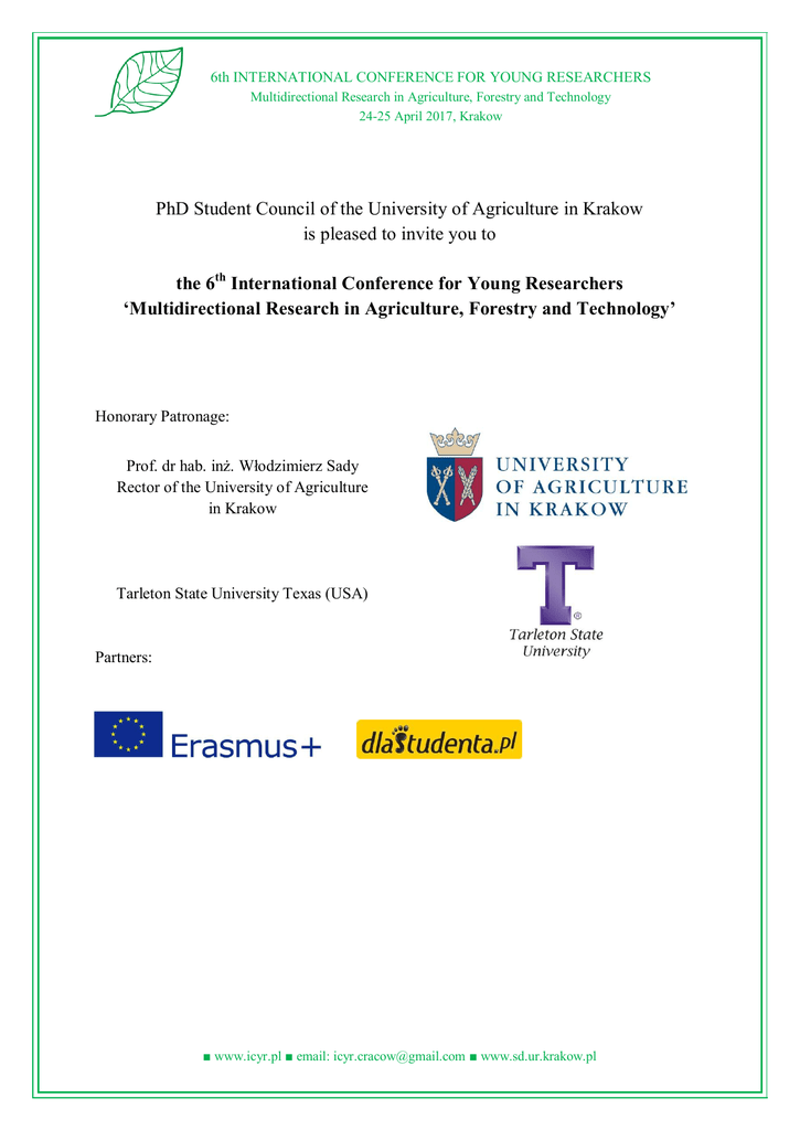 6th INTERNATIONAL CONFERENCE FOR YOUNG RESEARCHERS Multidirectional Research in Agriculture, Forestry and Technology 24-25 April 2017, Krakow PhD Student Council of the University of Agriculture in Krakow is pleased to invite you to the 6th International Conference for Young Researchers ‘Multidirectional Research in Agriculture, Forestry and Technology’ Honorary Patronage: Prof. dr hab. inż. Włodzimierz Sady Rector of the University of Agriculture in Krakow Tarleton State University Texas (USA) Partners: ■ www.icyr.pl ■ email: [email protected] ■ www.sd.ur.krakow.pl 6th INTERNATIONAL CONFERENCE FOR YOUNG RESEARCHERS Multidirectional Research in Agriculture, Forestry and Technology 24-25 April 2017, Krakow WHEN and WHERE: 24 – 25 April 2017 (Monday – Tuesday) Convention Centre of Agricultural University in Krakow (Centrum Kongresowe Uniwersytetu Rolniczego w Krakowie) Address: al. 29 Listopada 46, 31 – 425 Kraków LANGUAGE: English CONFERENCE FEE: 225 zł/ 55 euro Conference fee covers: conference materials, breakfasts on 24 and 25 April, lunches on 24 and 25 April, coffee breaks, tour around Old Town 24 April, integration party with dinner on 24 April. The conference fee does not include the cost of publication. Payments should be made before 10 March 2017. ACCOUNT DETAILS: Uniwersytet Rolniczy w Krakowie Al. Mickiewicza 21 31-120 Kraków Bank BPH PLN: 67 1060 0076 0000 3210 0014 7293 EUR: 23 1060 0076 0000 3210 0019 2899 Transfer title: ICYR_NAME_SURNAME ■ www.icyr.pl ■ email: [email protected] ■ www.sd.ur.krakow.pl 6th INTERNATIONAL CONFERENCE FOR YOUNG RESEARCHERS Multidirectional Research in Agriculture, Forestry and Technology 24-25 April 2017, Krakow ACCOMMODATION: In student dormitories (DS III and DS IV, Al. 29 Listopada 48 in Krakow) Accommodation fee: 25 zł/person/day or 6 euro/person/day Payment on the day of the conference. REGISTRATION: Registration will be open from 9 January 2017 to 10 March 2017. Soon you will be able to access the registration form on the website: www.icyr.pl After registration you will be obliged to send the abstract in English to your section’s coordinator. Please do not register more than once. SECTIONS: 1. Animal science 2. Agricultural economics, agritourism and management 3. Agriculture 4. Surveying, cartography, geodesy, land development, landscape architecture 5. Forest science 6. Food technology 7. Environmental protection and development 8. Horticulture 9. Systems engineering, energy, industry [email protected] icyr.section [email protected] icyr.section [email protected] icyr.section [email protected] icyr.section [email protected] icyr.section [email protected] icyr.section [email protected] icyr.section [email protected] icyr.section [email protected] PUBLICATION: Note: Articles will be published in accordance with the journal guidelines. More information will be given in our next message. ■ www.icyr.pl ■ email: [email protected] ■ www.sd.ur.krakow.pl 6th INTERNATIONAL CONFERENCE FOR YOUNG RESEARCHERS Multidirectional Research in Agriculture, Forestry and Technology 24-25 April 2017, Krakow COMPETITION FOR THE BEST PRESENTATION: Presentations and posters will be assessed by an assessment committee. One presentation and one poster in each section will be awarded a prize for the best poster or the best presentation. Content of the presentation, presenting manner, layout and time management during the presentation will be assessed. (Minor language errors will not affect the assessment). CONTACT: ■ [email protected] ■ e-mail addresses of section coordinators Organizers reserve the right to change a poster into a presentation, or a presentation into a poster. FOR MORE INFORMATION VISIT OUR WEBSITE: www.icyr.pl AND OUR FACEBOOK PROFILE: https://www.facebook.com/MiedzynarodowaKonferencjaDoktorantowWKrakowie ■ www.icyr.pl ■ email: [email protected] ■ www.sd.ur.krakow.pl