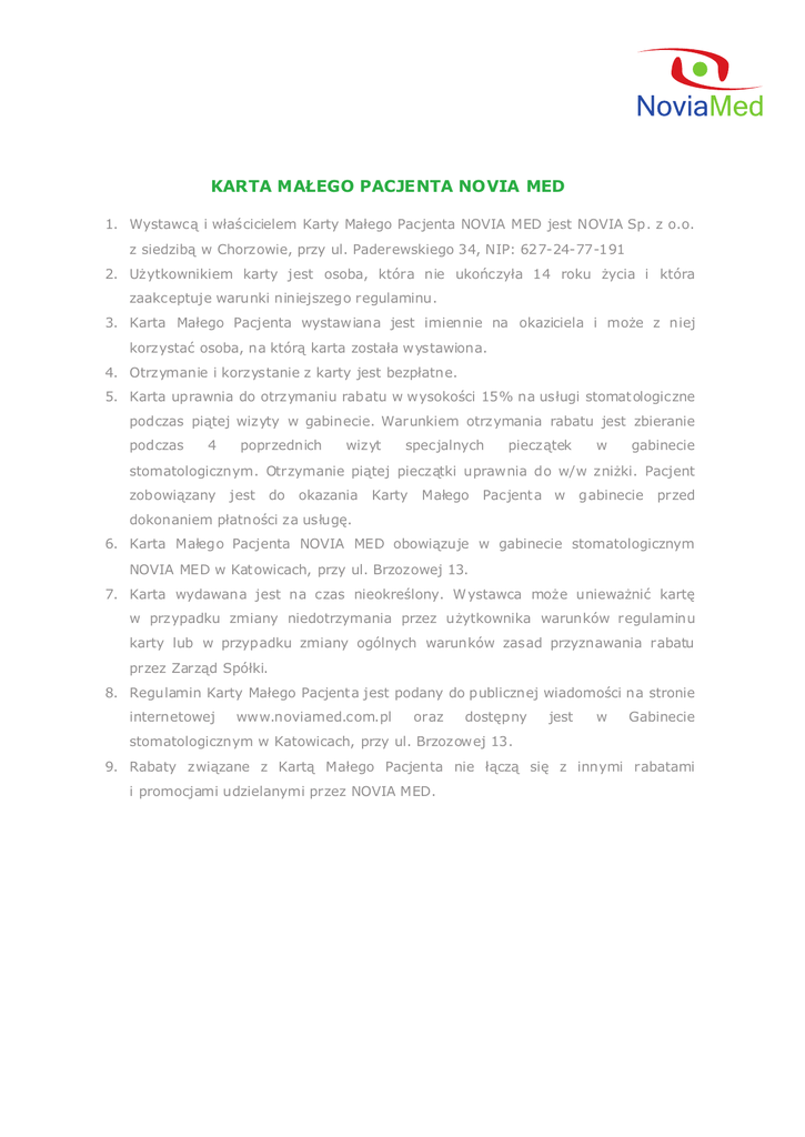 KARTA MA£EGO PACJENTA NOVIA MED 1. Wystawc¹ i w³aœcicielem Karty Ma³ego Pacjenta NOVIA MED jest NOVIA Sp. z o.o. z siedzib¹ w Chorzowie, przy ul. Paderewskiego 34, NIP: 627-24-77-191 2. U¿ytkownikiem karty jest osoba, która nie ukoñczy³a 14 roku ¿ycia i która zaakceptuje warunki niniejszego regulaminu. 3. Karta Ma³ego Pacjenta wystawiana jest imiennie na okaziciela i mo¿e z niej korzystaæ osoba, na któr¹ karta zosta³a wystawiona. 4. Otrzymanie i korzystanie z karty jest bezp³atne. 5. Karta uprawnia do otrzymaniu rabatu w wysokoœci 15% na us³ugi stomat ologiczne podczas pi¹tej wizyty w gabinecie. Warunkiem otrzymania rabatu jest zbieranie podczas 4 poprzednich wizyt specjalnych piecz¹tek w gabinecie stomatologicznym. Otrzymanie pi¹tej piecz¹tki uprawnia do w/w zni¿ki. Pacjent zobowi¹zany jest do okazania Karty Ma³ego Pacjent a w gabinecie przed dokonaniem p³atnoœci za us³ugê. 6. Karta Ma³ego Pacjenta NOVIA MED obowi¹zuje w gabinecie stomatologicznym NOVIA MED w Kat owicach, przy ul. Brzozowej 13. 7. Karta wydawana jest na czas nieokreœlony. W ystawca mo¿e uniewa¿niæ kartê w przypadku zmiany niedotrzymania przez u¿ytkownika warunków regulaminu karty lub w przypadku zmiany ogólnych warunków zasad przyznawania rabatu przez Zarz¹d Spó³ki. 8. Regulamin Karty Ma³ego Pacjent a jest podany do publicznej wiadomoœci na stronie internetowej www.noviamed.com.pl oraz dostêpny jest w Gabinecie stomatologicznym w Katowicach, przy ul. Brzozowej 13. 9. Rabaty zwi¹zane z Kart¹ Ma³ego Pacjenta nie ³¹cz¹ siê z innymi rabatami i promocjami udzielanymi przez NOVIA MED.