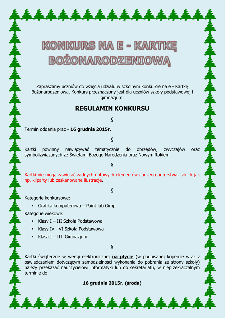 Zapraszamy uczniów do wzięcia udziału w szkolnym konkursie na e - Kartkę Bożonarodzeniową. Konkurs przeznaczony jest dla uczniów szkoły podstawowej i gimnazjum. REGULAMIN KONKURSU § Termin oddania prac - 16 grudnia 2015r. § Kartki powinny nawiązywać tematycznie do obrzędów, zwyczajów symbolizwiązanych ze Świętami Bożego Narodzenia oraz Nowym Rokiem. oraz § Kartki nie mogą zawierać żadnych gotowych elementów cudzego autorstwa, takich jak np. kliparty lub zeskanowane ilustracje. § Kategorie konkursowe: Grafika komputerowa – Paint lub Gimp Kategorie wiekowe: Klasy I – III Szkoła Podstawowa Klasy IV - VI Szkoła Podstawowa Klasa I – III Gimnazjum § Kartki świąteczne w wersji elektronicznej na płycie (w podpisanej kopercie wraz z oświadczaniem dotyczącym samodzielności wykonania do pobrania ze strony szkoły) należy przekazać nauczycielowi informatyki lub do sekretariatu, w nieprzekraczalnym terminie do 16 grudnia 2015r. (środa) § Prace graficzne muszą być wykonane w programie Gimp lub Paint, zapisane w jednym z formatów graficznych: *.gif, *.jpg, *.png lub *.bmp w rozmiarze 560x400 pikseli. 400 560 560 400 lub § Pliki należy nazywać według następujących zasad: małe litery, bez polskich znaków diakrytycznych, bez spacji, według wzorów imie_nazwisko_klasa.jpg, imie_nazwisko_klasa.png itp. § Każdy uczeń może nadesłać jedną pracę. § Wyniki konkursu ogłoszone zostaną na stronie internetowej szkoły www.nowawies.pl. § Kartki będą oceniane przez komisję konkursową, powołaną przez dyrektora szkoły. § Najlepsze prace zostaną wyróżnione i nagrodzone. § Kryteria oceny: 1. Oryginalność, pomysłowość, pracochłonność, estetyka wykonania. 2. Stopień nawiązania do tradycji. 3. Poprawność językowa. § Uwagi końcowe: 1. Przesłanie pracy oznacza akceptację regulaminu. 2. Kartki nadesłane na konkurs przechodzą na własność Organizatorów 3. Organizatorzy zastrzegają sobie prawo dowolnego wykorzystania nadesłanych prac w całości lub części. 4. Organizator zastrzega sobie prawo do interpretacji niniejszego regulaminu. § Konsultacje: Informatyka/Zajęcia komputerowe – p. Anna Pomykała Informatyka/Zajęcia komputerowe – p. Barbara Mrozowska