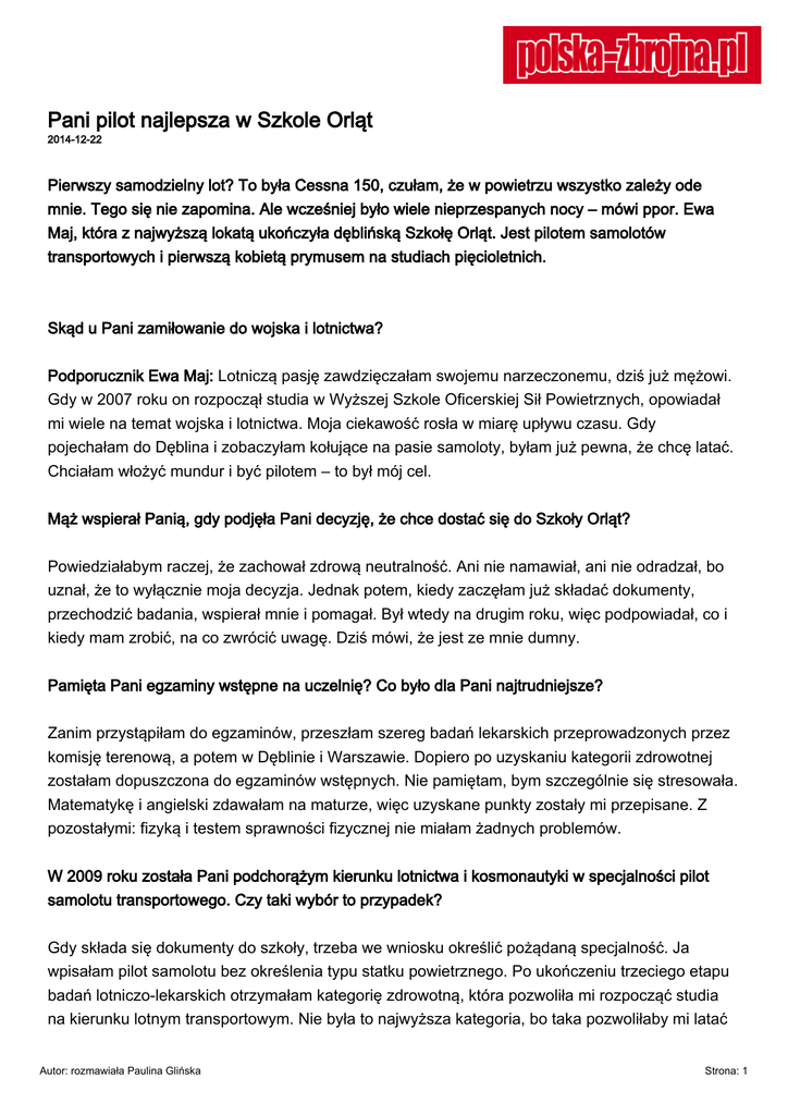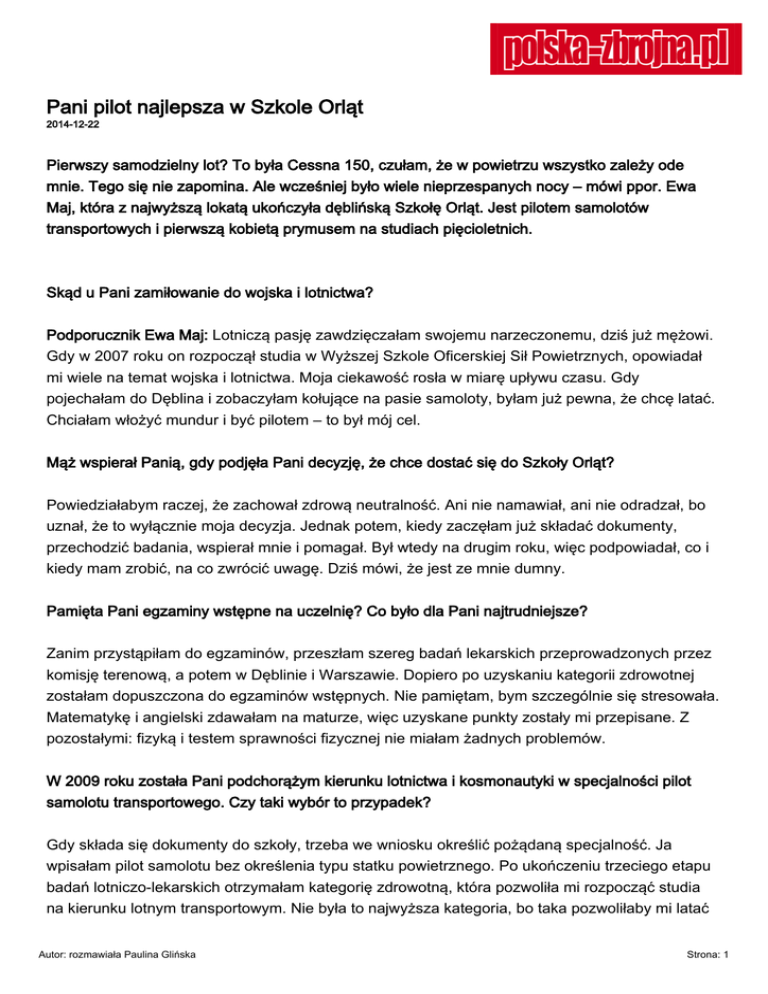 Pani pilot najlepsza w Szkole Orląt 2014-12-22 Pierwszy samodzielny lot? To była Cessna 150, czułam, że w powietrzu wszystko zależy ode mnie. Tego się nie zapomina. Ale wcześniej było wiele nieprzespanych nocy – mówi ppor. Ewa Maj, która z najwyższą lokatą ukończyła dęblińską Szkołę Orląt. Jest pilotem samolotów transportowych i pierwszą kobietą prymusem na studiach pięcioletnich. Skąd u Pani zamiłowanie do wojska i lotnictwa? Podporucznik Ewa Maj: Lotniczą pasję zawdzięczałam swojemu narzeczonemu, dziś już mężowi. Gdy w 2007 roku on rozpoczął studia w Wyższej Szkole Oficerskiej Sił Powietrznych, opowiadał mi wiele na temat wojska i lotnictwa. Moja ciekawość rosła w miarę upływu czasu. Gdy pojechałam do Dęblina i zobaczyłam kołujące na pasie samoloty, byłam już pewna, że chcę latać. Chciałam włożyć mundur i być pilotem – to był mój cel. Mąż wspierał Panią, gdy podjęła Pani decyzję, że chce dostać się do Szkoły Orląt? Powiedziałabym raczej, że zachował zdrową neutralność. Ani nie namawiał, ani nie odradzał, bo uznał, że to wyłącznie moja decyzja. Jednak potem, kiedy zaczęłam już składać dokumenty, przechodzić badania, wspierał mnie i pomagał. Był wtedy na drugim roku, więc podpowiadał, co i kiedy mam zrobić, na co zwrócić uwagę. Dziś mówi, że jest ze mnie dumny. Pamięta Pani egzaminy wstępne na uczelnię? Co było dla Pani najtrudniejsze? Zanim przystąpiłam do egzaminów, przeszłam szereg badań lekarskich przeprowadzonych przez komisję terenową, a potem w Dęblinie i Warszawie. Dopiero po uzyskaniu kategorii zdrowotnej zostałam dopuszczona do egzaminów wstępnych. Nie pamiętam, bym szczególnie się stresowała. Matematykę i angielski zdawałam na maturze, więc uzyskane punkty zostały mi przepisane. Z pozostałymi: fizyką i testem sprawności fizycznej nie miałam żadnych problemów. W 2009 roku została Pani podchorążym kierunku lotnictwa i kosmonautyki w specjalności pilot samolotu transportowego. Czy taki wybór to przypadek? Gdy składa się dokumenty do szkoły, trzeba we wniosku określić pożądaną specjalność. Ja wpisałam pilot samolotu bez określenia typu statku powietrznego. Po ukończeniu trzeciego etapu badań lotniczo-lekarskich otrzymałam kategorię zdrowotną, która pozwoliła mi rozpocząć studia na kierunku lotnym transportowym. Nie była to najwyższa kategoria, bo taka pozwoliłaby mi latać Autor: rozmawiała Paulina Glińska Strona: 1 na odrzutowcach. Studia w Szkole Orląt to wyzwanie? Na pewno nie były łatwe. Ogrom materiału do opanowania, nieprzespane noce, godziny spędzone nad książkami, w salach wykładowych, ćwiczenia na symulatorach... Szkoliłam się w tak zwanym systemie mieszanym, co w praktyce oznaczało, że kilka miesięcy uczyliśmy się teorii, a potem, w okresie letnim mieliśmy praktyki lotnicze. Myślę, że do końca zachowałam entuzjazm i zapał do nauki. To było dla mnie nie tylko pewnego rodzaju wyzwanie, ale także prawdziwa przyjemność. Z perspektywy czasu oceniam też, że była to niesamowita, pięcioletnia lekcja wytrwałości, hartowania odporności psychicznej i charakteru. Nie zdarzyły się Pani chwile słabości, zwątpienia? W czasie szkolenia teoretycznego nie miałam wątpliwości, że wybrałam właściwą drogę. Natomiast podczas lotów, zwłaszcza wtedy, gdy nie wszystko szło po mojej myśli, zdarzało się niekiedy, że zastanawiałam się, czy na pewno podołam, czy posiadam odpowiednie predyspozycje. Moja motywacja była jednak na tyle duża, że te chwile szybko mijały. A pamięta Pani swój pierwszy samodzielny lot? Tego się nie zapomina. Leciałam wtedy Cessną 150, a jedyne co czułam, to przeświadczenie, że w powietrzu jestem całkiem sama i wszystko zależy wyłącznie ode mnie. Mój lot odbył się na szczęście bez problemów. Już po wylądowaniu byłam szczęśliwa i dumna. Ale byłam też do tego lotu długo przygotowywana. To podstawowy warunek, by móc samodzielnie wzbić się w powietrze. Pięcioletni wysiłek się opłacił. Została Pani nie tylko prymuską 118. promocji, ale też pierwszą kobietą w historii szkoły, która pięcioletnie studia ukończyła z pierwszą lokatą. Myślę, że to głównie dzięki mojej pracy i ogromnej chęci latania. Cieszę się, że zostało to docenione. Promocja była dla mnie ważnym dniem, pewnym podsumowaniem w życiu, ale też początkiem czegoś nowego. Osiągnęłam swój cel i zostałam wojskowym pilotem. Wierzę, że sobie poradzę i że nie zabraknie mi chęci i zapału do rozwijania umiejętności. Kobiety coraz częściej zostają pilotami – mamy kobiety na samolotach MiG-29, na Su-22, Pani będzie latała na Bryzie. Czy kruszy się stereotyp dotyczący służby kobiet w armii? Autor: rozmawiała Paulina Glińska Strona: 2 Mam pełną świadomość, że zaczynam pracę w nietypowym dla kobiet zawodzie, w świecie zdominowanym przez mężczyzn. Stereotypy jednak były i będą. Ale sądzę, że nie ma co tak bardzo przejmować się nimi. Uważam, że w zawodzie pilota nie ma znaczenia, kto siedzi za sterami samolotu. Tu nie liczy się siła. O byciu dobrym pilotem decydują zdolności psychofizyczne, motoryczne, intelektualne, a przede wszystkim chęci do latania. Dotychczasowe osiągnięcia kobiet w armii pokazują, że jesteśmy ambitne, świetnie przygotowane do wykonywania obowiązków i że zawód żołnierza czy wojskowego pilota nie jest już zarezerwowany wyłącznie dla mężczyzn. Jaki wojskowy samolot lubi Pani najbardziej? Ponad 150 godzin spędziłam w powietrzu, latając na: Cessnie 150, An 2 „Antku” oraz M-28 Bryzie. Nie miałam jeszcze zbyt wiele okazji do porównań, na pewno na zawsze pozostanie mi sentyment do „Antka”, na którym rozpoczynałam swoją przygodę (samolot został wycofany z polskiej armii w grudniu 2012 r. – przyp. red). Lubię też Bryzę. Jako pilot samolotu transpor