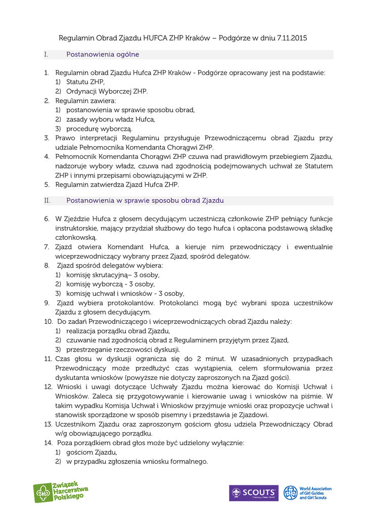 Regulamin Obrad Zjazdu HUFCA ZHP Kraków – Podgórze w dniu 7.11.2015 I. Postanowienia ogólne 1. Regulamin obrad Zjazdu Hufca ZHP Kraków - Podgórze opracowany jest na podstawie: 1) Statutu ZHP, 2) Ordynacji Wyborczej ZHP. 2. Regulamin zawiera: 1) postanowienia w sprawie sposobu obrad, 2) zasady wyboru władz Hufca, 3) procedurę wyborczą. 3. Prawo interpretacji Regulaminu przysługuje Przewodniczącemu obrad Zjazdu przy udziale Pełnomocnika Komendanta Chorągwi ZHP. 4. Pełnomocnik Komendanta Chorągwi ZHP czuwa nad prawidłowym przebiegiem Zjazdu, nadzoruje wybory władz, czuwa nad zgodnością podejmowanych uchwał ze Statutem ZHP i innymi przepisami obowiązującymi w ZHP. 5. Regulamin zatwierdza Zjazd Hufca ZHP. II. Postanowienia w sprawie sposobu obrad Zjazdu 6. W Zjeździe Hufca z głosem decydującym uczestniczą członkowie ZHP pełniący funkcje instruktorskie, mający przydział służbowy do tego hufca i opłacona podstawową składkę członkowską. 7. Zjazd otwiera Komendant Hufca, a kieruje nim przewodniczący i ewentualnie wiceprzewodniczący wybrany przez Zjazd, spośród delegatów. 8. Zjazd spośród delegatów wybiera: 1) komisję skrutacyjną– 3 osoby, 2) komisję wyborczą - 3 osoby, 3) komisję uchwał i wniosków - 3 osoby, 9. Zjazd wybiera protokolantów. Protokolanci mogą być wybrani spoza uczestników Zjazdu z głosem decydującym. 10. Do zadań Przewodniczącego i wiceprzewodniczących obrad Zjazdu należy: 1) realizacja porządku obrad Zjazdu, 2) czuwanie nad zgodnością obrad z Regulaminem przyjętym przez Zjazd, 3) przestrzeganie rzeczowości dyskusji. 11. Czas głosu w dyskusji ogranicza się do 2 minut. W uzasadnionych przypadkach Przewodniczący może przedłużyć czas wystąpienia, celem sformułowania przez dyskutanta wniosków (powyższe nie dotyczy zaproszonych na Zjazd gości). 12. Wnioski i uwagi dotyczące Uchwały Zjazdu można kierować do Komisji Uchwał i Wniosków. Zaleca się przygotowywanie i kierowanie uwag i wniosków na piśmie. W takim wypadku Komisja Uchwał i Wniosków przyjmuje wnioski oraz propozycje uchwał i stanowisk sporządzone w sposób pisemny i przedstawia je Zjazdowi. 13. Uczestnikom Zjazdu oraz zaproszonym gościom głosu udziela Przewodniczący Obrad w/g obowiązującego porządku. 14. Poza porządkiem obrad głos może być udzielony wyłącznie: 1) gościom Zjazdu, 2) w przypadku zgłoszenia wniosku formalnego. Regulamin Obrad Zjazdu Hufca ZHP 15. Wniosek formalny – propozycja wysunięta w trakcie obrad zjazdu dotycząca kwestii związanych z procedurą obrad. W przypadku zgłoszenia wniosku formalnego dopuszcza się dodatkowo 1 głos „za” i 2 głosy „przeciw” wnioskowi. 16. Czas powtórnego wystąpienia nie może być dłuższy niż 2 minuty. 17. Uchwały Zjazdu Hufca są ważne bez względu na liczbę obecnych osób uprawnionych do głosowania (przy obliczaniu zwykłej większości głosów uwzględnia się tylko głosy oddane za i przeciw uchwale). III. Procedura wyborcza 18. Za wybranych do władz uważa się tych kandydatów, którzy otrzymali kolejno największą liczbę głosów i więcej niż połowę ważnie oddanych głosów. Wybory są prawomocne bez względu na liczbę uprawnionych obecnych na zjeździe, o ile zostały zachowane warunki określone w Ordynacji wyborczej ZHP. 19. Uczestnicy Zjazdu z głosem decydującym zgłaszają kandydatury na członków odpowiednich władz ZHP do Komisji Skrutacyjnej Zjazdu. Podstawą opracowania list kandydatów są zgłoszenia, wraz z pisemną zgodą osób kandydujących i pisemnym oświadczeniem o niekaralności, które należy złożyć bezpośrednio do Komisji Wyborczej. 20. Komisja Wyborcza sprawdza, czy zgłoszone osoby mają bierne prawo wyborcze w wyborach do określonych władz ZHP, a następnie przedstawia Zjazdowi, w porządku alfabetycznym wszystkie zgłoszone kandydatury, odczytując ich krótkie charakterystyki. 21. Kandydatami w wyborach mogą być osoby nieobecne, o ile wyraziły pisemną zgodę na kandydowanie i mają bierne prawo wyborcze. 22. Każdy kandydat ma prawo wypowiedzi. Uczestnicy Zjazdu mogą zadawać każdemu kandydatowi pytania. Pytania i wypowiedzi nieistotne bądź godzące w dobra osobiste lub w sposób, nieuzasadniony naruszające prywatność kandydata uchyla Przewodniczący obrad. 23. Wybory do władz odbywają się w sposób tajny, o ile uprawnieni do głosowania nie zdecydują jednogłośnie inaczej. 24. Karty do głosowania zawierające w porządku alfabetycznym: nazwisko, imię, stopień instruktorski, przygotowuje Komisja Skrutacyjna. Następnie opieczętowuje karty pieczątką okrągłą lub pieczątką komendy hufca. 25. Głosowanie polega na postawieniu na karcie do głosowania znaku „x” w kratce z lewej strony obok nazwiska kandydata, na którego się głosuje, w liczbie nie większej niż liczba mandatów w danej władzy. Niepostawienie znaku „x” w kratce przy nazwisku kandydata uważa się za głos przeciwko. Postawienie znaku „x” przy większej liczbie nazwisk niż liczba mandatów lub postawienie innego znaku uważa się za głos nieważny. 26. W przypadku głosowania tajnego uprawnieni do głosowania wrzucają karty do urny wyborczej. 27. Za wybranych do władz uważa się tych kandydatów, którzy otrzymali kolejno największą liczbę głosów i więcej niż połowę ważnie oddanych głosów. 28. W razie braku rozstrzygnięcia wyboru z powodu uzyskania przez kilku kandydatów takiej samej liczby głosów, więcej jednak niż połowy ważnie oddanych głosów, przeprowadza się głosowanie uzupełniające na tych kandydatów, w którym o wyborze decyduje zwykła większość głosów. Regulamin Obrad Zjazdu Hufca ZHP 29. Jeżeli liczba osób wybranych na zasadach określonych w pkt. 27 jest mniejsza niż liczba osób wybieranych w skład danej władzy, przeprowadza się wybory dodatkowe. 30. W wyborach dodatkowych, w kolejnych głosowaniach biorą udział tylko kandydaci zgłoszeni do p
