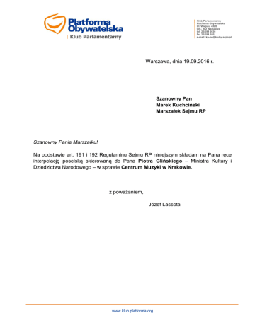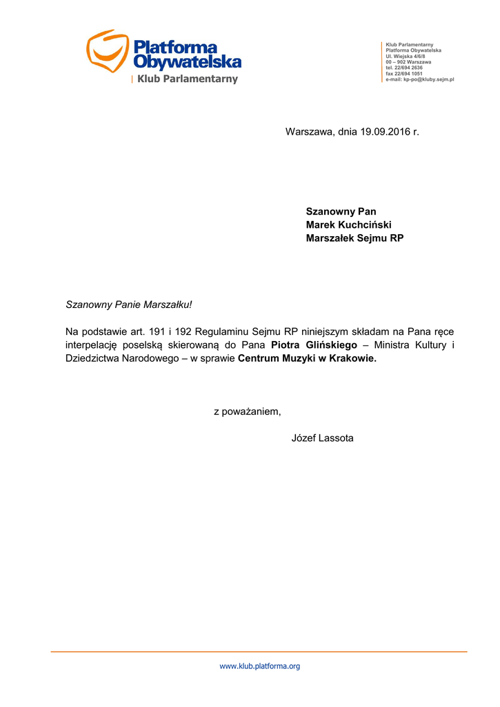 Interpelacja posła Józefa Lassoty w sprawie Centrum Muzyki w