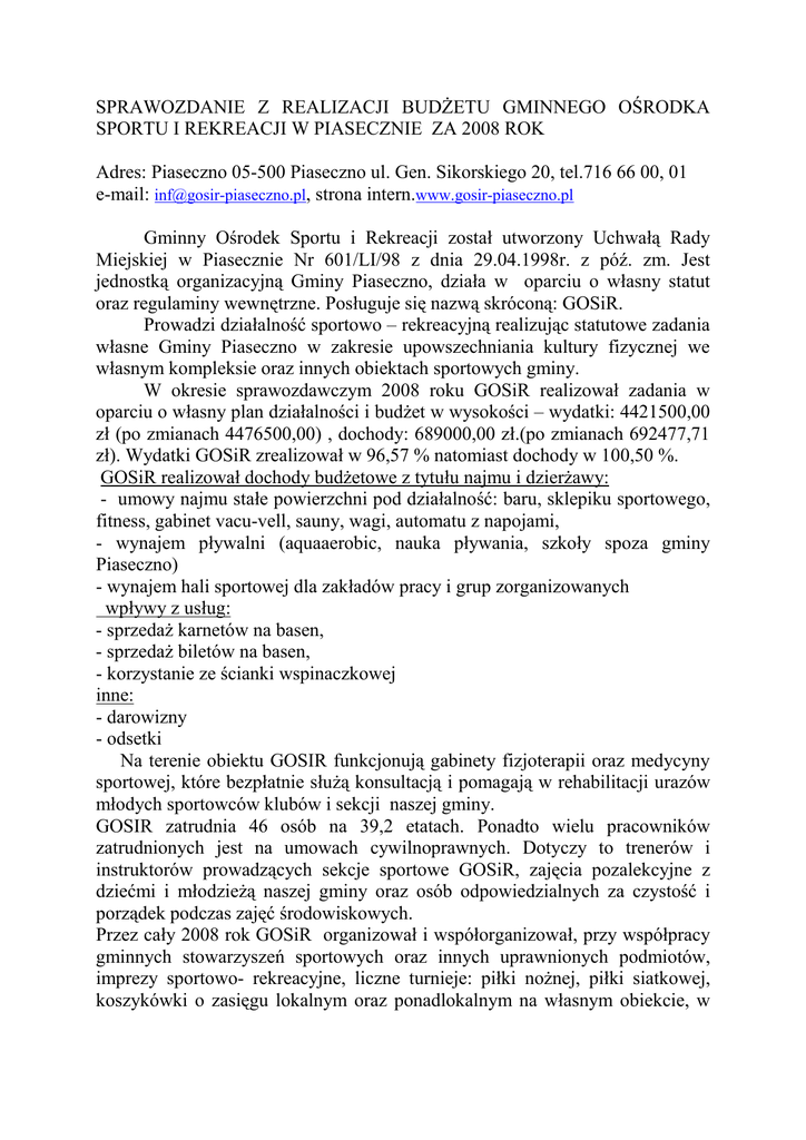SPRAWOZDANIE Z REALIZACJI BUDśETU GMINNEGO OŚRODKA SPORTU I REKREACJI W PIASECZNIE ZA 2008 ROK Adres: Piaseczno 05-500 Piaseczno ul. Gen. Sikorskiego 20, tel.716 66 00, 01 e-mail: [email protected], strona intern.www.gosir-piaseczno.pl Gminny Ośrodek Sportu i Rekreacji został utworzony Uchwałą Rady Miejskiej w Piasecznie Nr 601/LI/98 z dnia 29.04.1998r. z póź. zm. Jest jednostką organizacyjną Gminy Piaseczno, działa w oparciu o własny statut oraz regulaminy wewnętrzne. Posługuje się nazwą skróconą: GOSiR. Prowadzi działalność sportowo – rekreacyjną realizując statutowe zadania własne Gminy Piaseczno w zakresie upowszechniania kultury fizycznej we własnym kompleksie oraz innych obiektach sportowych gminy. W okresie sprawozdawczym 2008 roku GOSiR realizował zadania w oparciu o własny plan działalności i budŜet w wysokości – wydatki: 4421500,00 zł (po zmianach 4476500,00) , dochody: 689000,00 zł.(po zmianach 692477,71 zł). Wydatki GOSiR zrealizował w 96,57 % natomiast dochody w 100,50 %. GOSiR realizował dochody budŜetowe z tytułu najmu i dzierŜawy: - umowy najmu stałe powierzchni pod działalność: baru, sklepiku sportowego, fitness, gabinet vacu-vell, sauny, wagi, automatu z napojami, - wynajem pływalni (aquaaerobic, nauka pływania, szkoły spoza gminy Piaseczno) - wynajem hali sportowej dla zakładów pracy i grup zorganizowanych wpływy z usług: - sprzedaŜ karnetów na basen, - sprzedaŜ biletów na basen, - korzystanie ze ścianki wspinaczkowej inne: - darowizny - odsetki Na terenie obiektu GOSIR funkcjonują gabinety fizjoterapii oraz medycyny sportowej, które bezpłatnie słuŜą konsultacją i pomagają w rehabilitacji urazów młodych sportowców klubów i sekcji naszej gminy. GOSIR zatrudnia 46 osób na 39,2 etatach. Ponadto wielu pracowników zatrudnionych jest na umowach cywilnoprawnych. Dotyczy to trenerów i instruktorów prowadzących sekcje sportowe GOSiR, zajęcia pozalekcyjne z dziećmi i młodzieŜą naszej gminy oraz osób odpowiedzialnych za czystość i porządek podczas zajęć środowiskowych. Przez cały 2008 rok GOSiR organizował i współorganizował, przy współpracy gminnych stowarzyszeń sportowych oraz innych uprawnionych podmiotów, imprezy sportowo- rekreacyjne, liczne turnieje: piłki noŜnej, piłki siatkowej, koszykówki o zasięgu lokalnym oraz ponadlokalnym na własnym obiekcie, w gminnych (szkolnych) halach sportowych, obiektach sportowych KS Piaseczno a takŜe na terenach otwartych. W okresie jesienno-zimowym dla zawodników gminnych klubów sportowych zabezpieczaliśmy w szkolnych halach sportowych zajęcia treningowe przygotowujące do sezonu wiosennego. Przez cały rok organizowaliśmy stałe zajęcia pozalekcyjne dla dzieci i młodzieŜy w róŜnych kategorii wiekowych ( w piłce noŜnej, koszykówce, siatkówce, tenisie stołowym i lekkoatletyce) w halach sportowych: GOSiR, Szkoły Podstawowej nr5, Gimnazjum nr4 (Gołków), Gimnazjum w Zalesiu Górnym, Szkoły Podstawowej w Zalesiu Dolnym oraz na obiektach sportowych w Józefosławiu i Woli Gołkowskiej. Rok szkolny to takŜe czas organizacji zawodów sportowych (gminnych i powiatowych) szkół gminnych w ramach Igrzysk MłodzieŜy Szkolnej Województwa Mazowieckiego w takich dyscyplinach jak: piłka noŜna, koszykówka, piłka ręczna, piłka siatkowa, unihokej, tenis stołowy, pływanie, dwubój sportowy, ringo, biegi przełajowe. Zawody współorganizowane i nadzorowane są przez Szkolny Związek Sportowy na podstawie porozumienia o współpracy. GOSiR wspólnie z MOZTS organizował zawody tenisowe: III Wojewódzki Turniej Kwalifikacyjny do Mistrzostw Polski oraz Mistrzostwa Mazowsza śaków. W godz. 08.00-17.00 z hali sportowej korzystają uczniowie Gimnazjum nr1 na zajęcia wychowania fizycznego. W godz. 17.00-20.00 na hali odbywają się zajęcia oraz mecze sekcji tenisa stołowego GOSiR, zajęcia pozalekcyjne koszykówki młodzieŜowej oraz środowiskowe zajęcia dla grup naborowych dzieci w piłce noŜnej (rocznik 1999,2000 i 2001). Od godz. 20.00 hala wykorzystywana jest komercyjnie na rekreację przez firmy i grupy zorganizowane z zewnątrz. GOSiR, na podstawie umowy ze Szkołą Podstawową Nr5, administruje jej halą sportową w dni szkolne w godz. 19.00-23.00 oraz w soboty-niedziele w godz. 08.00-20.00. Generalnie z sali korzystają zespoły koszykarskie KS Piaseczno (na podstawie odrębnej umowy z GOSiR) i sekcje GOSiR, które tam trenują oraz rozgrywają mecze w ramach rozgrywek ligowych w swoich rocznikach. Z sali korzystają takŜe lekkoatleci naszej gminy na treningi w okresie jesiennozimowym. W okresie ferii i wakacji dla młodzieŜy szkół naszej gminy organizowaliśmy zajęcia na hali i pływalni na sportowo: „Lato w mieście”, „Zima w mieście”, gdzie młodzieŜ mogła zagospodarować swój wolny czas. W ramach tych akcji w bezpłatnych zajęciach nauki i doskonalenia uczestniczyło 60 dzieci. Wiele imprez sportowych organizowanych przez GOSiR odbyło się w terenie otwartym: na stadionie KS Piaseczno (turnieje piłki noŜnej) oraz na terenie w okolicach zalewu w Zalesiu Dolnym (biegi przełajowe, zawody w kolarstwie przełajowym). Do najwaŜniejszych wpisanych juŜ na stałe do kalendarza naleŜą: Piaseczyńska Mila Konstytucyjna (z okazji rocznicy uchwalenia Konstytucji 3 Maja- bieg na 1milę), Memoriał L. Abramowicza (turniej piłkarski dla roczników 1994 i 1995). WaŜnym wydarzeniem w szkolnym sporcie młodzieŜowym była organizacja letnich gminnych olimpiad młodzieŜy szkolnej dla szkół podstawowych i gimnazjalnych, które na stałe weszły do kalendarza gminnych imprez sportowych. W 2008 roku GOSiR po raz drugi zorganizował mini mistrzostwa gminy w wieloboju sportowym dla dzieci z przedszkoli publicznych Dorośli teŜ znajdują coś dla siebie. Regularnie organizujemy turnieje Grand Prix Piaseczna amatorów w tenisie stołowym (6 turniejów), turnieje amatorów w piłce noŜnej (m.in. tradycyjny turni