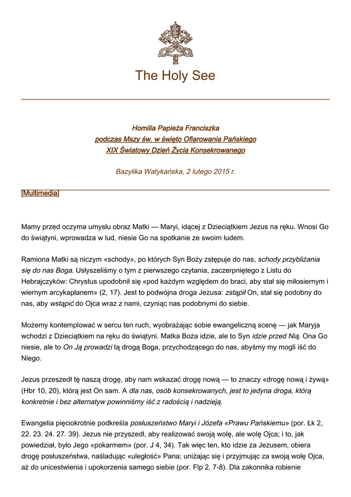 The Holy See Homilia Papieża Franciszka podczas Mszy św. w święto Ofiarowania Pańskiego XIX Światowy Dzień Życia Konsekrowanego Bazylika Watykańska, 2 lutego 2015 r. [Multimedia] Mamy przed oczyma umysłu obraz Matki — Maryi, idącej z Dzieciątkiem Jezus na ręku. Wnosi Go do świątyni, wprowadza w lud, niesie Go na spotkanie ze swoim ludem. Ramiona Matki są niczym «schody», po których Syn Boży zstępuje do nas, schody przybliżania się do nas Boga. Usłyszeliśmy o tym z pierwszego czytania, zaczerpniętego z Listu do Hebrajczyków: Chrystus upodobnił się «pod każdym względem do braci, aby stał się miłosiernym i wiernym arcykapłanem» (2, 17). Jest to podwójna droga Jezusa: zstąpił On, stał się podobny do nas, aby wstąpić do Ojca wraz z nami, czyniąc nas podobnymi do siebie. Możemy kontemplować w sercu ten ruch, wyobrażając sobie ewangeliczną scenę — jak Maryja wchodzi z Dzieciątkiem na ręku do świątyni. Matka Boża idzie, ale to Syn idzie przed Nią. Ona Go niesie, ale to On Ją prowadzi tą drogą Boga, przychodzącego do nas, abyśmy my mogli iść do Niego. Jezus przeszedł tę naszą drogę, aby nam wskazać drogę nową — to znaczy «drogę nową i żywą» (Hbr 10, 20), którą jest On sam. A dla nas, osób konsekrowanych, jest to jedyna droga, którą konkretnie i bez alternatyw powinniśmy iść z radością i nadzieją. Ewangelia pięciokrotnie podkreśla posłuszeństwo Maryi i Józefa «Prawu Pańskiemu» (por. Łk 2, 22. 23. 24. 27. 39). Jezus nie przyszedł, aby realizować swoją wolę, ale wolę Ojca; i to, jak powiedział, było Jego «pokarmem» (por. J 4, 34). Tak więc ten, kto idzie za Jezusem, obiera drogę posłuszeństwa, naśladując «uległość» Pana; uniżając się i przyjmując za swoją wolę Ojca, aż do unicestwienia i upokorzenia samego siebie (por. Flp 2, 7-8). Dla zakonnika robienie 2 postępów oznacza uniżanie się w posłudze, to znaczy pójście tą samą drogą, którą szedł Jezus, który «nie skorzystał ze sposobności, aby na równi być z Bogiem» (Flp 2, 6). Uniżać się, stając się sługą, aby służyć. Ta droga przybiera formę reguły, naznaczonej charyzmatem założyciela, nie należy jednak zapominać, że niezastąpioną regułą dla wszystkich jest zawsze Ewangelia. Ale Duch Święty w swej nieskończonej kreatywności przekłada ją także na różne reguły życia konsekrowanego, które rodzą się wszystkie z pójścia za Chrystusem, to znaczy z tej drogi uniżania się w służbie. Dzięki temu «prawu» osoby konsekrowane mogą osiągnąć mądrość, która nie jest jakąś abstrakcyjną postawą, lecz jest dziełem i darem Ducha Świętego. A wyraźnym znakiem tej mądrości jest radość. Tak, ewangeliczna radość zakonnika jest konsekwencją tej drogi uniżania się z Jezusem... A kiedy jesteśmy smutni, warto, byśmy się zastanowili: «Jak przeżywamy ten wymiar kenotyczny?». W opisie ofiarowania Jezusa w świątyni mądrość reprezentuje dwoje starców, Symeon i Anna — osoby posłuszne Duchowi Świętemu (wspomina się o Nim trzykrotnie), przez Niego prowadzone, przez Niego inspirowane. Pan obdarzył ich mądrością dzięki długiej wędrówce drogą posłuszeństwa Jego Prawu. Posłuszeństwa, które z jednej strony upokarza i unicestwia, ale z drugiej — rozpala nadzieję i jej strzeże, czyniąc ich twórczymi, ponieważ byli pełni Ducha Świętego. Sprawują oni również wokół Dzieciątka wchodzącego do świątyni swego rodzaju liturgię: Symeon wielbi Pana, a Anna «głosi» zbawienie (por. Łk 2, 28-32. 38). Podobnie jak w przypadku Maryi, również starzec Symeon bierze Dziecko na ręce, ale w rzeczywistości to Dziecko go ujmuje i prowadzi. Liturgia Pierwszych Nieszporów dzisiejszego święta wyraża to w sposób jasny i piękny: «Senex puerum portabat, puer autem senem regebat» [Starzec niósł Dziecię, Ono zaś starca prowadziło]. Zarówno Maryja, młoda matka, jak i Symeon, starzec, «dziadek», niosą Dzieciątko na ręku, ale to Dzieciątko ich oboje prowadzi. Warto zwrócić uwagę, że w tym wydarzeniu kreatywni nie są młodzi, ale starcy: ludzie młodzi, jak Maryja i Józef, postępują według Prawa Pana, drogą posłuszeństwa; starcy, Symeon i Anna, widzą w Dzieciątku wypełnienie Prawa i obietnic Boga. I potrafią świętować: są twórczy w radości, w mądrości. Jednak Pan przemienia posłuszeństwo w mądrość, przez działanie swojego Ducha Świętego. Niekiedy Bóg może obdarzyć darem mądrości także człowieka młodego, niedoświadczonego, wystarczy, że będzie gotowy pójść drogą posłuszeństwa i uległości Duchowi. To posłuszeństwo i ta uległość nie są czymś teoretycznym, lecz podlegają logice wcielenia Słowa: uległość i posłuszeństwo założycielowi, uległość i posłuszeństwo wobec konkretnej reguły, uległość i posłuszeństwo przełożonemu, uległość i posłuszeństwo Kościołowi. Chodzi o uległość i posłuszeństwo konkretne. 3 Gdy wytrwale podąża się drogą posłuszeństwa, dojrzewa mądrość osobista i wspólnotowa, i w ten sposób staje się możliwe także dostosowanie reguł do czasów: prawdziwe dostosowanie do wymogów danej epoki jest bowiem dziełem mądrości, powstającym w uległości i posłuszeństwie. Ożywienie i odnawianie życia konsekrowanego dokonuje się dzięki wielkiemu umiłowaniu reguły, a także dzięki zdolności do kontemplacji i słuchania starszych w zgromadzeniu. W ten sposób «depozyt», charyzmat każdej rodziny zakonnej jest strzeżony zarówno przez posłuszeństwo, jak i przez mądrość. Dzięki temu pielgrzymowaniu jesteśmy ustrzeżeni od przeżywania naszej konsekracji w sposób light, w sposób odcieleśniony, jakby to była jakaś gnoza, która sprowadzałaby życie zakonne do jakiejś «karykatury», karykatury, w której praktykuje się pójście za Jezusem bez wyrzeczenia, modlitwę bez spotkania, życie braterskie bez je
